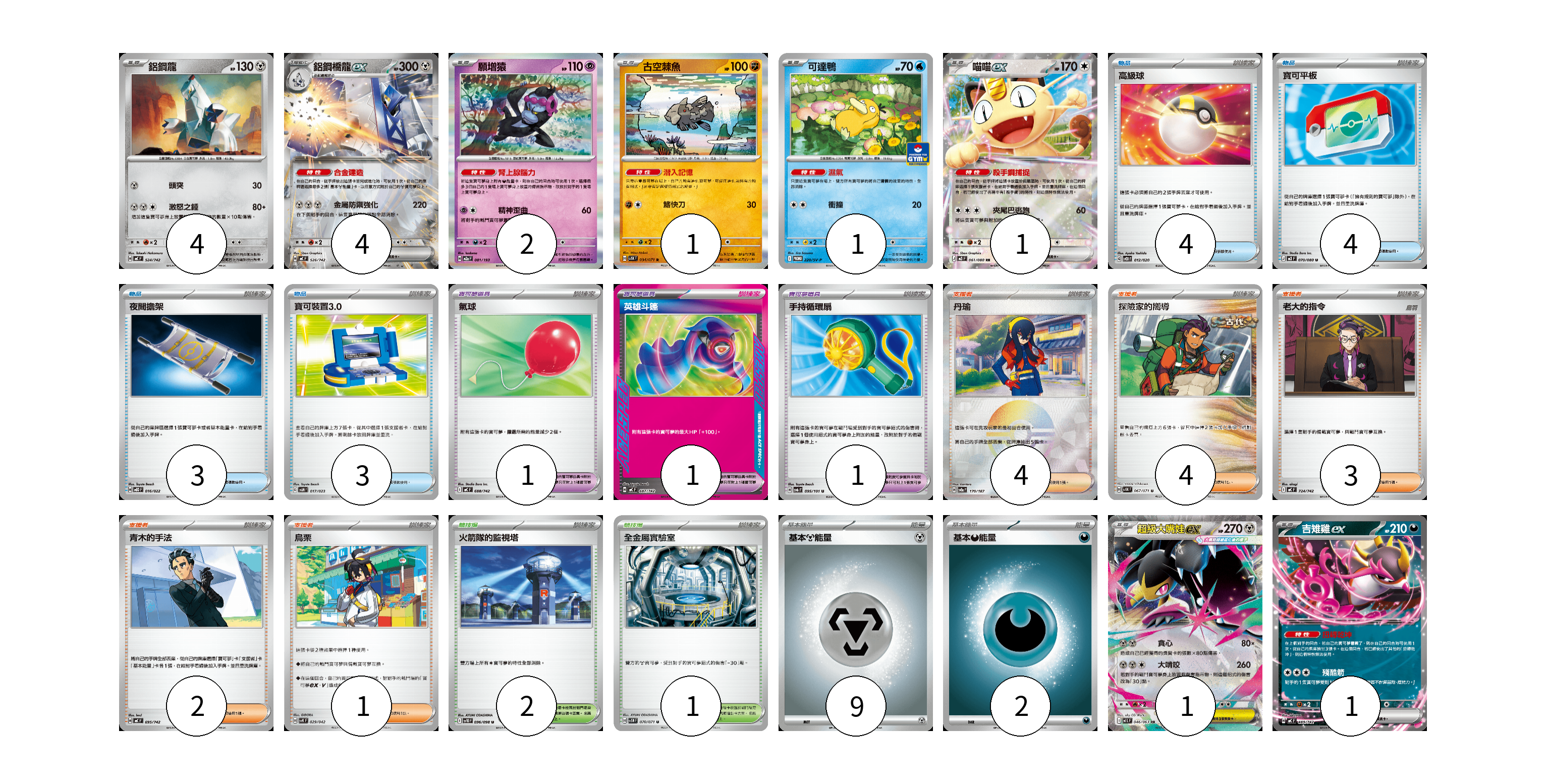 牌組構築方案 以此牌組為基礎新構築牌組 顯示卡面 顯示列表 寶可夢卡(15) 4 4 2 1 1 1 1 1 寶可夢道具(3) 1 1 1 物品卡(14) 4 4 3 3 支援者卡(14) 4 4 3 2 1 競技場卡(3) 2 1 能量卡(11) 9 2 寶可夢卡(15) 卡牌名稱 張數 卡牌名稱 張數 鋁鋼龍 MC 524/742 04 鋁鋼橋龍ex MC 526/742 04 願增猿 M2a 081/193 02 古空棘魚 SV5K 034/071 01 可達鴨 SV-P 220/SV-P 01 喵喵ex M3 061/080 01 超級大嘴娃ex M1L 046/063 01 吉雉雞ex MC 489/742 01 寶可夢道具(3) 卡牌名稱 張數 卡牌名稱 張數 氣球 MC 688/742 01 英雄斗篷 MC 687/742 01 手持循環扇 SV6 095/101 01 物品卡(14) 卡牌名稱 張數 卡牌名稱 張數 高級球 SVOD 012/020 04 寶可平板 M3 070/080 04 夜間擔架 MBD 016/022 03 寶可裝置3.0 SVAM 017/023 03 支援者卡(14) 卡牌名稱 張數 卡牌名稱 張數 丹瑜 SV8a 170/187 04 探險家的嚮導 SV5K 067/071 04 老大的指令 MC 724/742 03 青木的手法 MC 695/742 02 烏栗 SVK 029/042 01 競技場卡(3) 卡牌名稱 張數 卡牌名稱 張數 火箭隊的監視塔 SV10 096/098 02 全金屬實驗室 SV5M 070/071 01 能量卡(11) 卡牌名稱 張數 卡牌名稱 張數 基本【鋼】能量 MC MET 09 基本【惡】能量 MC DAR 02 以此牌組為基礎新構築牌組 牌組編碼 nsLiGF-HsuEba-VZYtWf copy 列印牌組單 牌組編碼已複製 分享至SNS