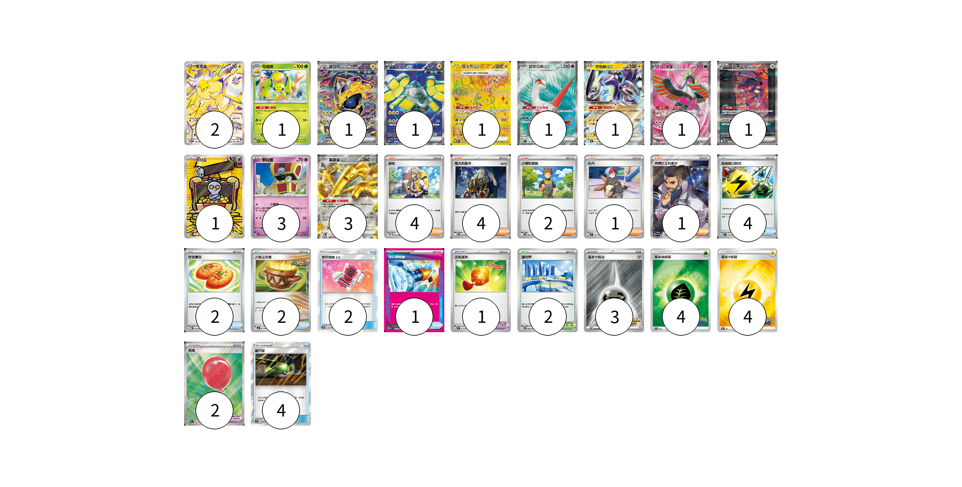 牌組構築方案 以此牌組為基礎新構築牌組 顯示卡面 顯示列表 寶可夢卡(17) 2 1 1 1 1 1 1 1 1 1 3 3 寶可夢道具(3) 1 2 物品卡(15) 4 2 2 2 1 4 支援者卡(12) 4 4 2 1 1 競技場卡(2) 2 能量卡(11) 3 4 4 寶可夢卡(17) 卡牌名稱 張數 卡牌名稱 張數 電電蟲 SV7 108/102 02 電蜘蛛 SV6a 002/064 01 鐵臂膀ex SV8a 210/187 01 鐵臂膀ex SV4M 079/066 01 皮卡丘ex SV8a 236/187 01 拉帝亞斯ex SV7a 078/064 01 密勒頓ex SV4a 071/190 01 吉雉雞ex SV6a 081/064 01 蓋諾賽克特ex SV11B 172/086 01 索財靈 SV3a 068/062 01 索財靈 SV7a 024/064 03 賽富豪ex SV8a 117/187 03 寶可夢道具(3) 卡牌名稱 張數 卡牌名稱 張數 勇氣護符 SV2D 067/071 01 氣球 M1L 084/063 02 物品卡(15) 卡牌名稱 張數 卡牌名稱 張數 超級能量回收 SVK 010/042 04 好友寶芬 MBG 011/022 02 大地之容器 SV4K 060/066 02 寶可齒輪3.0 AS6b 190/194 02 頂尖捕捉器 MBG 014/022 01 巢穴球 AS5a 178/184 04 支援者卡(12) 卡牌名稱 張數 卡牌名稱 張數 派帕 SVOD 018/020 04 老大的指令 MBD 020/022 04 小剛的發掘 SV9 096/100 02 牡丹 SV1S 077/078 01 弗圖博士的劇本 SV4M 086/066 01 競技場卡(2) 卡牌名稱 張數 卡牌名稱 張數 釀光市 SV9 098/100 02 能量卡(11) 卡牌名稱 張數 卡牌名稱 張數 基本【鋼】能量 SV-P 264/SV-P 03 基本草能量 S10b GRA 04 基本雷能量 S10b LIG 04 以此牌組為基礎新構築牌組 牌組編碼 nuXyTh-mWtlux-honBMF copy 列印牌組單 牌組編碼已複製 分享至SNS
