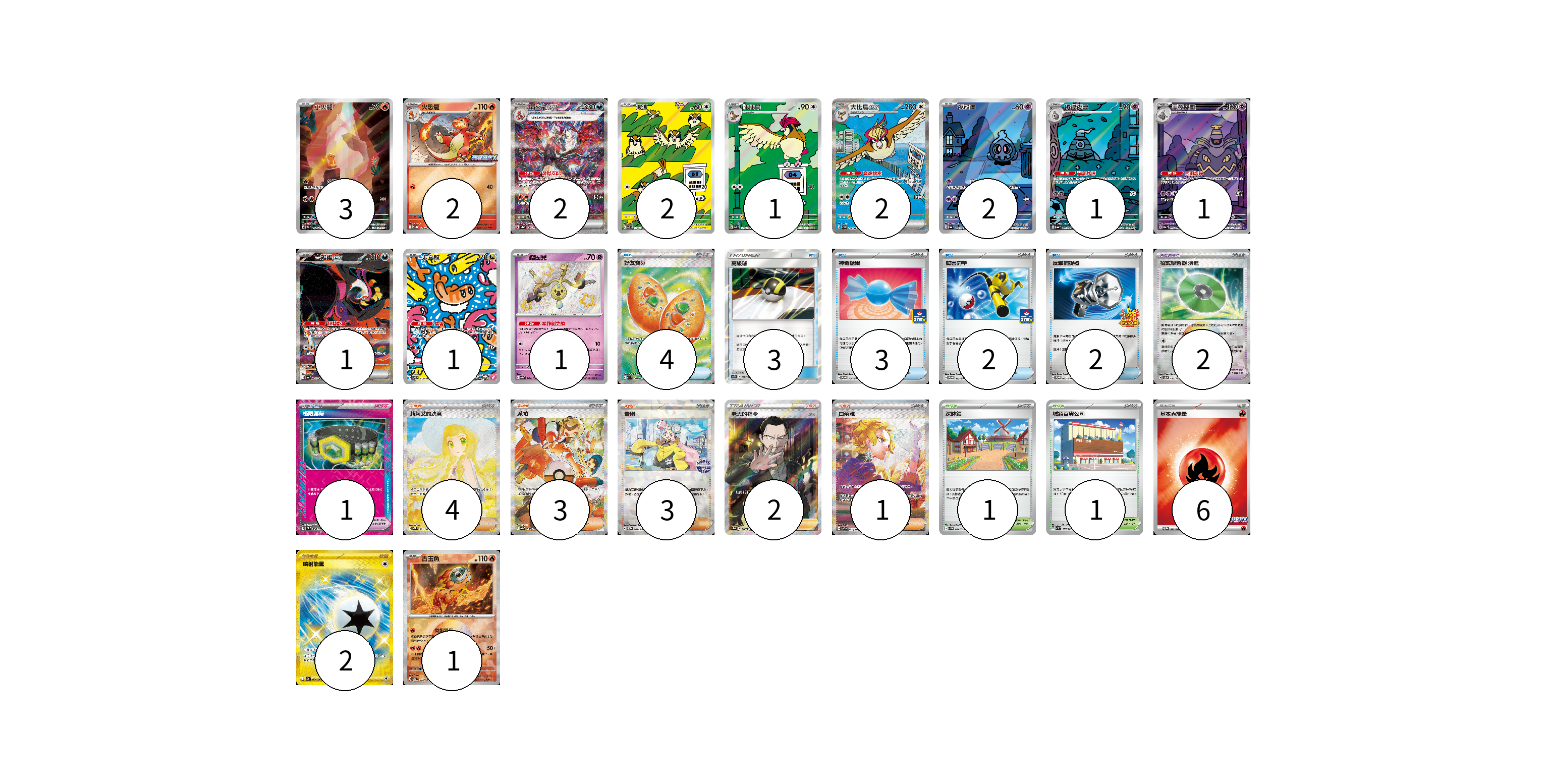牌組構築方案 以此牌組為基礎新構築牌組 顯示卡面 顯示列表 寶可夢卡(20) 3 2 2 2 1 2 2 1 1 1 1 1 1 寶可夢道具(3) 2 1 物品卡(14) 4 3 3 2 2 支援者卡(13) 4 3 3 2 1 競技場卡(2) 1 1 能量卡(8) 6 2 寶可夢卡(20) 卡牌名稱 張數 卡牌名稱 張數 小火龍 SV2a 168/165 03 火恐龍 M-P 021/M-P 02 噴火龍ex SV4a 349/190 02 波波 SV3 118/108 02 比比鳥 SV3 119/108 01 大比鳥ex SV3 136/108 02 夜巡靈 SV6a 068/064 02 彷徨夜靈 SV6a 069/064 01 黑夜魔靈 SV6a 070/064 01 吉雉雞ex SV6a 089/064 01 米立龍 SV6 112/101 01 鑰圈兒 SV4a 264/190 01 古玉魚 SV8a 025/187 01 寶可夢道具(3) 卡牌名稱 張數 卡牌名稱 張數 招式學習器 演進 SV8a 160/187 02 極限腰帶 SV5K 066/071 01 物品卡(14) 卡牌名稱 張數 卡牌名稱 張數 好友寶芬 M1S 081/063 04 高級球 AS5b 178/186 03 神奇糖果 SV-P 104/SV-P 03 厲害釣竿 SV-P 112/SV-P 02 反擊捕捉器 SV-P 083/SV-P 02 支援者卡(13) 卡牌名稱 張數 卡牌名稱 張數 莉莉艾的決意 M1L 091/063 04 派帕 SV4a 353/190 03 奇樹 SV-P 247/SV-P 03 老大的指令(坂木) SC1b 170/153 02 白蕾雅 SV7 132/102 01 競技場卡(2) 卡牌名稱 張數 卡牌名稱 張數 深缽鎮 SVF 036/038 01 城鎮百貨公司 SV3 107/108 01 能量卡(8) 卡牌名稱 張數 卡牌名稱 張數 基本【火】能量 M-P 032/M-P 06 噴射能量 SV7a 094/064 02 以此牌組為基礎新構築牌組 牌組編碼 nwHYUQ-TFhJgf-MCvhxY copy 列印牌組單 牌組編碼已複製 分享至SNS