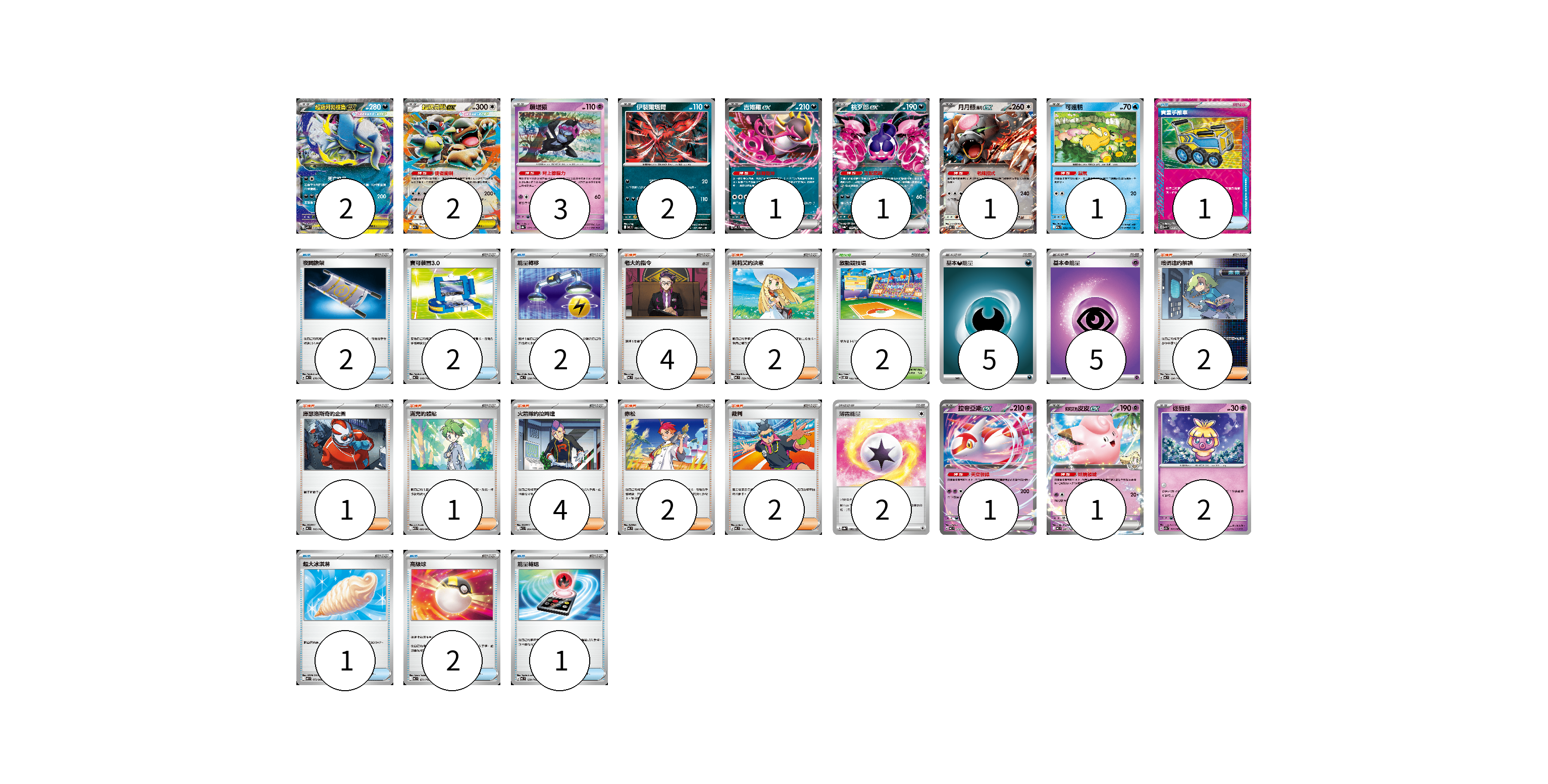 牌組構築方案 以此牌組為基礎新構築牌組 顯示卡面 顯示列表 寶可夢卡(17) 2 2 3 2 1 1 1 1 1 1 2 物品卡(11) 1 2 2 2 1 2 1 支援者卡(18) 4 2 2 1 1 4 2 2 競技場卡(2) 2 能量卡(12) 5 5 2 寶可夢卡(17) 卡牌名稱 張數 卡牌名稱 張數 超級阿勃梭魯ex M1L 038/063 02 超級袋獸ex M1S 051/063 02 願增猿 SV8a 075/187 03 伊裴爾塔爾 MC 481/742 02 吉雉雞ex MC 489/742 01 桃歹郎ex SV8a 105/187 01 月月熊 赫月 ex MC 625/742 01 可達鴨 M2a 032/193 01 拉帝亞斯ex MC 312/742 01 莉莉艾的皮皮ex MC 287/742 01 迷唇娃 SV7a 018/064 02 物品卡(11) 卡牌名稱 張數 卡牌名稱 張數 貴重手推車 SVK 020/042 01 夜間擔架 MC 670/742 02 寶可裝置3.0 MC 660/742 02 能量轉移 MC 638/742 02 超大冰淇淋 M2 073/080 01 高級球 MC 651/742 02 能量輸送 MC 639/742 01 支援者卡(18) 卡牌名稱 張數 卡牌名稱 張數 老大的指令 MC 724/742 04 莉莉艾的決意 MC 729/742 02 暗碼迷的解讀 MC 698/742 02 庫瑟洛斯奇的企圖 MC 705/742 01 滿充的體貼 M1S 060/063 01 火箭隊的拉姆達 SV10 094/098 04 赤松 MC 696/742 02 裁判 MC 711/742 02 競技場卡(2) 卡牌名稱 張數 卡牌名稱 張數 激動競技場 SV8 105/106 02 能量卡(12) 卡牌名稱 張數 卡牌名稱 張數 基本惡能量 sv-p DAR 05 基本【超】能量 MC PSY 05 薄霧能量 SV8a 186/187 02 以此牌組為基礎新構築牌組 牌組編碼 oApdvY-PoJyJi-spqksA copy 列印牌組單 牌組編碼已複製 分享至SNS