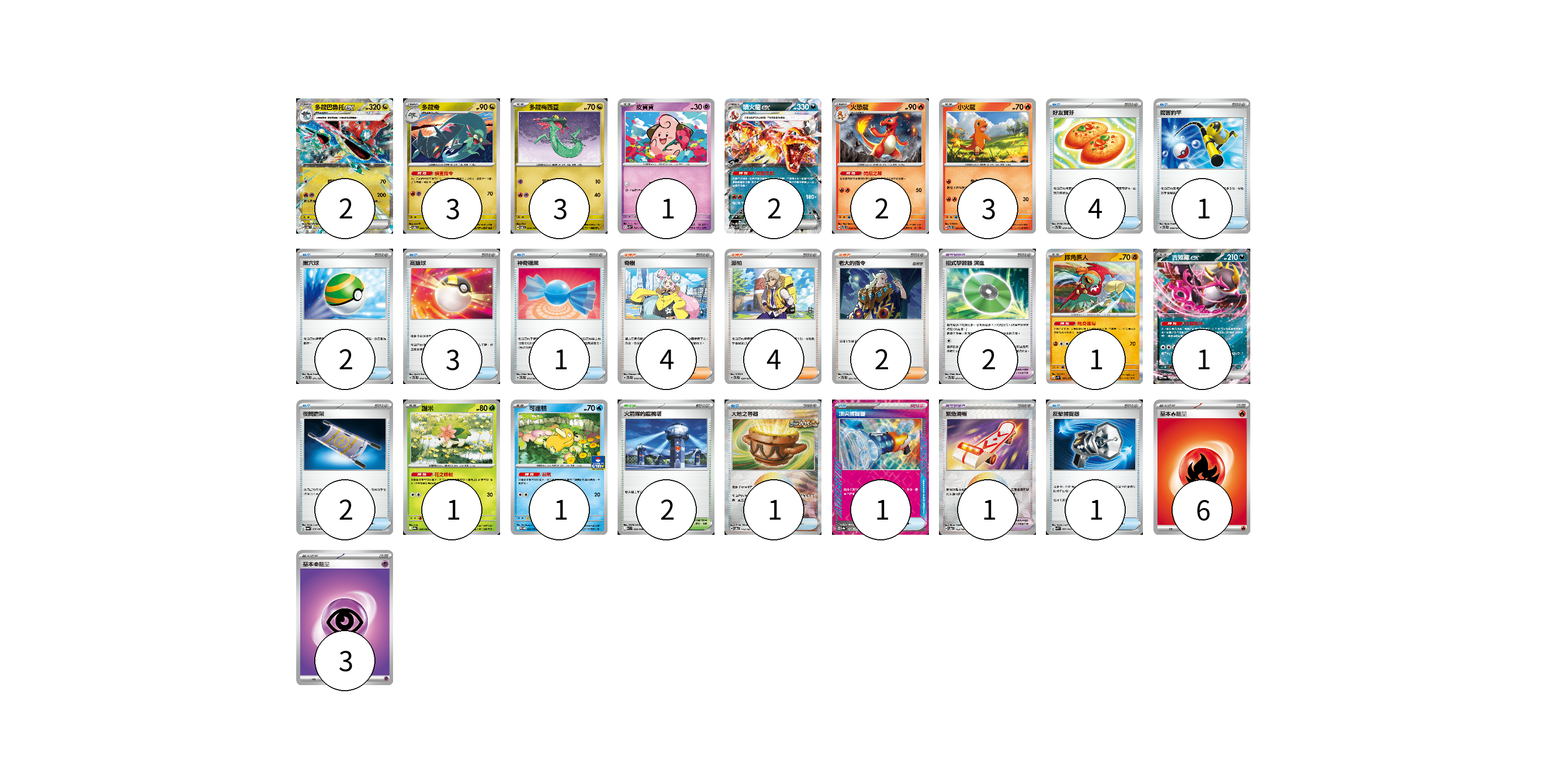 牌組構築方案 以此牌組為基礎新構築牌組 顯示卡面 顯示列表 寶可夢卡(20) 2 3 3 1 2 2 3 1 1 1 1 寶可夢道具(7) 4 2 1 物品卡(16) 4 1 2 3 1 2 1 1 1 支援者卡(6) 4 2 競技場卡(2) 2 能量卡(9) 6 3 寶可夢卡(20) 卡牌名稱 張數 卡牌名稱 張數 多龍巴魯托ex SV6 081/101 02 多龍奇 SV6 080/101 03 多龍梅西亞 SV6 079/101 03 皮寶寶 SV3 042/108 01 噴火龍ex SV3 066/108 02 火恐龍 SVTL 002/021 02 小火龍 SVTL 001/021 03 摔角鷹人 SV1S 045/078 01 吉雉雞ex SV6a 038/064 01 謝米 SV9a 006/063 01 可達鴨 SV-P 220/SV-P 01 寶可夢道具(7) 卡牌名稱 張數 卡牌名稱 張數 奇樹 SVTL 018/021 04 招式學習器 演進 SVTL 017/021 02 緊急滑板 SV8a 153/187 01 物品卡(16) 卡牌名稱 張數 卡牌名稱 張數 好友寶芬 SVTL 010/021 04 厲害釣竿 SVTL 009/021 01 巢穴球 SVTL 011/021 02 高級球 SVTL 012/021 03 神奇糖果 SVTL 013/021 01 夜間擔架 SV6a 056/064 02 大地之容器 SV8a 143/187 01 頂尖捕捉器 SV8a 148/187 01 反擊捕捉器 SVK 009/042 01 支援者卡(6) 卡牌名稱 張數 卡牌名稱 張數 派帕 SVTL 020/021 04 老大的指令 SVTL 021/021 02 競技場卡(2) 卡牌名稱 張數 卡牌名稱 張數 火箭隊的監視塔 SV10 096/098 02 能量卡(9) 卡牌名稱 張數 卡牌名稱 張數 基本【火】能量 SVTL FIR 06 基本【超】能量 SVTS PSY 03 以此牌組為基礎新構築牌組 牌組編碼 oCHyBR-lehgXH-PNRyhY copy 列印牌組單 牌組編碼已複製 分享至SNS