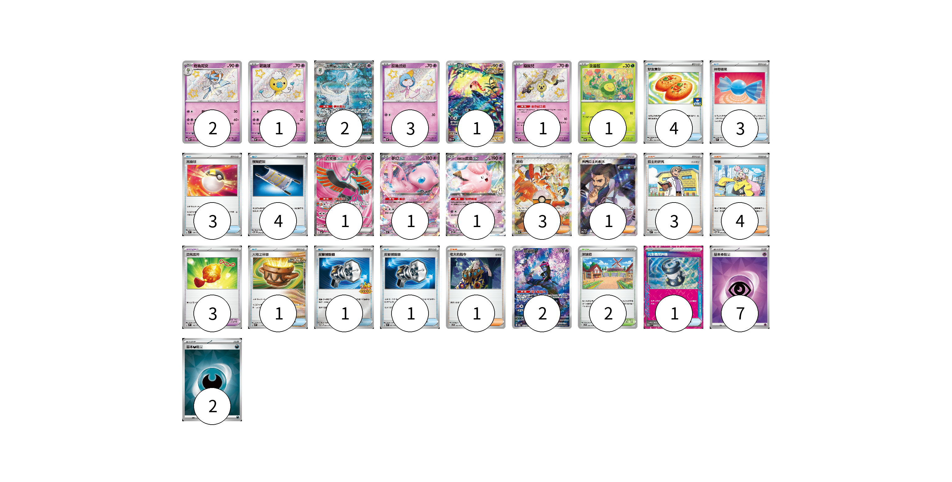 牌組構築方案 以此牌組為基礎新構築牌組 顯示卡面 顯示列表 寶可夢卡(16) 2 1 2 3 1 1 1 1 1 1 2 寶可夢道具(3) 3 物品卡(18) 4 3 3 4 1 1 1 1 支援者卡(12) 3 1 3 4 1 競技場卡(2) 2 能量卡(9) 7 2 寶可夢卡(16) 卡牌名稱 張數 卡牌名稱 張數 奇魯莉安 SV4a 259/190 02 飄飄球 SV4a 260/190 01 沙奈朵ex SV4a 348/190 02 拉魯拉絲 SV4a 258/190 03 吼叫尾 SV4K 071/066 01 鑰圈兒 SV4a 264/190 01 含羞苞 SV8a 001/187 01 吉雉雞ex SV6a 081/064 01 夢幻ex SV4a 076/190 01 莉莉艾的皮皮ex SV9 033/100 01 願增猿 SV6 107/101 02 寶可夢道具(3) 卡牌名稱 張數 卡牌名稱 張數 勇氣護符 SVM 142/175 03 物品卡(18) 卡牌名稱 張數 卡牌名稱 張數 好友寶芬 SV-P 212/SV-P 04 神奇糖果 SVM 135/175 03 高級球 SVM 134/175 03 夜間擔架 SVOM 016/021 04 大地之容器 SVK 012/042 01 反擊捕捉器 SV-P 083/SV-P 01 反擊捕捉器 SVK 009/042 01 完全體攪拌器 SVK 017/042 01 支援者卡(12) 卡牌名稱 張數 卡牌名稱 張數 派帕 SV4a 353/190 03 弗圖博士的劇本 SV4M 086/066 01 博士的研究 SVM 162/175 03 奇樹 SVOD 016/020 04 老大的指令 SVF 032/038 01 競技場卡(2) 卡牌名稱 張數 卡牌名稱 張數 深缽鎮 SVF 036/038 02 能量卡(9) 卡牌名稱 張數 卡牌名稱 張數 基本【超】能量 SVOD PSY 07 基本【惡】能量 SVOM DAR 02 以此牌組為基礎新構築牌組 牌組編碼 oEHCNe-bYSmTh-TVzfeu copy 列印牌組單 牌組編碼已複製 分享至SNS