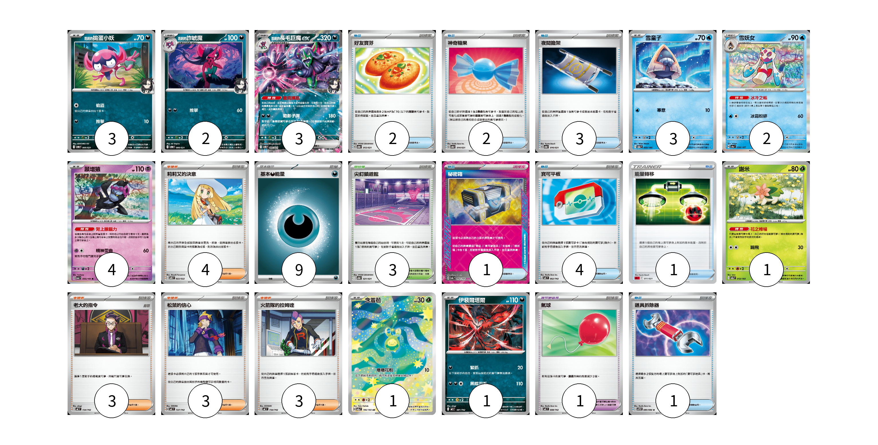 牌組構築方案 以此牌組為基礎新構築牌組 顯示卡面 顯示列表 寶可夢卡(20) 3 2 3 3 2 4 1 1 1 寶可夢道具(1) 1 物品卡(14) 2 2 3 1 4 1 1 支援者卡(13) 4 3 3 3 競技場卡(3) 3 能量卡(9) 9 寶可夢卡(20) 卡牌名稱 張數 卡牌名稱 張數 <瑪俐的>搗蛋小妖 SVOM 005/021 03 <瑪俐的>詐唬魔 SVOM 006/021 02 <瑪俐的>長毛巨魔ex SVOM 007/021 03 雪童子 M2a 035/193 03 雪妖女 SV8a 038/187 02 願增猿 SV6 055/101 04 謝米 M2a 012/193 01 含羞苞 M2a 196/193 01 伊裴爾塔爾 MC 481/742 01 寶可夢道具(1) 卡牌名稱 張數 卡牌名稱 張數 氣球 MC 688/742 01 物品卡(14) 卡牌名稱 張數 卡牌名稱 張數 好友寶芬 SVOM 012/021 02 神奇糖果 SVOM 014/021 02 夜間擔架 SVOM 016/021 03 秘密箱 SV6 092/101 01 寶可平板 MC 662/742 04 能量轉移 SDL 011/021 01 道具拆除器 SV11W 080/086 01 支援者卡(13) 卡牌名稱 張數 卡牌名稱 張數 莉莉艾的決意 MBG 022/022 04 老大的指令 MC 724/742 03 松葉的信心 MC 727/742 03 火箭隊的拉姆達 MC 734/742 03 競技場卡(3) 卡牌名稱 張數 卡牌名稱 張數 尖釘鎮道館 SVOM 021/021 03 能量卡(9) 卡牌名稱 張數 卡牌名稱 張數 基本【惡】能量 M-P DAR 09 以此牌組為基礎新構築牌組 牌組編碼 oJtAAC-ZDeGUf-IvnRqW copy 列印牌組單 牌組編碼已複製 分享至SNS