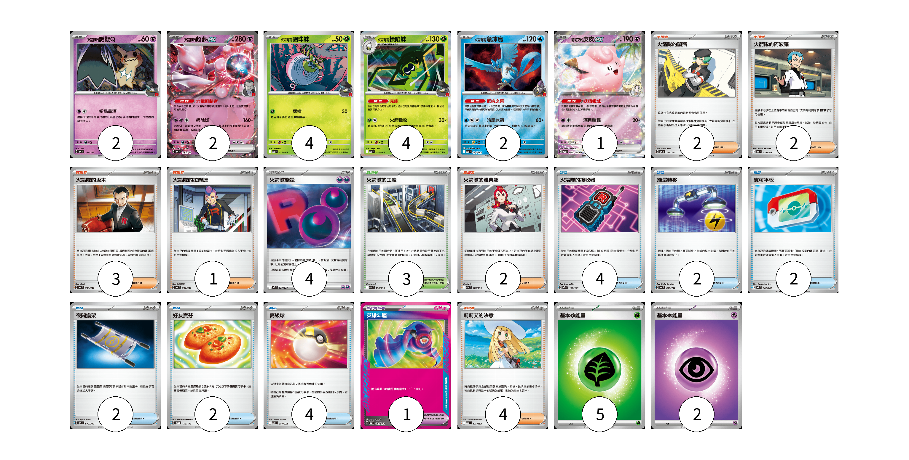 牌組構築方案 以此牌組為基礎新構築牌組 顯示卡面 顯示列表 寶可夢卡(15) 2 2 4 4 2 1 寶可夢道具(1) 1 物品卡(16) 4 2 2 2 2 4 支援者卡(14) 2 2 3 1 2 4 競技場卡(3) 3 能量卡(11) 4 5 2 寶可夢卡(15) 卡牌名稱 張數 卡牌名稱 張數 <火箭隊的>謎擬Q MC 341/742 02 <火箭隊的>超夢ex MC 290/742 02 <火箭隊的>團珠蛛 M2a 015/193 04 <火箭隊的>操陷蛛 M2a 016/193 04 <火箭隊的>急凍鳥 M2a 034/193 02 莉莉艾的皮皮ex M2a 060/193 01 寶可夢道具(1) 卡牌名稱 張數 卡牌名稱 張數 英雄斗篷 MC 687/742 01 物品卡(16) 卡牌名稱 張數 卡牌名稱 張數 火箭隊的接收器 M2a 160/193 04 能量轉移 MC 638/742 02 寶可平板 MC 662/742 02 夜間擔架 MC 670/742 02 好友寶芬 M2a 153/193 02 高級球 MBD 014/022 04 支援者卡(14) 卡牌名稱 張數 卡牌名稱 張數 火箭隊的蘭斯 MC 735/742 02 火箭隊的阿波羅 MC 732/742 02 火箭隊的坂木 MC 733/742 03 火箭隊的拉姆達 MC 734/742 01 火箭隊的雅典娜 M2a 176/193 02 莉莉艾的決意 M2a 175/193 04 競技場卡(3) 卡牌名稱 張數 卡牌名稱 張數 火箭隊的工廠 M2a 190/193 03 能量卡(11) 卡牌名稱 張數 卡牌名稱 張數 火箭隊能量 MC 742/742 04 基本【草】能量 MC GRA 05 基本【超】能量 MC PSY 02 以此牌組為基礎新構築牌組 牌組編碼 oJtEKU-kWiXXS-lYqbcE copy 列印牌組單 牌組編碼已複製 分享至SNS