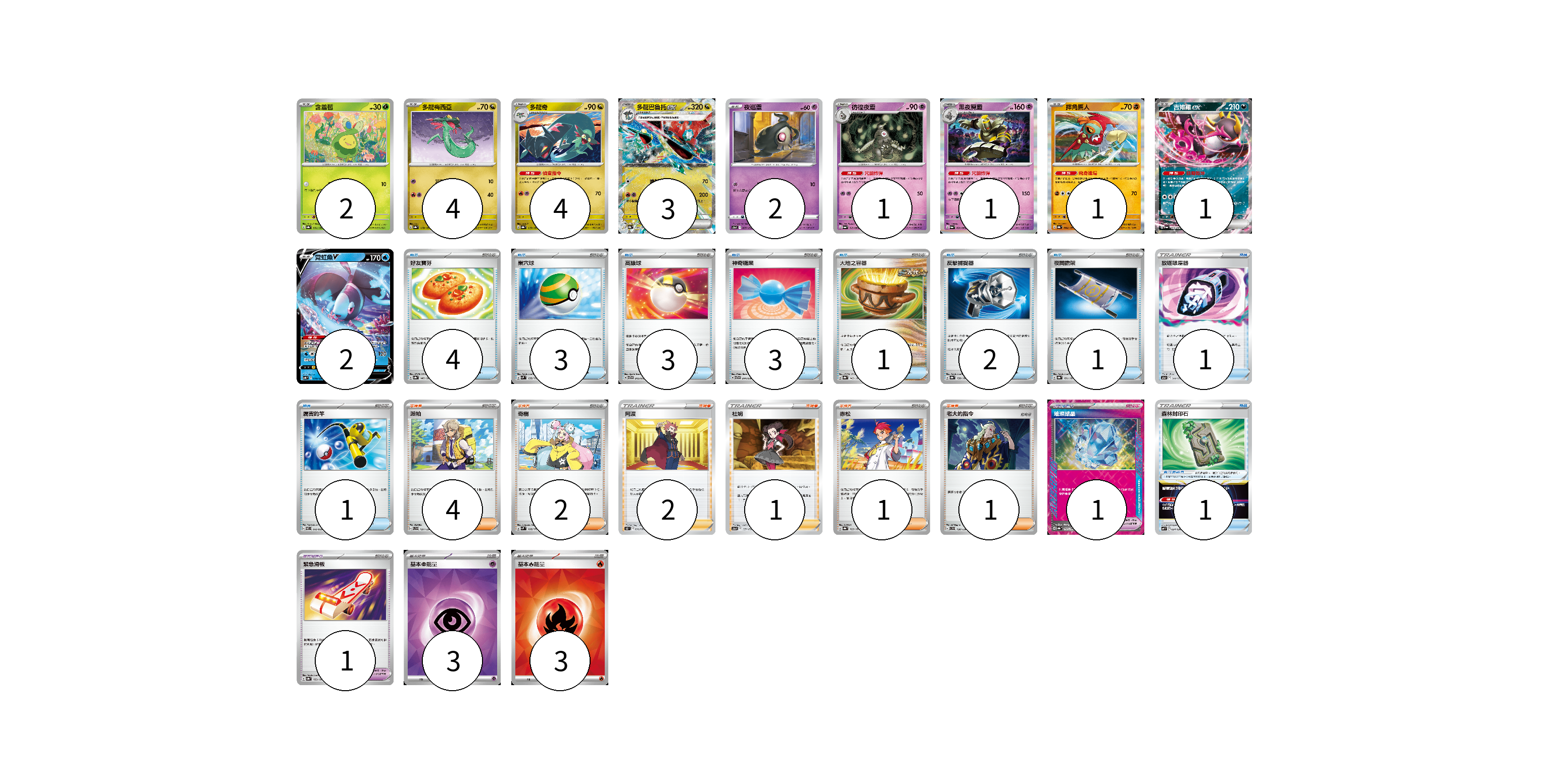 牌組構築方案 以此牌組為基礎新構築牌組 顯示卡面 顯示列表 寶可夢卡(22) 2 4 4 3 2 1 1 1 1 2 1 寶可夢道具(2) 1 1 物品卡(19) 4 3 3 3 1 2 1 1 1 支援者卡(11) 4 2 2 1 1 1 能量卡(6) 3 3 寶可夢卡(22) 卡牌名稱 張數 卡牌名稱 張數 含羞苞 SV8a 001/187 02 多龍梅西亞 SV8a 118/187 04 多龍奇 SV8a 119/187 04 多龍巴魯托ex SV8a 120/187 03 夜巡靈 S12a 057/172 02 彷徨夜靈 SV6a 019/064 01 黑夜魔靈 SV6a 020/064 01 摔角鷹人 SV8a 084/187 01 吉雉雞ex SV6a 038/064 01 霓虹魚V SVB 008/028 02 厲害釣竿 SVEL 010/020 01 寶可夢道具(2) 卡牌名稱 張數 卡牌名稱 張數 璀璨結晶 SV8a 152/187 01 緊急滑板 SV8a 153/187 01 物品卡(19) 卡牌名稱 張數 卡牌名稱 張數 好友寶芬 SV8a 147/187 04 巢穴球 SVM 133/175 03 高級球 SVTG 013/019 03 神奇糖果 SVTG 014/019 03 大地之容器 SV8a 143/187 01 反擊捕捉器 SV8a 139/187 02 夜間擔架 SV8a 151/187 01 放逐吸塵器 S12a 144/172 01 森林封印石 SVF 024/038 01 支援者卡(11) 卡牌名稱 張數 卡牌名稱 張數 派帕 SVD 137/139 04 奇樹 SVM 160/175 02 阿渡 S12 096/098 02 杜娟 S12a 157/172 01 赤松 SV8a 163/187 01 老大的指令(魁奇思) SVD 138/139 01 能量卡(6) 卡牌名稱 張數 卡牌名稱 張數 基本【超】能量 SVK PSY 03 基本【火】能量 SVK FIR 03 以此牌組為基礎新構築牌組 牌組編碼 oPSNyf-mPSXEm-KQhdAP copy 列印牌組單 牌組編碼已複製 分享至SNS