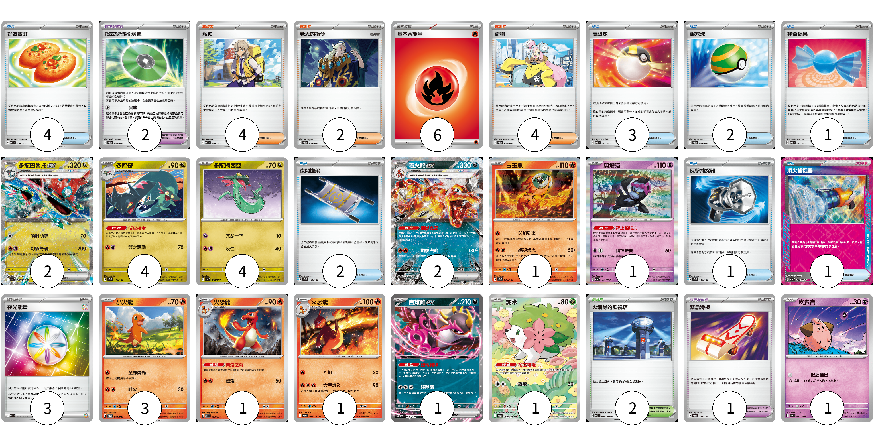 牌組構築方案 以此牌組為基礎新構築牌組 顯示卡面 顯示列表 寶可夢卡(22) 2 4 4 2 1 1 3 1 1 1 1 1 寶可夢道具(7) 2 4 1 物品卡(14) 4 3 2 1 2 1 1 支援者卡(6) 4 2 競技場卡(2) 2 能量卡(9) 6 3 寶可夢卡(22) 卡牌名稱 張數 卡牌名稱 張數 多龍巴魯托ex SV8a 120/187 02 多龍奇 SV8a 119/187 04 多龍梅西亞 SV8a 118/187 04 噴火龍ex SV4a 115/190 02 古玉魚 SV8a 025/187 01 願增猿 SV8a 075/187 01 小火龍 SVTL 001/021 03 火恐龍 SVTL 002/021 01 火恐龍 SV2a 005/165 01 吉雉雞ex SVOD 004/020 01 謝米 SV9a 066/063 01 皮寶寶 SV4a 077/190 01 寶可夢道具(7) 卡牌名稱 張數 卡牌名稱 張數 招式學習器 演進 SVTL 017/021 02 奇樹 SVTL 018/021 04 緊急滑板 SV8a 153/187 01 物品卡(14) 卡牌名稱 張數 卡牌名稱 張數 好友寶芬 SVTL 010/021 04 高級球 SVTL 012/021 03 巢穴球 SVTL 011/021 02 神奇糖果 SVTL 013/021 01 夜間擔架 SV8a 151/187 02 反擊捕捉器 SV8a 139/187 01 頂尖捕捉器 SV8a 148/187 01 支援者卡(6) 卡牌名稱 張數 卡牌名稱 張數 派帕 SVTL 020/021 04 老大的指令 SVTL 021/021 02 競技場卡(2) 卡牌名稱 張數 卡牌名稱 張數 火箭隊的監視塔 SV10 096/098 02 能量卡(9) 卡牌名稱 張數 卡牌名稱 張數 基本【火】能量 SVTL FIR 06 夜光能量 SV1a 073/073 03 以此牌組為基礎新構築牌組 牌組編碼 oQfkqJ-gLFBME-bcXUmt copy 列印牌組單 牌組編碼已複製 分享至SNS