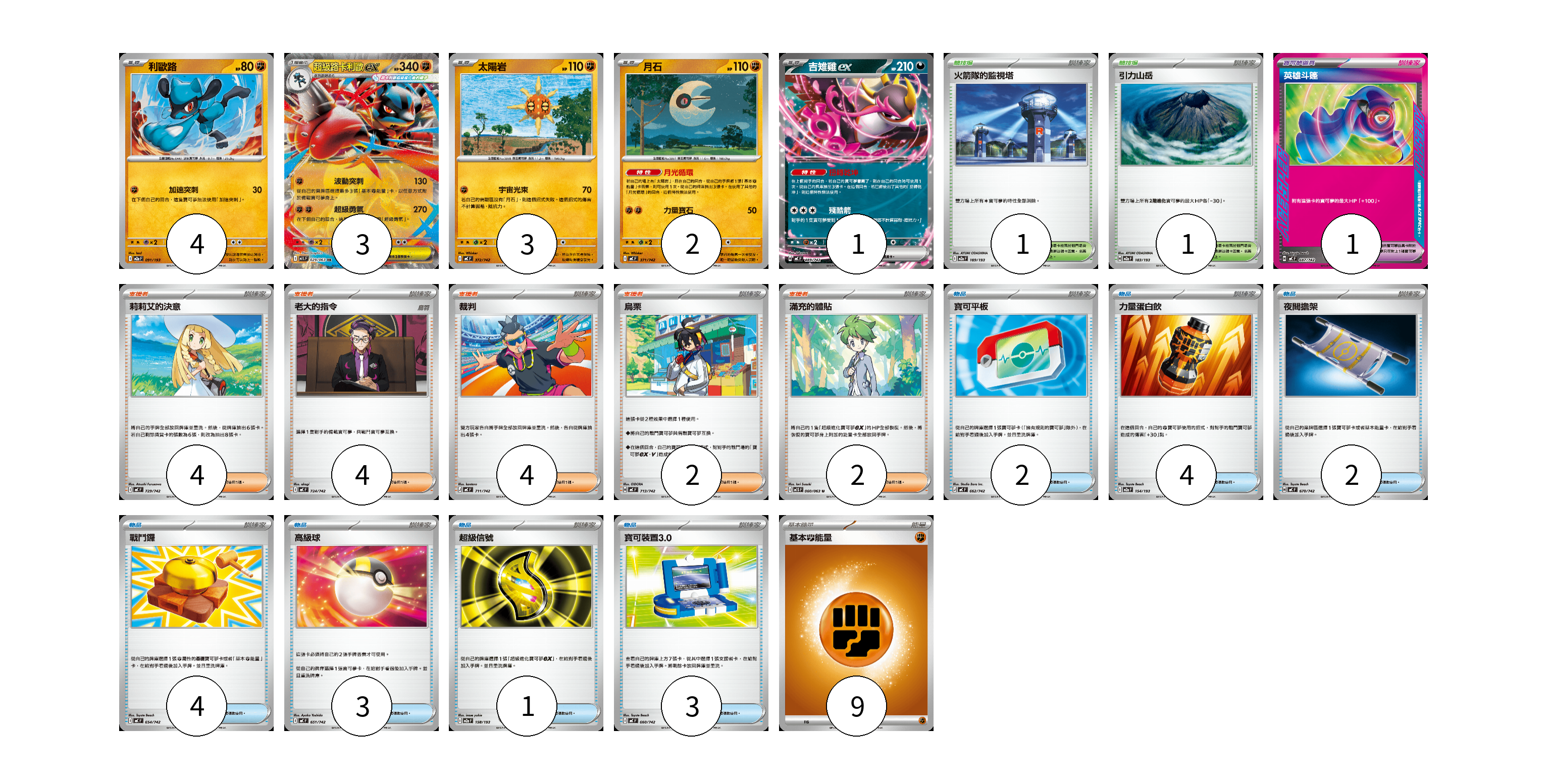 牌組構築方案 以此牌組為基礎新構築牌組 顯示卡面 顯示列表 寶可夢卡(13) 4 3 3 2 1 寶可夢道具(1) 1 物品卡(19) 2 4 2 4 3 1 3 支援者卡(16) 4 4 4 2 2 競技場卡(2) 1 1 能量卡(9) 9 寶可夢卡(13) 卡牌名稱 張數 卡牌名稱 張數 利歐路 M2a 091/193 04 超級路卡利歐ex M1L 029/063 03 太陽岩 MC 372/742 03 月石 MC 371/742 02 吉雉雞ex MC 489/742 01 寶可夢道具(1) 卡牌名稱 張數 卡牌名稱 張數 英雄斗篷 MC 687/742 01 物品卡(19) 卡牌名稱 張數 卡牌名稱 張數 寶可平板 MC 662/742 02 力量蛋白飲 M2a 154/193 04 夜間擔架 MC 670/742 02 戰鬥鑼 MC 654/742 04 高級球 MC 651/742 03 超級信號 M2a 158/193 01 寶可裝置3.0 MC 660/742 03 支援者卡(16) 卡牌名稱 張數 卡牌名稱 張數 莉莉艾的決意 MC 729/742 04 老大的指令 MC 724/742 04 裁判 MC 711/742 04 烏栗 MC 713/742 02 滿充的體貼 M1S 060/063 02 競技場卡(2) 卡牌名稱 張數 卡牌名稱 張數 火箭隊的監視塔 M2a 189/193 01 引力山岳 M2a 183/193 01 能量卡(9) 卡牌名稱 張數 卡牌名稱 張數 基本【鬥】能量 MC FIG 09 以此牌組為基礎新構築牌組 牌組編碼 oRBJZw-iecZhr-DiuhEK copy 列印牌組單 牌組編碼已複製 分享至SNS