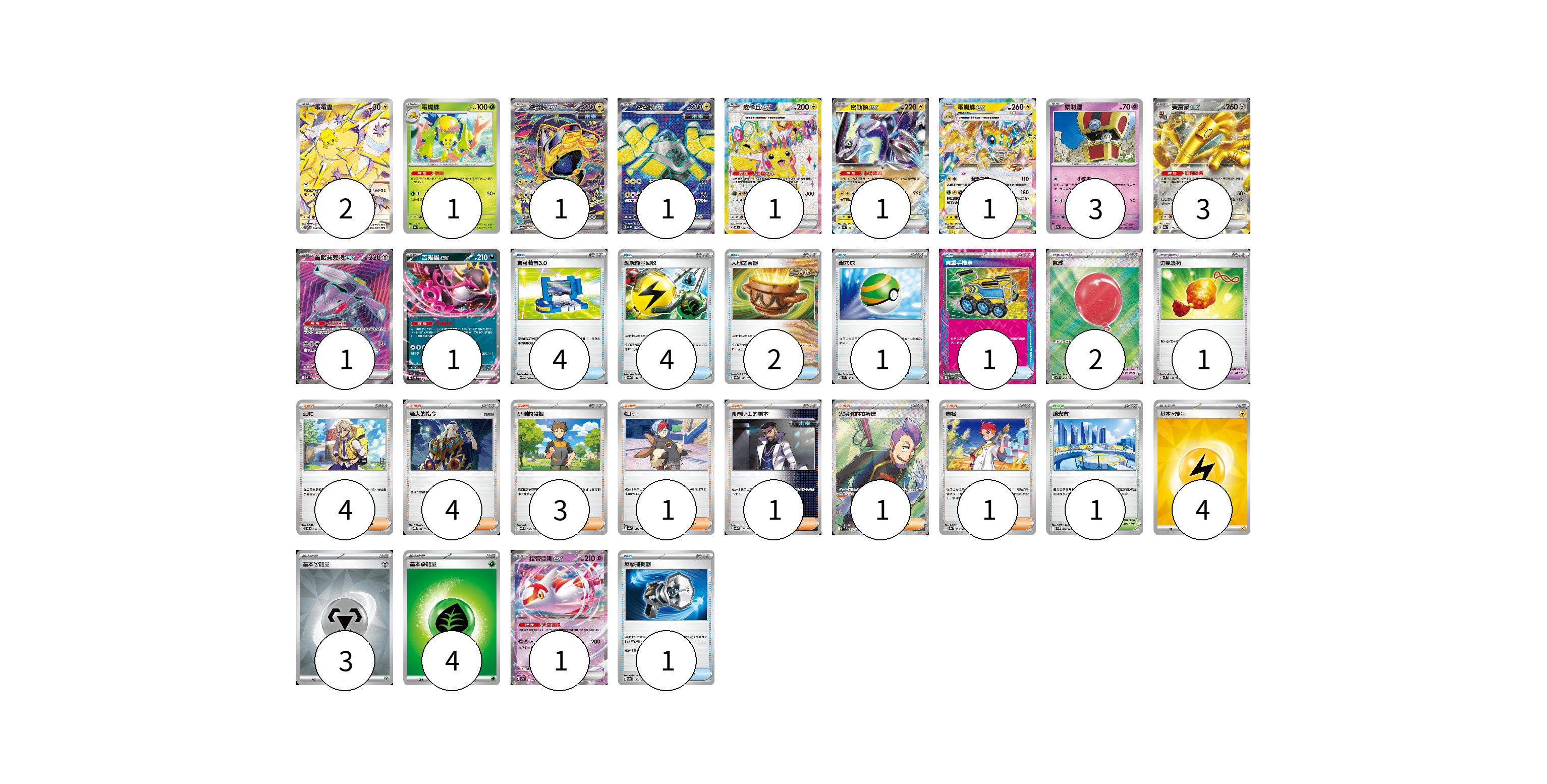 牌組構築方案 以此牌組為基礎新構築牌組 顯示卡面 顯示列表 寶可夢卡(17) 2 1 1 1 1 1 1 3 3 1 1 1 寶可夢道具(3) 2 1 物品卡(13) 4 4 2 1 1 1 支援者卡(15) 4 4 3 1 1 1 1 競技場卡(1) 1 能量卡(11) 4 3 4 寶可夢卡(17) 卡牌名稱 張數 卡牌名稱 張數 電電蟲 SV7 108/102 02 電蜘蛛 SV6a 002/064 01 鐵臂膀ex SV8a 210/187 01 鐵臂膀ex SV4M 079/066 01 皮卡丘ex SV8 122/106 01 密勒頓ex SV4a 071/190 01 電蜘蛛ex SV7 033/102 01 索財靈 SV7a 024/064 03 賽富豪ex SV8a 117/187 03 蓋諾賽克特ex SV11B 164/086 01 吉雉雞ex SVOD 004/020 01 拉帝亞斯ex SV7a 019/064 01 寶可夢道具(3) 卡牌名稱 張數 卡牌名稱 張數 氣球 M1L 084/063 02 勇氣護符 SVM 142/175 01 物品卡(13) 卡牌名稱 張數 卡牌名稱 張數 寶可裝置3.0 SV11B 081/086 04 超級能量回收 SV8a 141/187 04 大地之容器 SV8a 143/187 02 巢穴球 SVM 133/175 01 貴重手推車 SVK 020/042 01 反擊捕捉器 SV8a 139/187 01 支援者卡(15) 卡牌名稱 張數 卡牌名稱 張數 派帕 SVOD 018/020 04 老大的指令 MBG 021/022 04 小剛的發掘 SV9 096/100 03 牡丹 SV4a 182/190 01 弗圖博士的劇本 SV8a 175/187 01 火箭隊的拉姆達 SV10 122/098 01 赤松 SV8a 163/187 01 競技場卡(1) 卡牌名稱 張數 卡牌名稱 張數 釀光市 SV9 098/100 01 能量卡(11) 卡牌名稱 張數 卡牌名稱 張數 基本【雷】能量 SVQP LIG 04 基本【鋼】能量 SVOD MET 03 基本【草】能量 M-P GRA 04 以此牌組為基礎新構築牌組 牌組編碼 oSSVdX-HUQhzV-qwHynF copy 列印牌組單 牌組編碼已複製 分享至SNS
