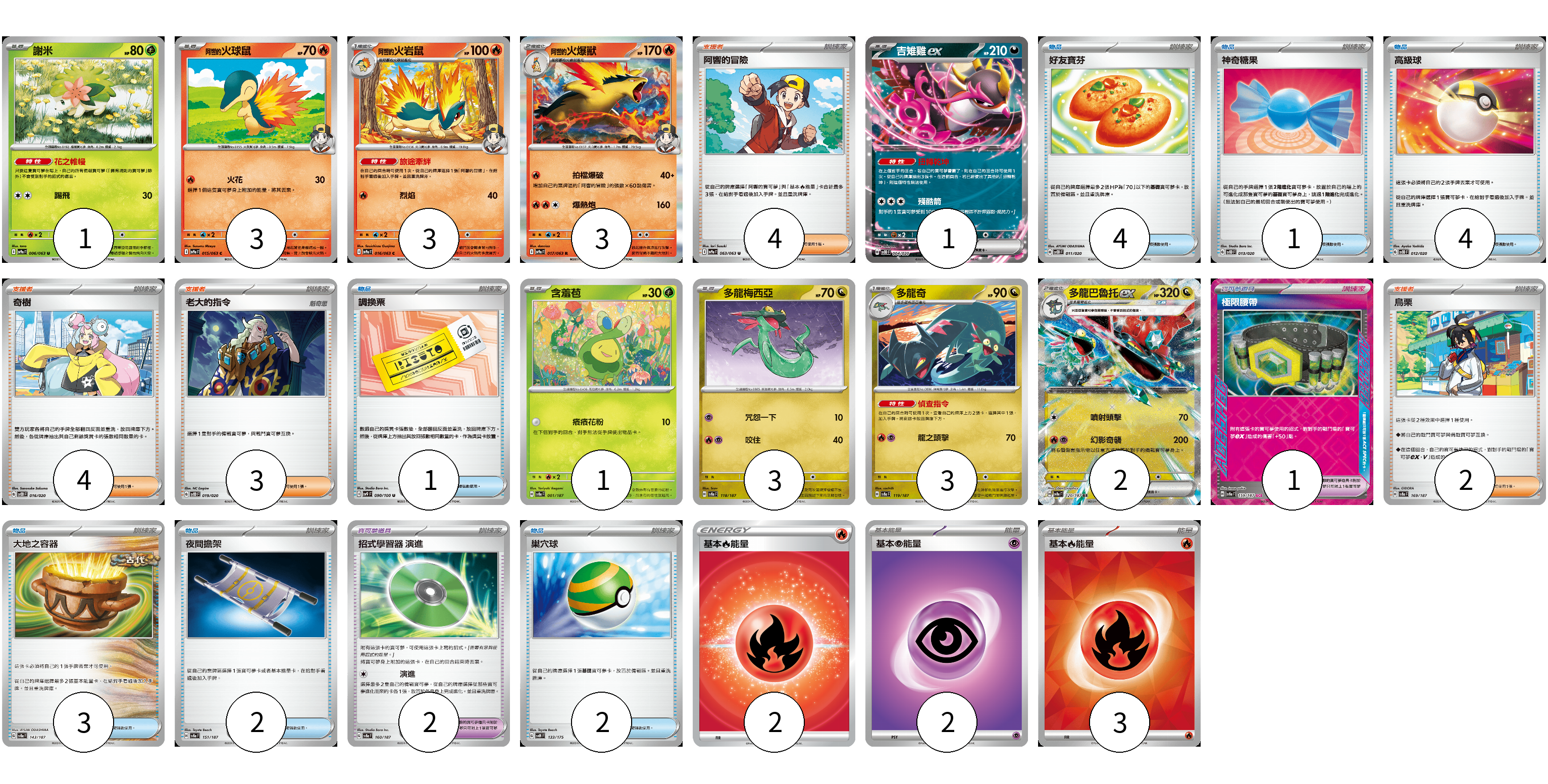 牌組構築方案 以此牌組為基礎新構築牌組 顯示卡面 顯示列表 寶可夢卡(20) 1 3 3 3 1 1 3 3 2 寶可夢道具(3) 1 2 物品卡(17) 4 1 4 1 3 2 2 支援者卡(13) 4 4 3 2 能量卡(7) 2 2 3 寶可夢卡(20) 卡牌名稱 張數 卡牌名稱 張數 謝米 SV9a 006/063 01 <阿響的>火球鼠 SV9a 015/063 03 <阿響的>火岩鼠 SV9a 016/063 03 <阿響的>火爆獸 SV9a 017/063 03 吉雉雞ex SVOD 004/020 01 含羞苞 SV8a 001/187 01 多龍梅西亞 SV8a 118/187 03 多龍奇 SV8a 119/187 03 多龍巴魯托ex SV8a 120/187 02 寶可夢道具(3) 卡牌名稱 張數 卡牌名稱 張數 極限腰帶 SV8a 159/187 01 招式學習器 演進 SV8a 160/187 02 物品卡(17) 卡牌名稱 張數 卡牌名稱 張數 好友寶芬 SVOD 011/020 04 神奇糖果 SVOD 013/020 01 高級球 SVOD 012/020 04 調換票 SV9 090/100 01 大地之容器 SV8a 143/187 03 夜間擔架 SV8a 151/187 02 巢穴球 SVM 133/175 02 支援者卡(13) 卡牌名稱 張數 卡牌名稱 張數 阿響的冒險 SV9a 063/063 04 奇樹 SVOD 016/020 04 老大的指令 SVOD 019/020 03 烏栗 SV8a 169/187 02 能量卡(7) 卡牌名稱 張數 卡牌名稱 張數 基本【炎】能量 SI FIR 02 基本【超】能量 SVAW PSY 02 基本【火】能量 SVK FIR 03 以此牌組為基礎新構築牌組 牌組編碼 oTImbn-coKSEy-rDYKoA copy 列印牌組單 牌組編碼已複製 分享至SNS