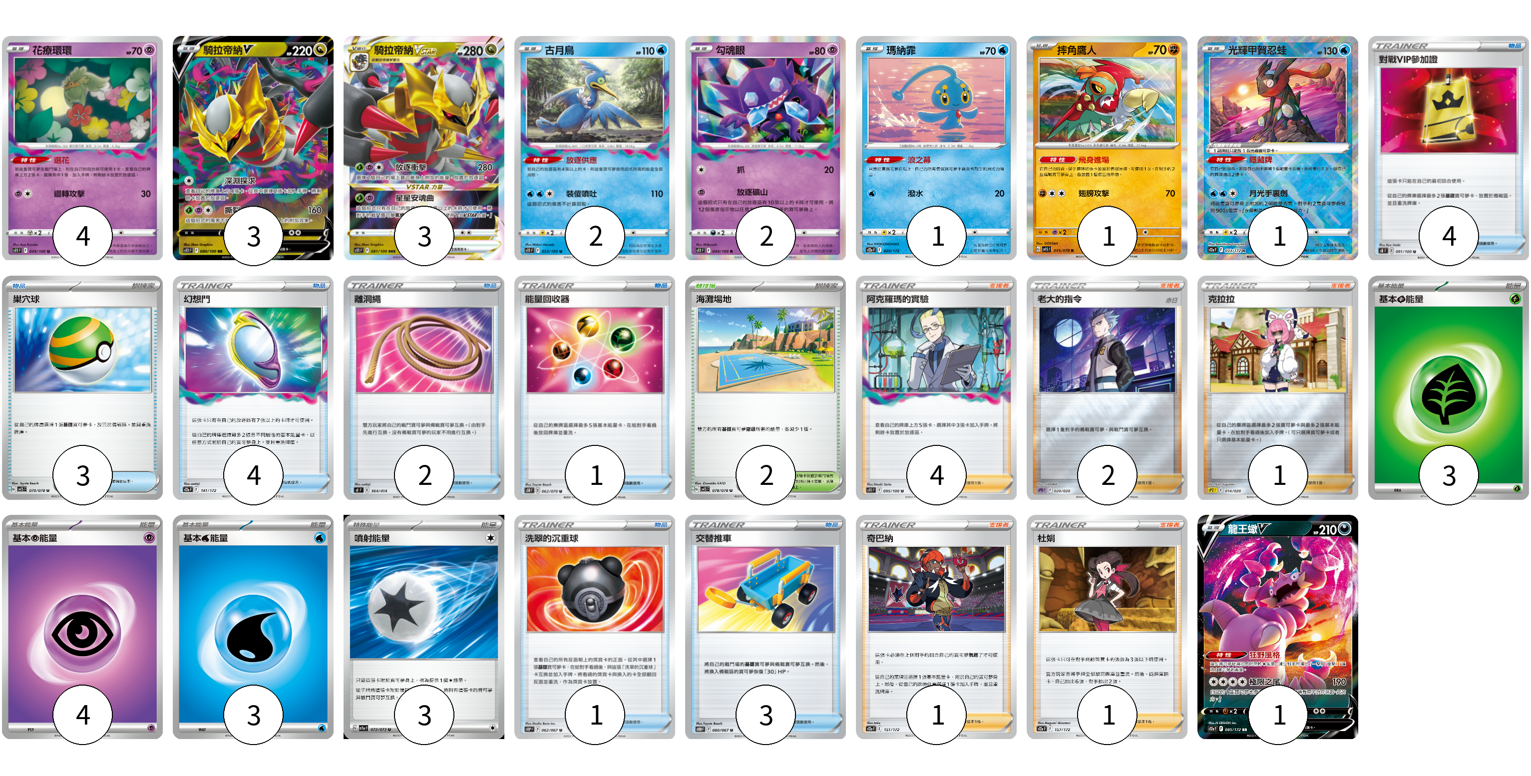 牌組構築方案 以此牌組為基礎新構築牌組 顯示卡面 顯示列表 寶可夢卡(18) 4 3 3 2 2 1 1 1 1 物品卡(18) 4 3 4 2 1 1 3 支援者卡(9) 4 2 1 1 1 競技場卡(2) 2 能量卡(13) 3 4 3 3 寶可夢卡(18) 卡牌名稱 張數 卡牌名稱 張數 花療環環 S11 049/100 04 騎拉帝納V S11 080/100 03 騎拉帝納VSTAR S11 081/100 03 古月鳥 S11 033/100 02 勾魂眼 S11 044/100 02 瑪納霏 S12a 029/172 01 摔角鷹人 SV1S 045/078 01 光輝甲賀忍蛙 S12a 033/172 01 龍王蠍V S12a 085/172 01 物品卡(18) 卡牌名稱 張數 卡牌名稱 張數 對戰VIP參加證 S8 091/100 04 巢穴球 SV1S 070/078 03 幻想門 S12a 141/172 04 離洞繩 SI 364/414 02 能量回收器 S5R 062/070 01 洗翠的沉重球 S10P 062/067 01 交替推車 S10D 060/067 03 支援者卡(9) 卡牌名稱 張數 卡牌名稱 張數 阿克羅瑪的實驗 S11 095/100 04 老大的指令(赤日) SPD 020/020 02 克拉拉 SPZ 014/020 01 奇巴納 S12a 151/172 01 杜娟 S12a 157/172 01 競技場卡(2) 卡牌名稱 張數 卡牌名稱 張數 海灘場地 SV1S 078/078 02 能量卡(13) 卡牌名稱 張數 卡牌名稱 張數 基本草能量 sv-p GRA 03 基本【超】能量 SVAW PSY 04 基本【水】能量 SVAW WAT 03 噴射能量 SV1a 072/073 03 以此牌組為基礎新構築牌組 牌組編碼 oUFXex-hHdOiB-rBVCpe copy 列印牌組單 牌組編碼已複製 分享至SNS