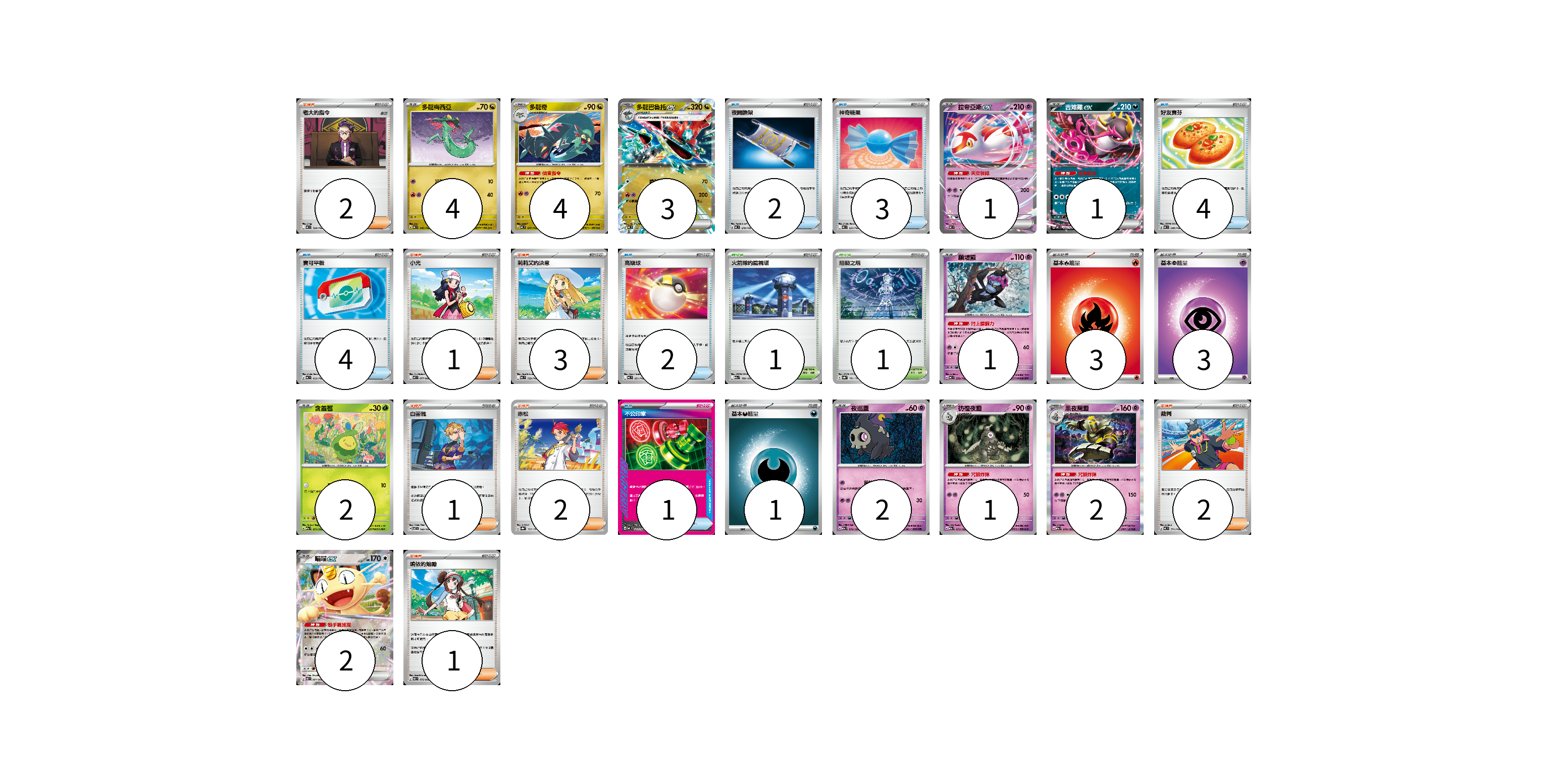牌組構築方案 以此牌組為基礎新構築牌組 顯示卡面 顯示列表 寶可夢卡(23) 4 4 3 1 1 1 2 2 1 2 2 物品卡(16) 2 3 4 4 2 1 支援者卡(12) 2 1 3 1 2 2 1 競技場卡(2) 1 1 能量卡(7) 3 3 1 寶可夢卡(23) 卡牌名稱 張數 卡牌名稱 張數 多龍梅西亞 MC 546/742 04 多龍奇 MC 547/742 04 多龍巴魯托ex MC 548/742 03 拉帝亞斯ex MC 312/742 01 吉雉雞ex MC 489/742 01 願增猿 MC 358/742 01 含羞苞 M2a 011/193 02 夜巡靈 M2a 072/193 02 彷徨夜靈 M2a 073/193 01 黑夜魔靈 M2a 074/193 02 喵喵ex M3 061/080 02 物品卡(16) 卡牌名稱 張數 卡牌名稱 張數 夜間擔架 MC 670/742 02 神奇糖果 MC 655/742 03 好友寶芬 MC 648/742 04 寶可平板 MC 662/742 04 高級球 MC 651/742 02 不公印章 MC 633/742 01 支援者卡(12) 卡牌名稱 張數 卡牌名稱 張數 老大的指令 MC 724/742 02 小光 M2 077/080 01 莉莉艾的決意 MC 729/742 03 白蕾雅 SV7 100/102 01 赤松 SV8a 163/187 02 裁判 MC 711/742 02 鳴依的勉勵 M3 075/080 01 競技場卡(2) 卡牌名稱 張數 卡牌名稱 張數 火箭隊的監視塔 M2a 189/193 01 阻礙之塔 SV8a 181/187 01 能量卡(7) 卡牌名稱 張數 卡牌名稱 張數 基本【火】能量 MC FIR 03 基本【超】能量 MC PSY 03 基本【惡】能量 MC DAR 01 以此牌組為基礎新構築牌組 牌組編碼 oUZAgM-IFRTjJ-wkEjys copy 列印牌組單 牌組編碼已複製 分享至SNS