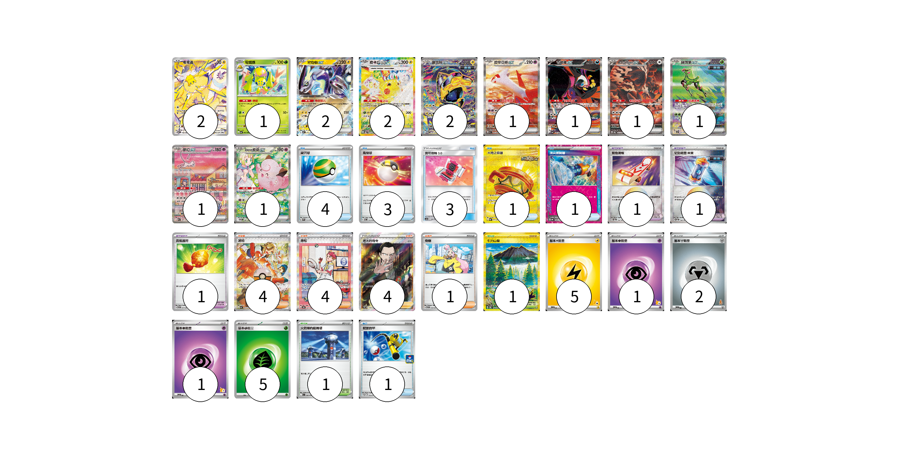 牌組構築方案 以此牌組為基礎新構築牌組 顯示卡面 顯示列表 寶可夢卡(15) 2 1 2 2 2 1 1 1 1 1 1 寶可夢道具(3) 1 1 1 物品卡(13) 4 3 3 1 1 1 支援者卡(13) 4 4 4 1 競技場卡(2) 1 1 能量卡(14) 5 1 2 1 5 寶可夢卡(15) 卡牌名稱 張數 卡牌名稱 張數 電電蟲 SV7 108/102 02 電蜘蛛 SV6a 002/064 01 密勒頓ex SV4a 071/190 02 皮卡丘ex SV8 132/106 02 鐵臂膀ex SV8a 210/187 02 拉帝亞斯ex SV7a 087/064 01 吉雉雞ex SV6a 089/064 01 月月熊 赫月ex SV8a 225/187 01 鐵斑葉ex SV5M 093/071 01 夢幻ex SV2a 205/165 01 莉莉艾的皮皮ex SV9 126/100 01 寶可夢道具(3) 卡牌名稱 張數 卡牌名稱 張數 緊急滑板 SV8a 153/187 01 驅勁能量 未來 SV8a 158/187 01 勇氣護符 SVTS 017/022 01 物品卡(13) 卡牌名稱 張數 卡牌名稱 張數 巢穴球 SVAW 014/023 04 高級球 SVEL 012/020 03 寶可齒輪3.0 AS6b 190/194 03 大地之容器 SV6a 093/064 01 頂尖捕捉器 SV8a 148/187 01 厲害釣竿 SV-P 112/SV-P 01 支援者卡(13) 卡牌名稱 張數 卡牌名稱 張數 派帕 SV4a 353/190 04 赤松 SV8a 227/187 04 老大的指令(坂木) SC1b 170/153 04 奇樹 SVTS 018/022 01 競技場卡(2) 卡牌名稱 張數 卡牌名稱 張數 引力山岳 SV8 138/106 01 火箭隊的監視塔 SV10 096/098 01 能量卡(14) 卡牌名稱 張數 卡牌名稱 張數 基本【雷】能量 SVI LIG 05 基本【超】能量 SVI PSY 01 基本【鋼】能量 SVI MET 02 基本【超】能量 SVI PSY 01 基本【草】能量 SVTM GRA 05 以此牌組為基礎新構築牌組 牌組編碼 oVxFYd-nFhFfD-zjxoCV copy 列印牌組單 牌組編碼已複製 分享至SNS