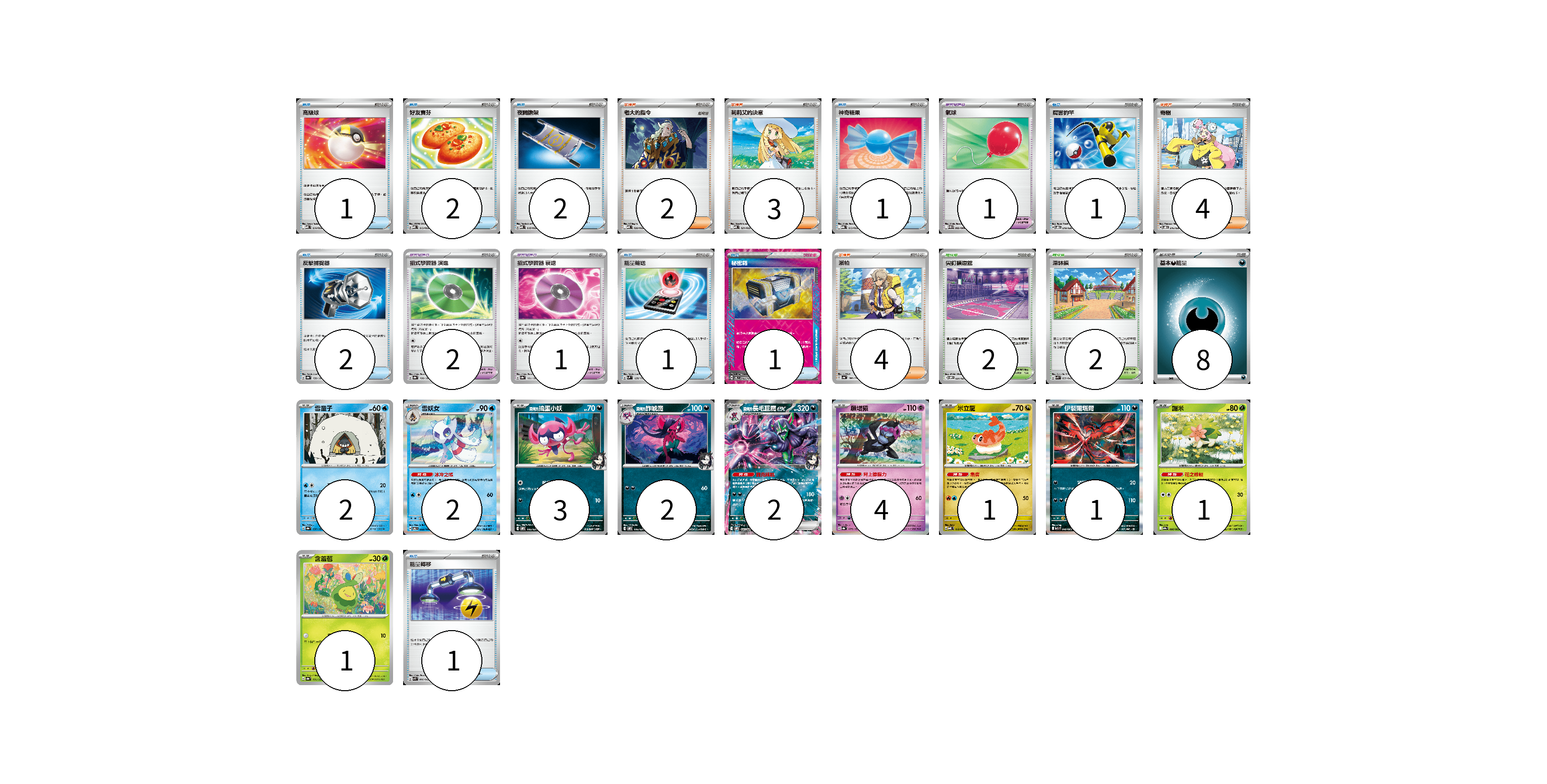 牌組構築方案 以此牌組為基礎新構築牌組 顯示卡面 顯示列表 寶可夢卡(19) 2 2 3 2 2 4 1 1 1 1 寶可夢道具(4) 1 2 1 物品卡(12) 1 2 2 1 1 2 1 1 1 支援者卡(13) 2 3 4 4 競技場卡(4) 2 2 能量卡(8) 8 寶可夢卡(19) 卡牌名稱 張數 卡牌名稱 張數 雪童子 SV8a 037/187 02 雪妖女 SV6 033/101 02 <瑪俐的>搗蛋小妖 SVOM 005/021 03 <瑪俐的>詐唬魔 SVOM 006/021 02 <瑪俐的>長毛巨魔ex SVOM 007/021 02 願增猿 SV8a 075/187 04 米立龍 MBD 010/022 01 伊裴爾塔爾 M1L 040/063 01 謝米 SV9a 006/063 01 含羞苞 SV8a 001/187 01 寶可夢道具(4) 卡牌名稱 張數 卡牌名稱 張數 氣球 SV11B 082/086 01 招式學習器 演進 SV8a 160/187 02 招式學習器 衰退 SV8a 161/187 01 物品卡(12) 卡牌名稱 張數 卡牌名稱 張數 高級球 MBD 014/022 01 好友寶芬 MBD 013/022 02 夜間擔架 MBD 016/022 02 神奇糖果 MBG 013/022 01 厲害釣竿 SVOD 010/020 01 反擊捕捉器 SV8a 139/187 02 能量輸送 SVM 128/175 01 秘密箱 SV6 092/101 01 能量轉移 SVK 008/042 01 支援者卡(13) 卡牌名稱 張數 卡牌名稱 張數 老大的指令 MBD 020/022 02 莉莉艾的決意 MBD 021/022 03 奇樹 SVOD 016/020 04 派帕 SV4a 180/190 04 競技場卡(4) 卡牌名稱 張數 卡牌名稱 張數 尖釘鎮道館 SVOM 021/021 02 深缽鎮 SVK 039/042 02 能量卡(8) 卡牌名稱 張數 卡牌名稱 張數 基本【惡】能量 MBG DAR 08 以此牌組為基礎新構築牌組 牌組編碼 oWQNUJ-QljDXn-ZzkbCl copy 列印牌組單 牌組編碼已複製 分享至SNS