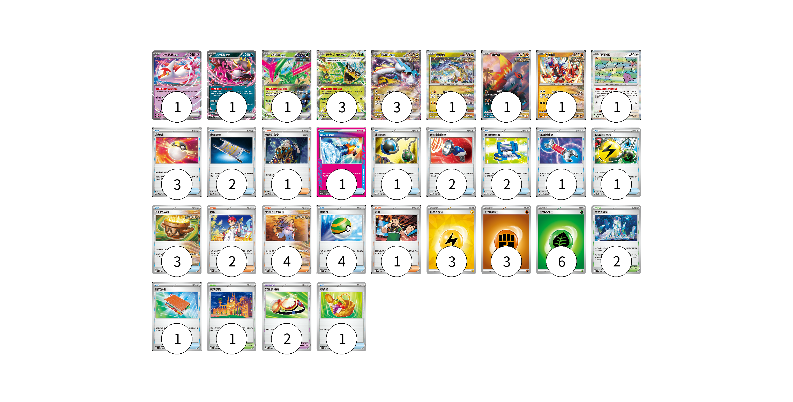 牌組構築方案 以此牌組為基礎新構築牌組 顯示卡面 顯示列表 寶可夢卡(13) 1 1 1 3 3 1 1 1 1 寶可夢道具(2) 2 物品卡(22) 3 2 1 1 2 2 1 1 3 4 1 1 支援者卡(8) 1 2 4 1 競技場卡(3) 2 1 能量卡(12) 3 3 6 寶可夢卡(13) 卡牌名稱 張數 卡牌名稱 張數 拉帝亞斯ex MBD 003/022 01 吉雉雞ex SVOD 004/020 01 鐵斑葉ex SV8a 016/187 01 厄鬼椪 碧草面具ex SV8a 020/187 03 猛雷鼓ex SV5K 053/071 03 猛雷鼓 SV7 075/102 01 爬地翅 SV4K 074/066 01 故勒頓 SV8 069/106 01 百變怪 SV4a 144/190 01 寶可夢道具(2) 卡牌名稱 張數 卡牌名稱 張數 安全護目鏡 SV2a 157/165 02 物品卡(22) 卡牌名稱 張數 卡牌名稱 張數 高級球 MBD 014/022 03 夜間擔架 MBD 016/022 02 頂尖捕捉器 MBG 014/022 01 能量回收 SVQL 012/022 01 寶可夢捕捉器 SVQL 017/022 02 寶可裝置3.0 SV11B 081/086 02 道具拆除器 SV11W 080/086 01 超級能量回收 SV8a 141/187 01 大地之容器 SV8a 143/187 03 巢穴球 SVM 133/175 04 朋友手冊 SVK 014/042 01 野餐籃 SV1V 071/078 01 支援者卡(8) 卡牌名稱 張數 卡牌名稱 張數 老大的指令 MBD 020/022 01 赤松 SV8a 163/187 02 奧琳博士的氣魄 SV8a 167/187 04 裁判 SVM 154/175 01 競技場卡(3) 卡牌名稱 張數 卡牌名稱 張數 零之大空洞 SV8a 182/187 02 夜間學院 SV6a 064/064 01 能量卡(12) 卡牌名稱 張數 卡牌名稱 張數 基本【雷】能量 SVQP LIG 03 基本【鬥】能量 SVTG FIG 03 基本【草】能量 SVTM GRA 06 以此牌組為基礎新構築牌組 牌組編碼 oXXnNN-YbaMOz-fKpPgL copy 列印牌組單 牌組編碼已複製 分享至SNS