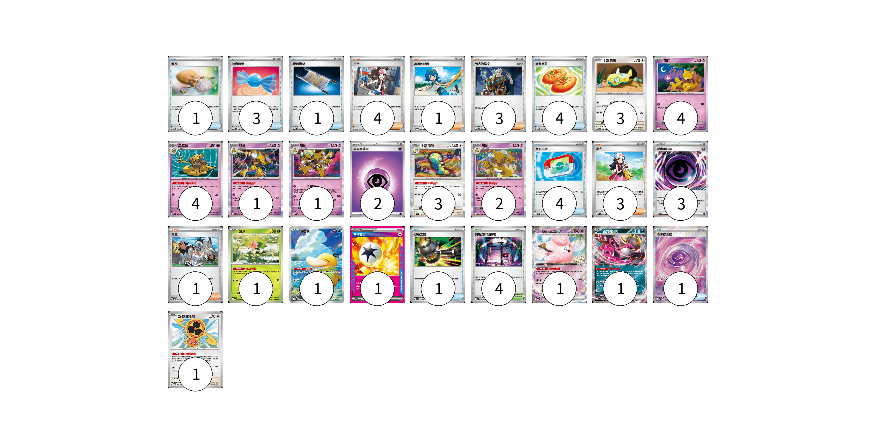 牌組構築方案 以此牌組為基礎新構築牌組 顯示卡面 顯示列表 寶可夢卡(23) 3 4 4 1 1 3 2 1 1 1 1 1 物品卡(15) 1 3 1 4 4 1 1 支援者卡(12) 4 1 3 3 1 競技場卡(4) 4 能量卡(6) 2 3 1 寶可夢卡(23) 卡牌名稱 張數 卡牌名稱 張數 土龍弟弟 SV9 078/100 03 凱西 M1S 036/063 04 勇基拉 M1S 037/063 04 胡地 M1S 038/063 01 胡地 SV8a 059/187 01 土龍節節 SV5K 057/071 03 胡地 M-P 058/M-P 02 謝米 SV9a 006/063 01 可達鴨 M2a 199/193 01 莉莉艾的皮皮ex M2a 060/193 01 吉雉雞ex M2a 114/193 01 旋轉洛托姆 M2a 139/193 01 物品卡(15) 卡牌名稱 張數 卡牌名稱 張數 聖灰 SV9a 056/063 01 神奇糖果 MBG 013/022 03 夜間擔架 MBD 016/022 01 好友寶芬 MBD 013/022 04 寶可平板 M3 070/080 04 改造之錘 M2a 148/193 01 奇跡修正檔 M3 104/080 01 支援者卡(12) 卡牌名稱 張數 卡牌名稱 張數 鬥子 SV11W 085/086 04 水蓮的照顧 SV5a 064/066 01 老大的指令 MBD 020/022 03 小光 M2 077/080 03 枇琶 SV5K 068/071 01 競技場卡(4) 卡牌名稱 張數 卡牌名稱 張數 對戰圓形競技場 M2 079/080 04 能量卡(6) 卡牌名稱 張數 卡牌名稱 張數 基本【超】能量 MBD PSY 02 感應【超】能量 M3 079/080 03 富裕能量 MC 740/742 01 以此牌組為基礎新構築牌組 牌組編碼 ocdmDz-yPNzCH-wmrboi copy 列印牌組單 牌組編碼已複製 分享至SNS