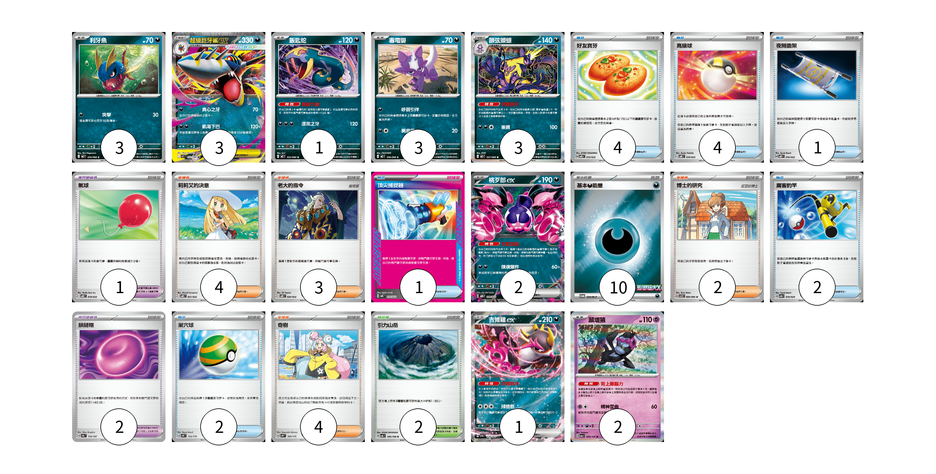 牌組構築方案 以此牌組為基礎新構築牌組 顯示卡面 顯示列表 寶可夢卡(18) 3 3 1 3 3 2 1 2 寶可夢道具(2) 2 物品卡(15) 4 4 1 1 1 2 2 支援者卡(13) 4 3 2 4 競技場卡(2) 2 能量卡(10) 10 寶可夢卡(18) 卡牌名稱 張數 卡牌名稱 張數 利牙魚 M2 050/080 03 超級巨牙鯊ex M2 051/080 03 飯匙蛇 M2 052/080 01 毒電嬰 M2 056/080 03 顫弦蠑螈 M2 057/080 03 桃歹郎ex MBG 009/022 02 吉雉雞ex SV6a 038/064 01 願增猿 SV6 055/101 02 寶可夢道具(2) 卡牌名稱 張數 卡牌名稱 張數 鎖鏈糬 SV8a 154/187 02 物品卡(15) 卡牌名稱 張數 卡牌名稱 張數 好友寶芬 MBD 013/022 04 高級球 MBD 014/022 04 夜間擔架 MBD 016/022 01 氣球 MBD 018/022 01 頂尖捕捉器 MBG 014/022 01 厲害釣竿 SVOD 010/020 02 巢穴球 SVM 133/175 02 支援者卡(13) 卡牌名稱 張數 卡牌名稱 張數 莉莉艾的決意 MBD 021/022 04 老大的指令 MBD 020/022 03 博士的研究 SV11B 084/086 02 奇樹 SVM 160/175 04 競技場卡(2) 卡牌名稱 張數 卡牌名稱 張數 引力山岳 SV8 106/106 02 能量卡(10) 卡牌名稱 張數 卡牌名稱 張數 基本【惡】能量 M-P 034/M-P 10 以此牌組為基礎新構築牌組 牌組編碼 ocqzIH-xdqhDX-wOjYbx copy 列印牌組單 牌組編碼已複製 分享至SNS