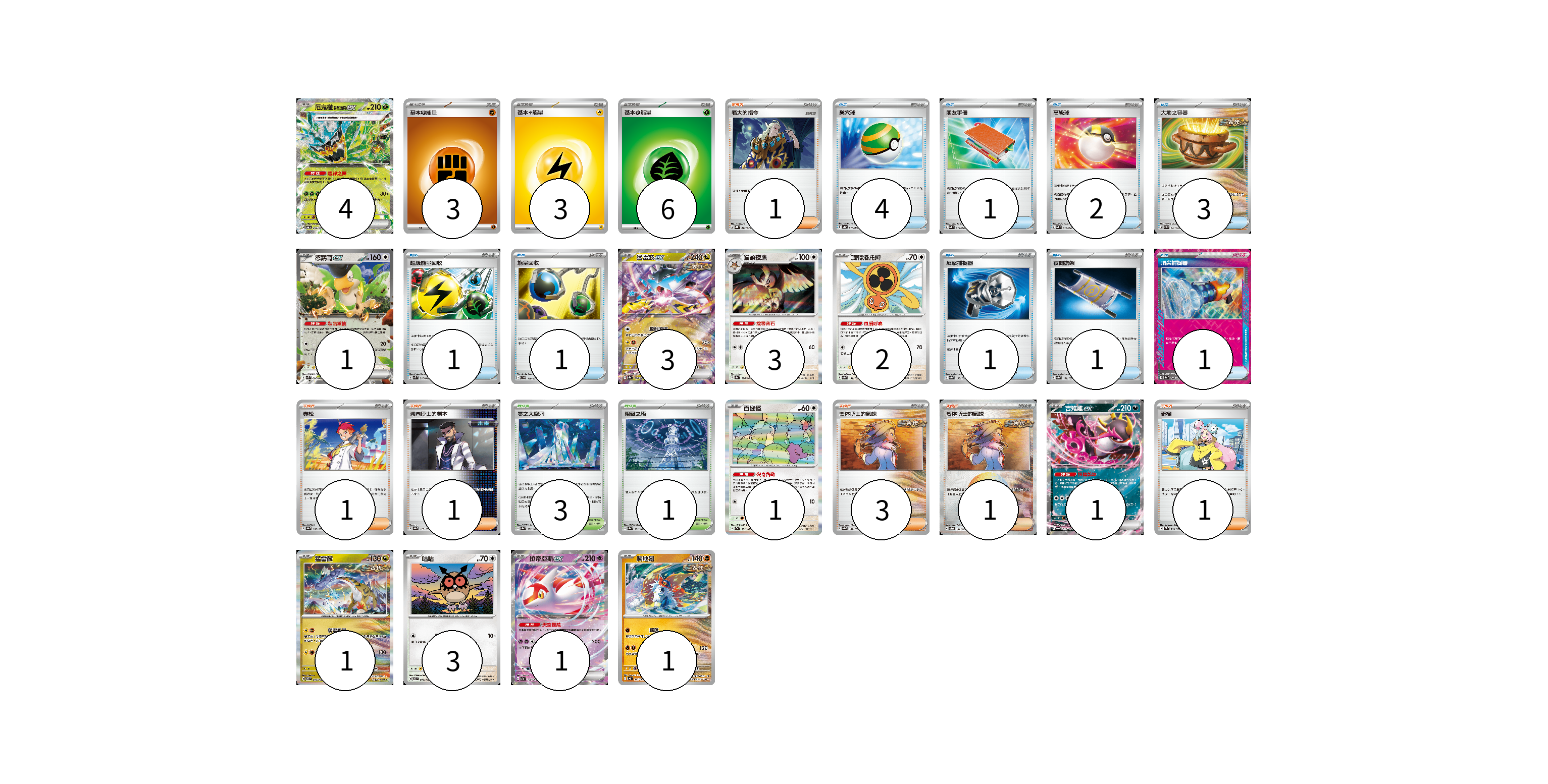 牌組構築方案 以此牌組為基礎新構築牌組 顯示卡面 顯示列表 寶可夢卡(21) 4 1 3 3 2 1 1 1 3 1 1 物品卡(15) 4 1 2 3 1 1 1 1 1 支援者卡(8) 1 1 1 3 1 1 競技場卡(4) 3 1 能量卡(12) 3 3 6 寶可夢卡(21) 卡牌名稱 張數 卡牌名稱 張數 厄鬼椪 碧草面具ex SV6 016/101 04 怒鸚哥ex SVK 006/042 01 猛雷鼓ex SV8a 124/187 03 貓頭夜鷹 SV8a 128/187 03 旋轉洛托姆 SV8a 131/187 02 百變怪 SV2a 132/165 01 吉雉雞ex SV6a 038/064 01 猛雷鼓 SV7 075/102 01 咕咕 SV7 076/102 03 拉帝亞斯ex SV7a 019/064 01 爬地翅 SV4K 041/066 01 物品卡(15) 卡牌名稱 張數 卡牌名稱 張數 巢穴球 SVHK 012/022 04 朋友手冊 SVK 014/042 01 高級球 SVK 018/042 02 大地之容器 SVK 012/042 03 超級能量回收 SVK 010/042 01 能量回收 SVD 110/139 01 反擊捕捉器 SV8a 139/187 01 夜間擔架 SV8a 151/187 01 頂尖捕捉器 SV8a 148/187 01 支援者卡(8) 卡牌名稱 張數 卡牌名稱 張數 老大的指令 SVHK 022/022 01 赤松 SV8a 163/187 01 弗圖博士的劇本 SV8a 175/187 01 奧琳博士的氣魄 SV8a 167/187 03 奧琳博士的氣魄 SV8a 167/187 01 奇樹 SV2D 069/071 01 競技場卡(4) 卡牌名稱 張數 卡牌名稱 張數 零之大空洞 SV8a 182/187 03 阻礙之塔 SV8a 181/187 01 能量卡(12) 卡牌名稱 張數 卡牌名稱 張數 基本【鬥】能量 SVHK FIG 03 基本【雷】能量 SVB LIG 03 基本【草】能量 SVF GRA 06 以此牌組為基礎新構築牌組 牌組編碼 ofvvUZ-JaouKH-WsxJUN copy 列印牌組單 牌組編碼已複製 分享至SNS