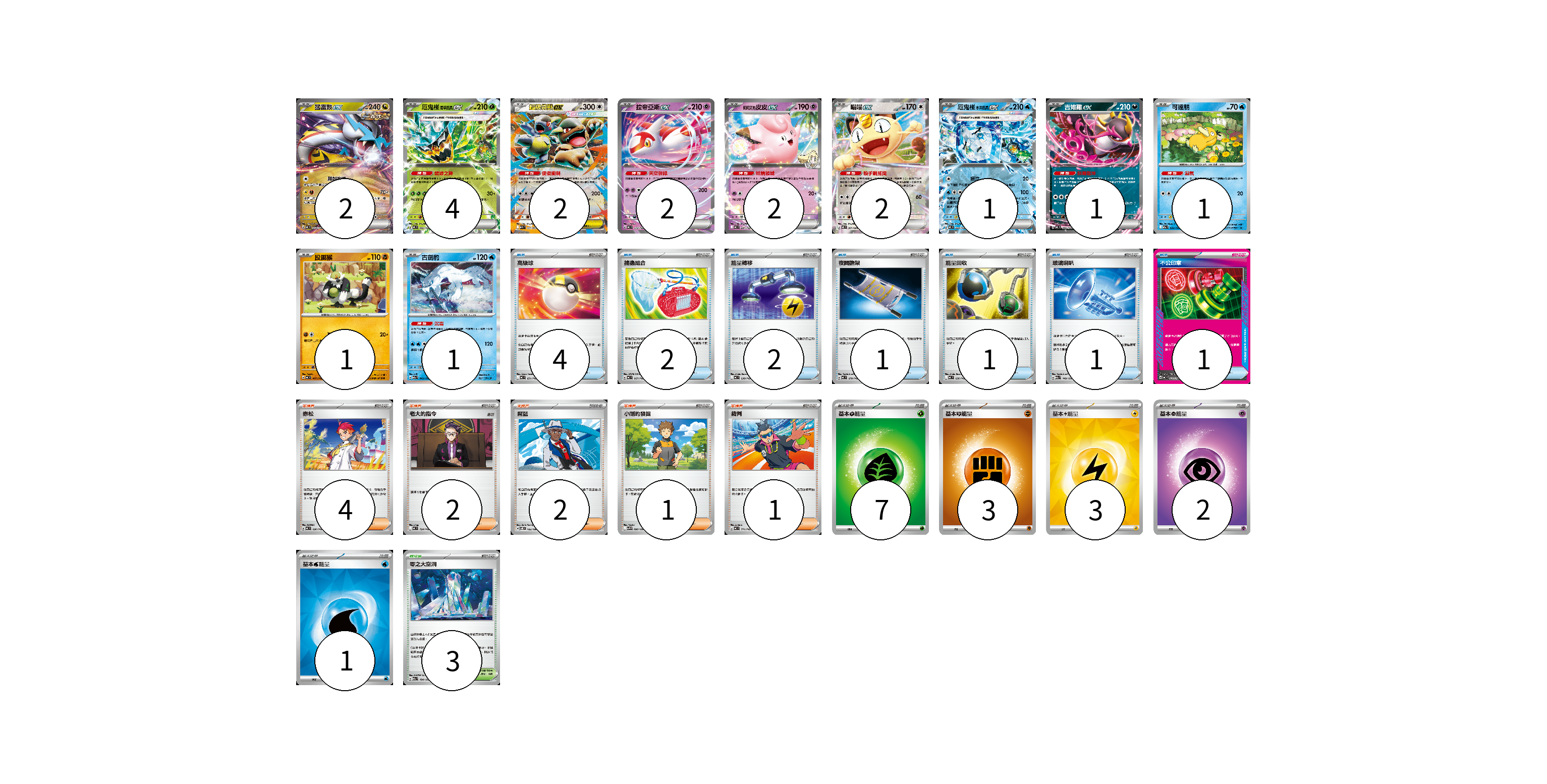 牌組構築方案 以此牌組為基礎新構築牌組 顯示卡面 顯示列表 寶可夢卡(19) 2 4 2 2 2 2 1 1 1 1 1 物品卡(12) 4 2 2 1 1 1 1 支援者卡(10) 4 2 2 1 1 競技場卡(3) 3 能量卡(16) 7 3 3 2 1 寶可夢卡(19) 卡牌名稱 張數 卡牌名稱 張數 猛雷鼓ex MC 554/742 02 厄鬼椪 碧草面具ex MC 082/742 04 超級袋獸ex M1S 051/063 02 拉帝亞斯ex MC 312/742 02 莉莉艾的皮皮ex MC 287/742 02 喵喵ex M3 061/080 02 厄鬼椪 水井面具ex MC 224/742 01 吉雉雞ex MC 489/742 01 可達鴨 M2a 032/193 01 投擲猴 MC 407/742 01 古劍豹 M2a 043/193 01 物品卡(12) 卡牌名稱 張數 卡牌名稱 張數 高級球 MC 651/742 04 捕蟲組合 MC 667/742 02 能量轉移 MC 638/742 02 夜間擔架 MC 670/742 01 能量回收 MC 636/742 01 玻璃喇叭 M2a 149/193 01 不公印章 MC 633/742 01 支援者卡(10) 卡牌名稱 張數 卡牌名稱 張數 赤松 MC 696/742 04 老大的指令 MC 724/742 02 席藍 SV8 102/106 02 小剛的發掘 SV9 096/100 01 裁判 MC 711/742 01 競技場卡(3) 卡牌名稱 張數 卡牌名稱 張數 零之大空洞 M2a 184/193 03 能量卡(16) 卡牌名稱 張數 卡牌名稱 張數 基本【草】能量 M-P GRA 07 基本【鬥】能量 M-P FIG 03 基本【雷】能量 SVQP LIG 03 基本【超】能量 M-P PSY 02 基本【水】能量 SVM WAT 01 以此牌組為基礎新構築牌組 牌組編碼 ohwtOD-YfZTGn-CDiYds copy 列印牌組單 牌組編碼已複製 分享至SNS