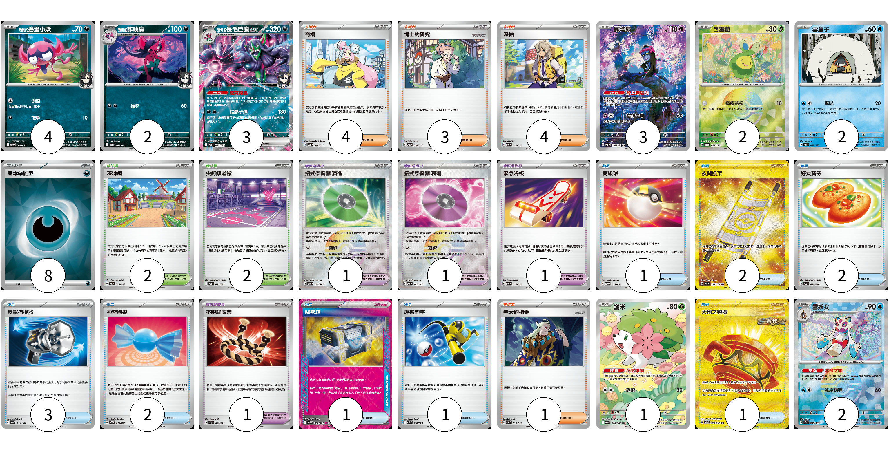牌組構築方案 以此牌組為基礎新構築牌組 顯示卡面 顯示列表 寶可夢卡(19) 4 2 3 3 2 2 1 2 寶可夢道具(4) 1 1 1 1 物品卡(13) 1 2 2 3 2 1 1 1 支援者卡(12) 4 3 4 1 競技場卡(4) 2 2 能量卡(8) 8 寶可夢卡(19) 卡牌名稱 張數 卡牌名稱 張數 <瑪俐的>搗蛋小妖 SVOM 005/021 04 <瑪俐的>詐唬魔 SVOM 006/021 02 <瑪俐的>長毛巨魔ex SVOM 007/021 03 願增猿 SV6 107/101 03 含羞苞 SV8a 001/187 02 雪童子 SV8a 037/187 02 謝米 SV9a 066/063 01 雪妖女 SV8a 038/187 02 寶可夢道具(4) 卡牌名稱 張數 卡牌名稱 張數 招式學習器 演進 SV8a 160/187 01 招式學習器 衰退 SV8a 161/187 01 緊急滑板 SVOD 015/020 01 不服輸頭帶 SVTL 016/021 01 物品卡(13) 卡牌名稱 張數 卡牌名稱 張數 高級球 SVOD 012/020 01 夜間擔架 SV8 137/106 02 好友寶芬 SVOD 011/020 02 反擊捕捉器 SV8a 139/187 03 神奇糖果 SVOD 013/020 02 秘密箱 SV6 092/101 01 厲害釣竿 SVOD 010/020 01 大地之容器 SV6a 093/064 01 支援者卡(12) 卡牌名稱 張數 卡牌名稱 張數 奇樹 SVOM 018/021 04 博士的研究 SVOM 019/021 03 派帕 SVOD 018/020 04 老大的指令 SVOD 019/020 01 競技場卡(4) 卡牌名稱 張數 卡牌名稱 張數 深缽鎮 SVK 039/042 02 尖釘鎮道館 SVOM 021/021 02 能量卡(8) 卡牌名稱 張數 卡牌名稱 張數 基本【惡】能量 SVOM DAR 08 以此牌組為基礎新構築牌組 牌組編碼 oiKJLo-nqftzi-NBTSZQ copy 列印牌組單 牌組編碼已複製 分享至SNS