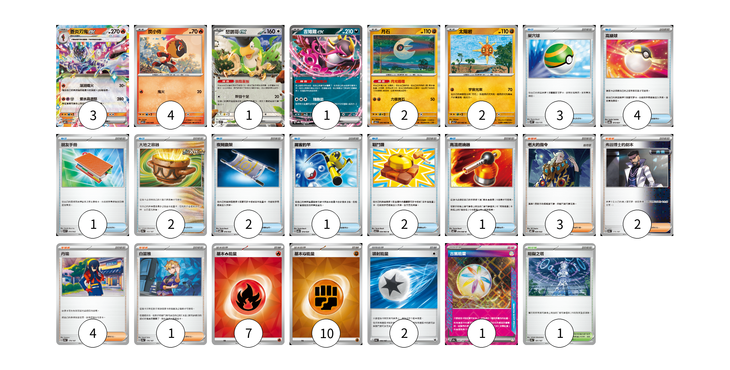 牌組構築方案 以此牌組為基礎新構築牌組 顯示卡面 顯示列表 寶可夢卡(13) 3 4 1 1 2 2 物品卡(16) 3 4 1 2 2 1 2 1 支援者卡(10) 3 2 4 1 競技場卡(1) 1 能量卡(20) 7 10 2 1 寶可夢卡(13) 卡牌名稱 張數 卡牌名稱 張數 蒼炎刃鬼ex SVPS 006/008 03 炭小侍 SVPS 005/008 04 怒鸚哥ex SVK 006/042 01 吉雉雞ex SVOM 009/021 01 月石 M1L 026/063 02 太陽岩 M1L 027/063 02 物品卡(16) 卡牌名稱 張數 卡牌名稱 張數 巢穴球 SVM 133/175 03 高級球 SVOM 013/021 04 朋友手冊 SVK 014/042 01 大地之容器 SV8a 143/187 02 夜間擔架 MBD 016/022 02 厲害釣竿 SVOD 010/020 01 戰鬥鑼 M1L 059/063 02 高溫燃燒器 M2 074/080 01 支援者卡(10) 卡牌名稱 張數 卡牌名稱 張數 老大的指令 MBD 020/022 03 弗圖博士的劇本 SV8a 175/187 02 丹瑜 SV8a 170/187 04 白蕾雅 SV8a 176/187 01 競技場卡(1) 卡牌名稱 張數 卡牌名稱 張數 阻礙之塔 SV8a 181/187 01 能量卡(20) 卡牌名稱 張數 卡牌名稱 張數 基本【火】能量 SVQL FIR 07 基本【鬥】能量 SVM FIG 10 噴射能量 SV8a 185/187 02 古舊能量 SV8a 187/187 01 以此牌組為基礎新構築牌組 牌組編碼 ojwIln-UVGeWz-kImGoE copy 列印牌組單 牌組編碼已複製 分享至SNS