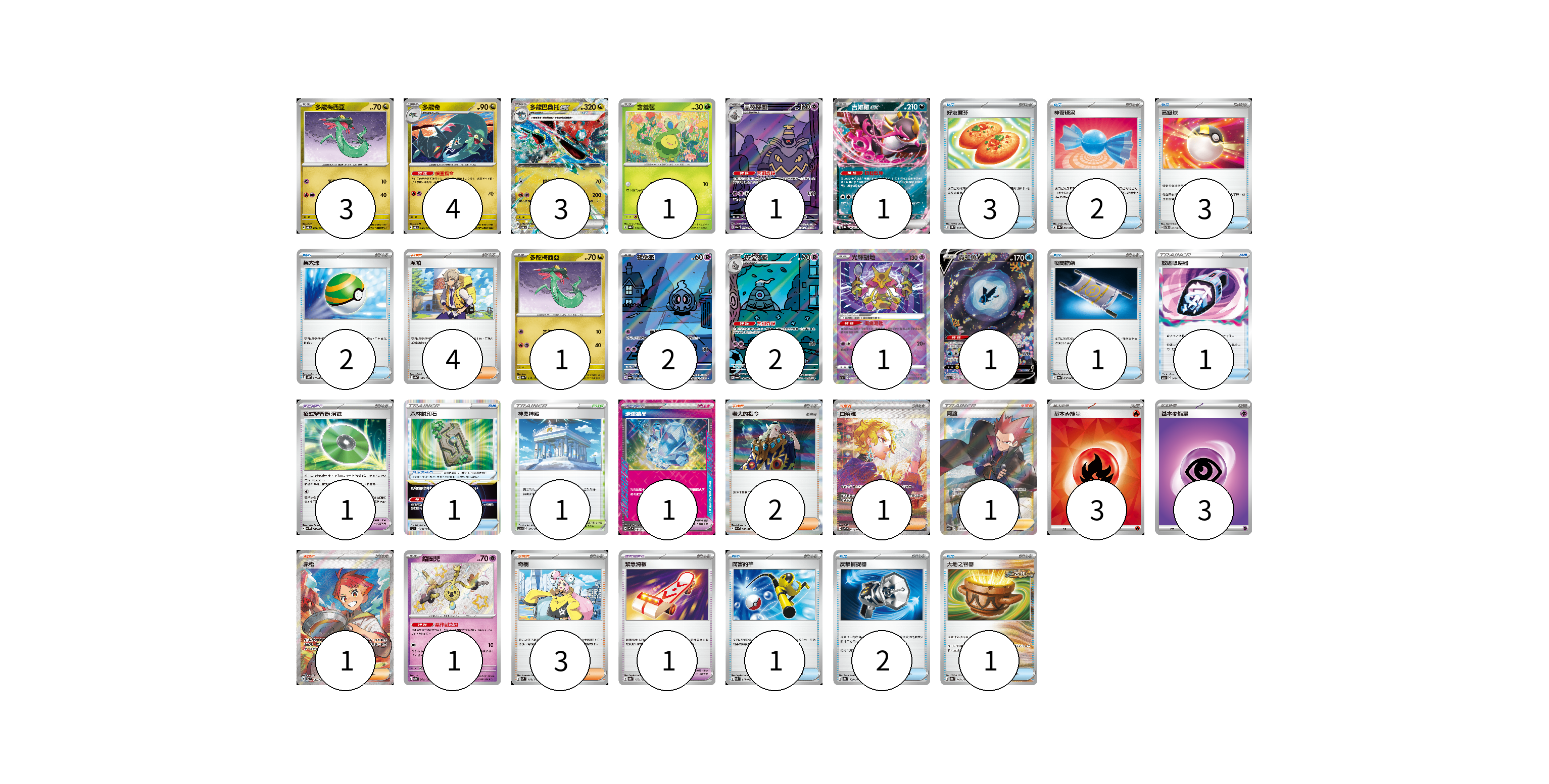 牌組構築方案 以此牌組為基礎新構築牌組 顯示卡面 顯示列表 寶可夢卡(21) 3 4 3 1 1 1 1 2 2 1 1 1 寶可夢道具(4) 1 1 1 1 物品卡(16) 3 2 3 2 1 1 1 2 1 支援者卡(12) 4 2 1 1 1 3 競技場卡(1) 1 能量卡(6) 3 3 寶可夢卡(21) 卡牌名稱 張數 卡牌名稱 張數 多龍梅西亞 SV6 079/101 03 多龍奇 SV6 080/101 04 多龍巴魯托ex SV6 081/101 03 含羞苞 SV8a 001/187 01 黑夜魔靈 SV6a 070/064 01 吉雉雞ex SV8a 104/187 01 多龍梅西亞 SV8a 118/187 01 夜巡靈 SV6a 068/064 02 彷徨夜靈 SV6a 069/064 02 光輝胡地 S11a 031/068 01 霓虹魚V S12a 216/172 01 鑰圈兒 SV4a 264/190 01 寶可夢道具(4) 卡牌名稱 張數 卡牌名稱 張數 招式學習器 演進 SV4M 063/066 01 森林封印石 S12 092/098 01 璀璨結晶 SV7 094/102 01 緊急滑板 SV8a 153/187 01 物品卡(16) 卡牌名稱 張數 卡牌名稱 張數 好友寶芬 SV5K 063/071 03 神奇糖果 SV3a 053/062 02 高級球 SVTH 011/018 03 巢穴球 SVHK 012/022 02 夜間擔架 SV6a 056/064 01 放逐吸塵器 S12a 144/172 01 厲害釣竿 SVK 011/042 01 反擊捕捉器 SV8a 139/187 02 大地之容器 SV8a 143/187 01 支援者卡(12) 卡牌名稱 張數 卡牌名稱 張數 派帕 SV4a 180/190 04 老大的指令 SV1a 069/073 02 白蕾雅 SV7 132/102 01 阿渡 S12 114/098 01 赤松 SV7 123/102 01 奇樹 SVM 160/175 03 競技場卡(1) 卡牌名稱 張數 卡牌名稱 張數 神奧神殿 S12a 169/172 01 能量卡(6) 卡牌名稱 張數 卡牌名稱 張數 基本【火】能量 SVM FIR 03 基本【超】能量 SVAW PSY 03 以此牌組為基礎新構築牌組 牌組編碼 omdjbR-AeIxPR-MVQGqf copy 列印牌組單 牌組編碼已複製 分享至SNS