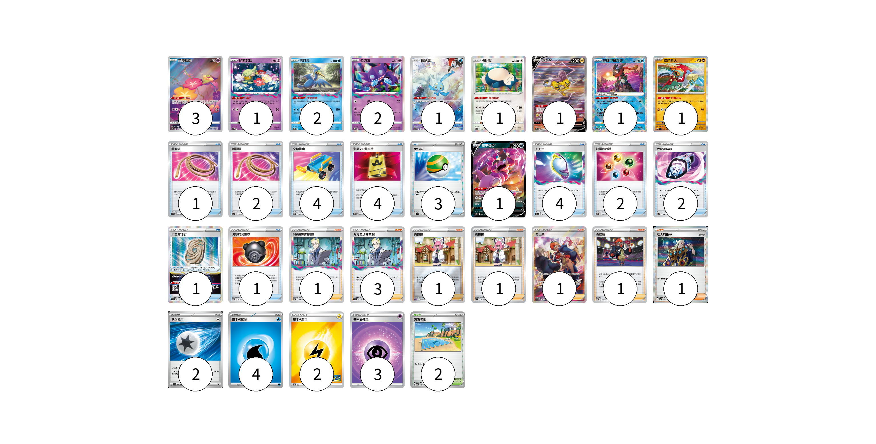 牌組構築方案 以此牌組為基礎新構築牌組 顯示卡面 顯示列表 寶可夢卡(14) 3 1 2 2 1 1 1 1 1 1 寶可夢道具(1) 1 物品卡(23) 1 2 4 4 3 4 2 2 1 支援者卡(9) 1 3 1 1 1 1 1 競技場卡(2) 2 能量卡(11) 2 4 2 3 寶可夢卡(14) 卡牌名稱 張數 卡牌名稱 張數 花療環環 S12a 187/172 03 花療環環 S12a 064/172 01 古月鳥 S11 033/100 02 勾魂眼 S11 044/100 02 瑪納霏 S12a 178/172 01 卡比獸 S10a 058/071 01 雷公V S12a 218/172 01 光輝甲賀忍蛙 S12a 033/172 01 摔角鷹人 SV1S 045/078 01 龍王蠍V S11 066/100 01 寶可夢道具(1) 卡牌名稱 張數 卡牌名稱 張數 天空封印石 S12a 146/172 01 物品卡(23) 卡牌名稱 張數 卡牌名稱 張數 離洞繩 SI 364/414 01 離洞繩 S8b 130/184 02 交替推車 S10D 060/067 04 對戰VIP參加證 S8 091/100 04 巢穴球 SV1S 070/078 03 幻想門 S12a 141/172 04 能量回收器 S5R 062/070 02 放逐吸塵器 S12a 144/172 02 洗翠的沉重球 S10P 062/067 01 支援者卡(9) 卡牌名稱 張數 卡牌名稱 張數 阿克羅瑪的實驗 S11 095/100 01 阿克羅瑪的實驗 S12a 148/172 03 克拉拉 SPD 014/020 01 克拉拉 SI 392/414 01 奇巴納 S12a 237/172 01 奇巴納 S8b 150/184 01 老大的指令 SV1a 069/073 01 競技場卡(2) 卡牌名稱 張數 卡牌名稱 張數 海灘場地 SV1S 078/078 02 能量卡(11) 卡牌名稱 張數 卡牌名稱 張數 噴射能量 SV1a 072/073 02 基本【水】能量 SVB WAT 04 基本雷能量 S8a LIG 02 基本【超】能量 SI PSY 03 以此牌組為基礎新構築牌組 牌組編碼 ouNZTH-NvyJBR-SBGlEn copy 列印牌組單 牌組編碼已複製 分享至SNS