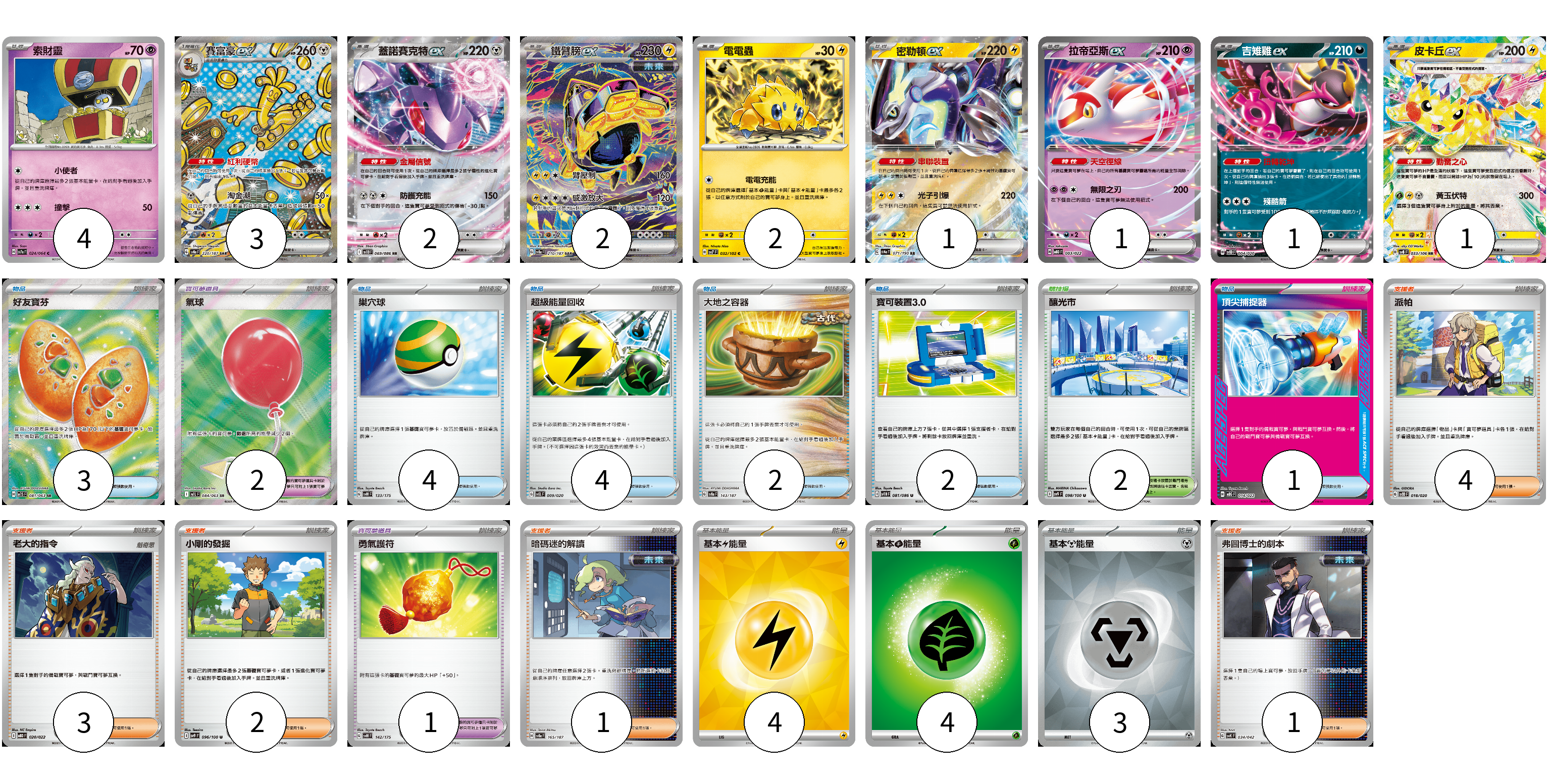 牌組構築方案 以此牌組為基礎新構築牌組 顯示卡面 顯示列表 寶可夢卡(17) 4 3 2 2 2 1 1 1 1 寶可夢道具(3) 2 1 物品卡(16) 3 4 4 2 2 1 支援者卡(11) 4 3 2 1 1 競技場卡(2) 2 能量卡(11) 4 4 3 寶可夢卡(17) 卡牌名稱 張數 卡牌名稱 張數 索財靈 SV7a 024/064 04 賽富豪ex SV8a 220/187 03 蓋諾賽克特ex SV11B 069/086 02 鐵臂膀ex SV8a 210/187 02 電電蟲 SV7 032/102 02 密勒頓ex SV4a 071/190 01 拉帝亞斯ex MBD 003/022 01 吉雉雞ex SVOD 004/020 01 皮卡丘ex SV8 033/106 01 寶可夢道具(3) 卡牌名稱 張數 卡牌名稱 張數 氣球 M1L 084/063 02 勇氣護符 SVM 142/175 01 物品卡(16) 卡牌名稱 張數 卡牌名稱 張數 好友寶芬 M1S 081/063 03 巢穴球 SVM 133/175 04 超級能量回收 SVEL 009/020 04 大地之容器 SV8a 143/187 02 寶可裝置3.0 SV11B 081/086 02 頂尖捕捉器 MBG 014/022 01 支援者卡(11) 卡牌名稱 張數 卡牌名稱 張數 派帕 SVOD 018/020 04 老大的指令 MBD 020/022 03 小剛的發掘 SV9 096/100 02 暗碼迷的解讀 SV8a 165/187 01 弗圖博士的劇本 SVK 034/042 01 競技場卡(2) 卡牌名稱 張數 卡牌名稱 張數 釀光市 SV9 098/100 02 能量卡(11) 卡牌名稱 張數 卡牌名稱 張數 基本【雷】能量 SVQP LIG 04 基本【草】能量 M-P GRA 04 基本【鋼】能量 SVOD MET 03 以此牌組為基礎新構築牌組 牌組編碼 oxvogl-UiCDcX-fKCAbH copy 列印牌組單 牌組編碼已複製 分享至SNS