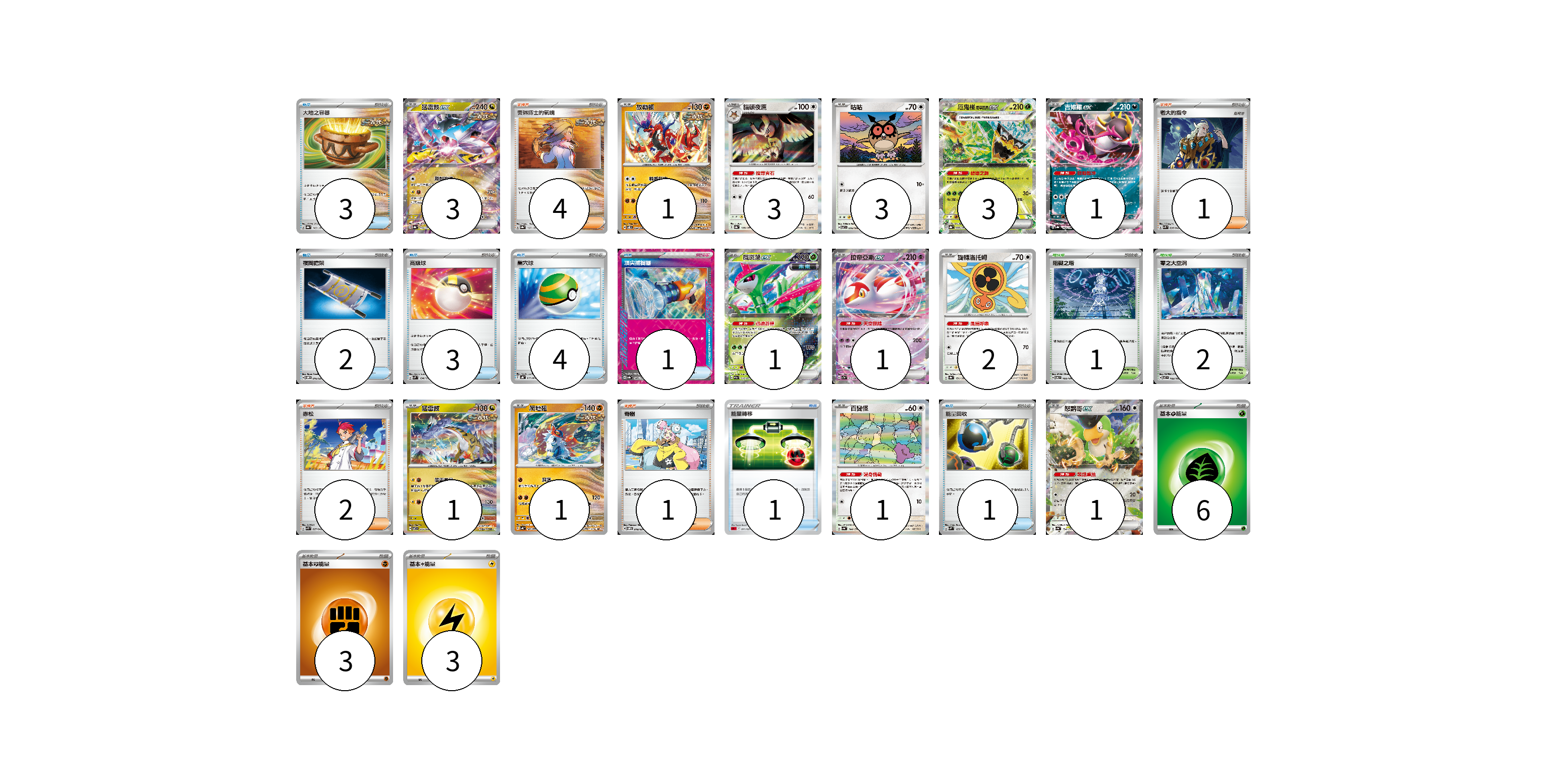 牌組構築方案 以此牌組為基礎新構築牌組 顯示卡面 顯示列表 寶可夢卡(22) 3 1 3 3 3 1 1 1 2 1 1 1 1 物品卡(15) 3 2 3 4 1 1 1 支援者卡(8) 4 1 2 1 競技場卡(3) 1 2 能量卡(12) 6 3 3 寶可夢卡(22) 卡牌名稱 張數 卡牌名稱 張數 猛雷鼓ex SV8a 124/187 03 故勒頓 SV8 069/106 01 貓頭夜鷹 SV8a 128/187 03 咕咕 SV7 076/102 03 厄鬼椪 碧草面具ex SV8a 020/187 03 吉雉雞ex SV8a 104/187 01 鐵斑葉ex SV5M 016/071 01 拉帝亞斯ex SV7a 019/064 01 旋轉洛托姆 SV8a 131/187 02 猛雷鼓 SV7 075/102 01 爬地翅 SV4K 041/066 01 百變怪 SV4a 144/190 01 怒鸚哥ex SV4a 154/190 01 物品卡(15) 卡牌名稱 張數 卡牌名稱 張數 大地之容器 SV8a 143/187 03 夜間擔架 SVOM 016/021 02 高級球 SVM 134/175 03 巢穴球 SVHK 012/022 04 頂尖捕捉器 SV8a 148/187 01 能量轉移 SDL 011/021 01 能量回收 SVM 125/175 01 支援者卡(8) 卡牌名稱 張數 卡牌名稱 張數 奧琳博士的氣魄 SV8a 167/187 04 老大的指令 SVK 036/042 01 赤松 SVK 027/042 02 奇樹 SVOM 018/021 01 競技場卡(3) 卡牌名稱 張數 卡牌名稱 張數 阻礙之塔 SV6 100/101 01 零之大空洞 SV7 102/102 02 能量卡(12) 卡牌名稱 張數 卡牌名稱 張數 基本【草】能量 SVF GRA 06 基本【鬥】能量 SVF FIG 03 基本【雷】能量 SVF LIG 03 以此牌組為基礎新構築牌組 牌組編碼 pAuhRp-TkvlPh-CnZJdC copy 列印牌組單 牌組編碼已複製 分享至SNS