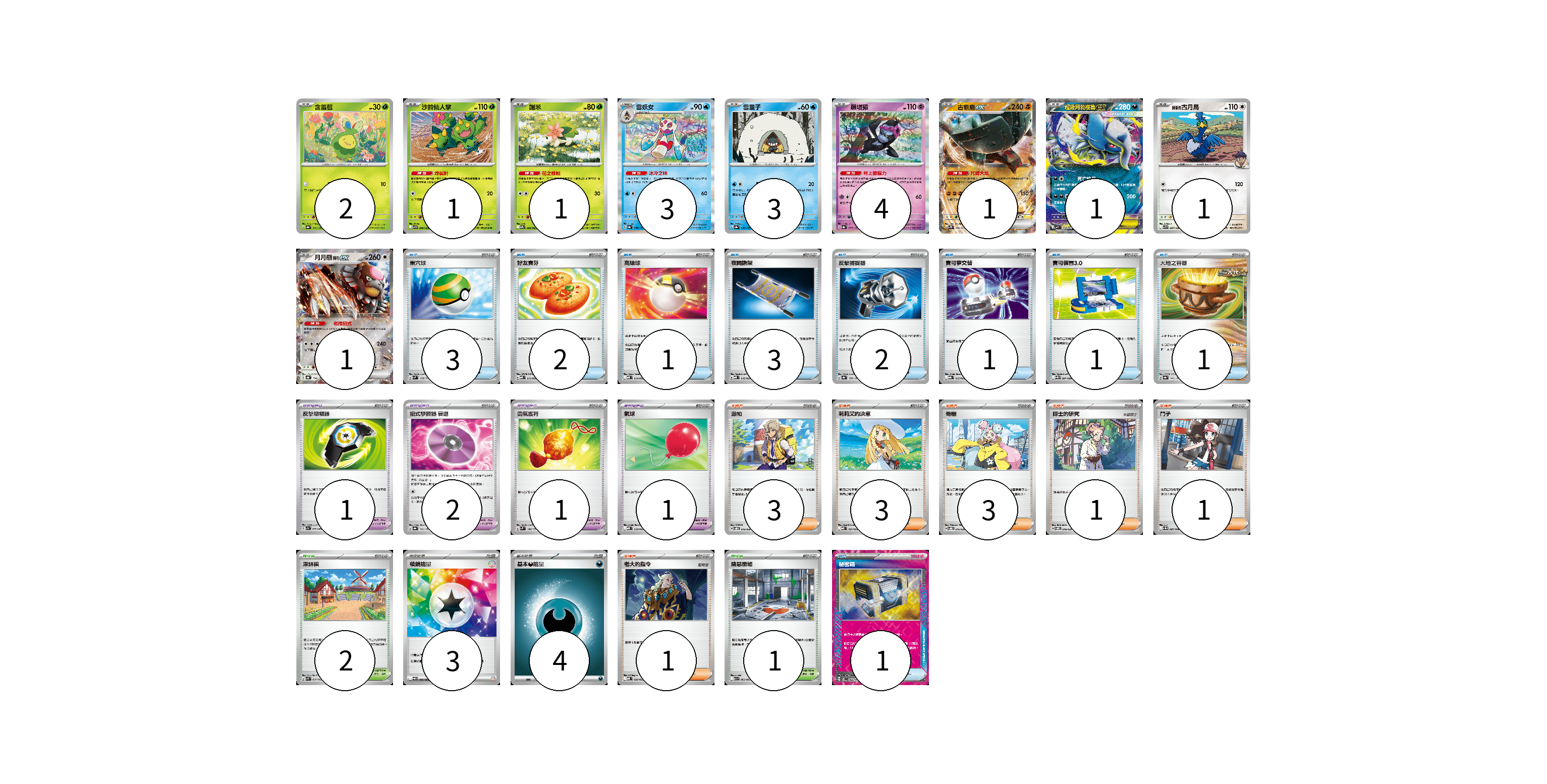 牌組構築方案 以此牌組為基礎新構築牌組 顯示卡面 顯示列表 寶可夢卡(18) 2 1 1 3 3 4 1 1 1 1 寶可夢道具(4) 1 2 1 物品卡(16) 3 2 1 3 2 1 1 1 1 1 支援者卡(12) 3 3 3 1 1 1 競技場卡(3) 2 1 能量卡(7) 3 4 寶可夢卡(18) 卡牌名稱 張數 卡牌名稱 張數 含羞苞 SV8a 001/187 02 沙鈴仙人掌 SV9 006/100 01 謝米 SV9a 006/063 01 雪妖女 SV8a 038/187 03 雪童子 SV8a 037/187 03 願增猿 SV8a 075/187 04 古鼎鹿ex SV2D 049/071 01 超級阿勃梭魯ex M1L 038/063 01 赫普的古月鳥 SV9 087/100 01 月月熊 赫月ex SV8a 134/187 01 寶可夢道具(4) 卡牌名稱 張數 卡牌名稱 張數 反擊增幅器 SV7a 059/064 01 招式學習器 衰退 SV8a 161/187 02 勇氣護符 SVM 142/175 01 物品卡(16) 卡牌名稱 張數 卡牌名稱 張數 巢穴球 SVM 133/175 03 好友寶芬 MBD 013/022 02 高級球 MBD 014/022 01 夜間擔架 MBD 016/022 03 反擊捕捉器 SV8a 139/187 02 寶可夢交替 MBG 015/022 01 寶可裝置3.0 SV11B 081/086 01 大地之容器 SV8a 143/187 01 氣球 MBD 018/022 01 秘密箱 SV6 092/101 01 支援者卡(12) 卡牌名稱 張數 卡牌名稱 張數 派帕 SVOD 018/020 03 莉莉艾的決意 MBD 021/022 03 奇樹 SVOD 016/020 03 博士的研究 SVOM 019/021 01 鬥子 SV11W 085/086 01 老大的指令 MBD 020/022 01 競技場卡(3) 卡牌名稱 張數 卡牌名稱 張數 深缽鎮 SVK 039/042 02 險惡廢墟 M1L 063/063 01 能量卡(7) 卡牌名稱 張數 卡牌名稱 張數 稜鏡能量 SV11B 086/086 03 基本【惡】能量 MBG DAR 04 以此牌組為基礎新構築牌組 牌組編碼 pCdXol-yfbird-dwOLvr copy 列印牌組單 牌組編碼已複製 分享至SNS
