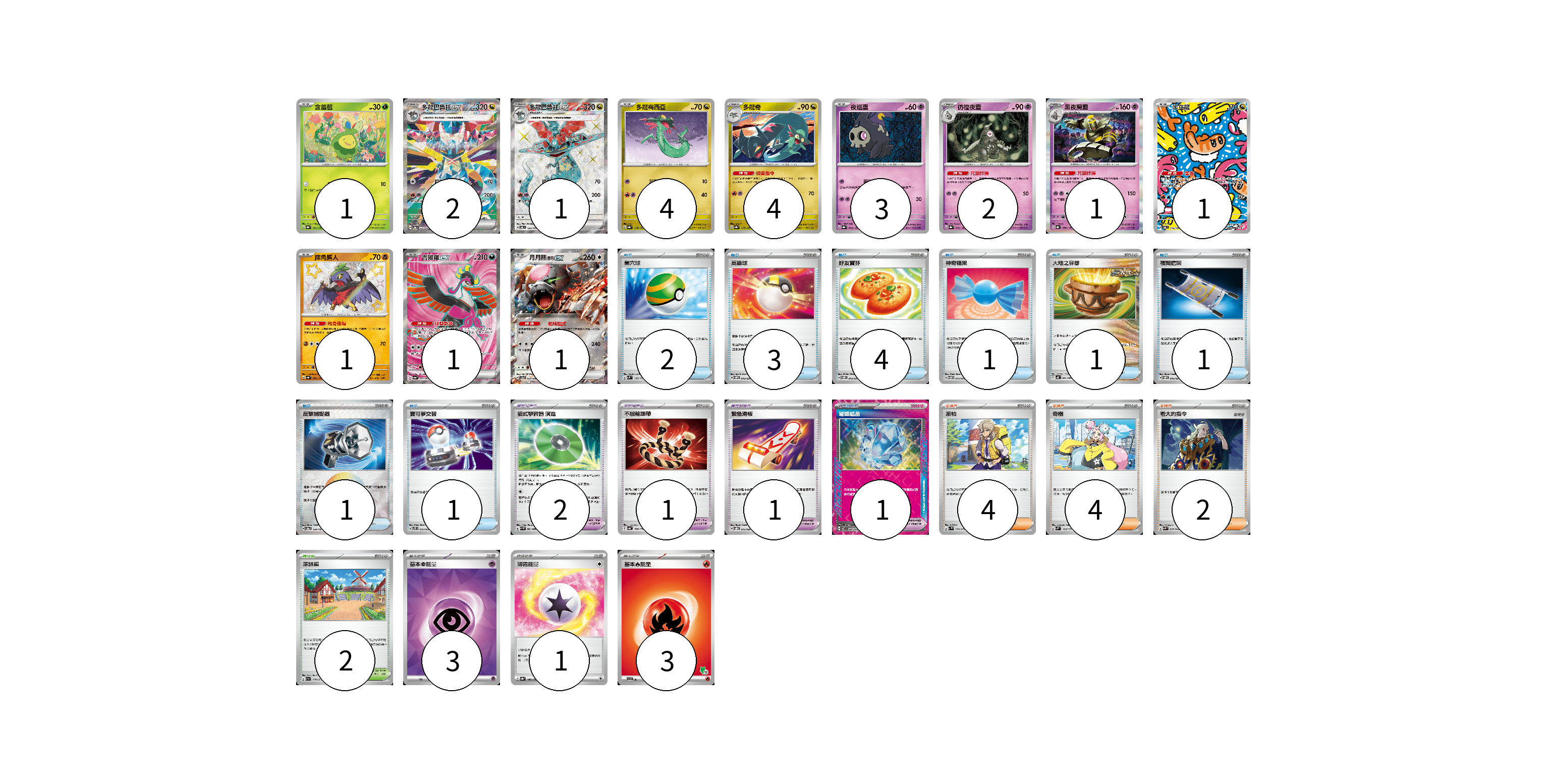 牌組構築方案 以此牌組為基礎新構築牌組 顯示卡面 顯示列表 寶可夢卡(22) 1 2 1 4 4 3 2 1 1 1 1 1 寶可夢道具(5) 2 1 1 1 物品卡(14) 2 3 4 1 1 1 1 1 支援者卡(10) 4 4 2 競技場卡(2) 2 能量卡(7) 3 1 3 寶可夢卡(22) 卡牌名稱 張數 卡牌名稱 張數 含羞苞 SV8a 001/187 01 多龍巴魯托ex SV8a 221/187 02 多龍巴魯托ex SV6 120/101 01 多龍梅西亞 SV8a 118/187 04 多龍奇 SV8a 119/187 04 夜巡靈 SV8a 064/187 03 彷徨夜靈 SV8a 065/187 02 黑夜魔靈 SV8a 066/187 01 米立龍 SV6 112/101 01 摔角鷹人 SV4a 282/190 01 吉雉雞ex SV6a 081/064 01 月月熊 赫月 ex SV5a 052/066 01 寶可夢道具(5) 卡牌名稱 張數 卡牌名稱 張數 招式學習器 演進 SV4M 063/066 02 不服輸頭帶 SV4a 168/190 01 緊急滑板 SVOD 015/020 01 璀璨結晶 SV7 094/102 01 物品卡(14) 卡牌名稱 張數 卡牌名稱 張數 巢穴球 SVM 133/175 02 高級球 SVOM 013/021 03 好友寶芬 SVOM 012/021 04 神奇糖果 SVTM 013/022 01 大地之容器 SV4K 060/066 01 夜間擔架 SVOM 016/021 01 反擊捕捉器 SV8a 139/187 01 寶可夢交替 SVTS 016/022 01 支援者卡(10) 卡牌名稱 張數 卡牌名稱 張數 派帕 SV1V 076/078 04 奇樹 SVM 160/175 04 老大的指令 SVK 036/042 02 競技場卡(2) 卡牌名稱 張數 卡牌名稱 張數 深缽鎮 SV1a 070/073 02 能量卡(7) 卡牌名稱 張數 卡牌名稱 張數 基本【超】能量 SVOD PSY 03 薄霧能量 SV8a 186/187 01 基本【火】能量 SVI FIR 03 以此牌組為基礎新構築牌組 牌組編碼 pDwdyg-NaPPRd-OpxkKA copy 列印牌組單 牌組編碼已複製 分享至SNS