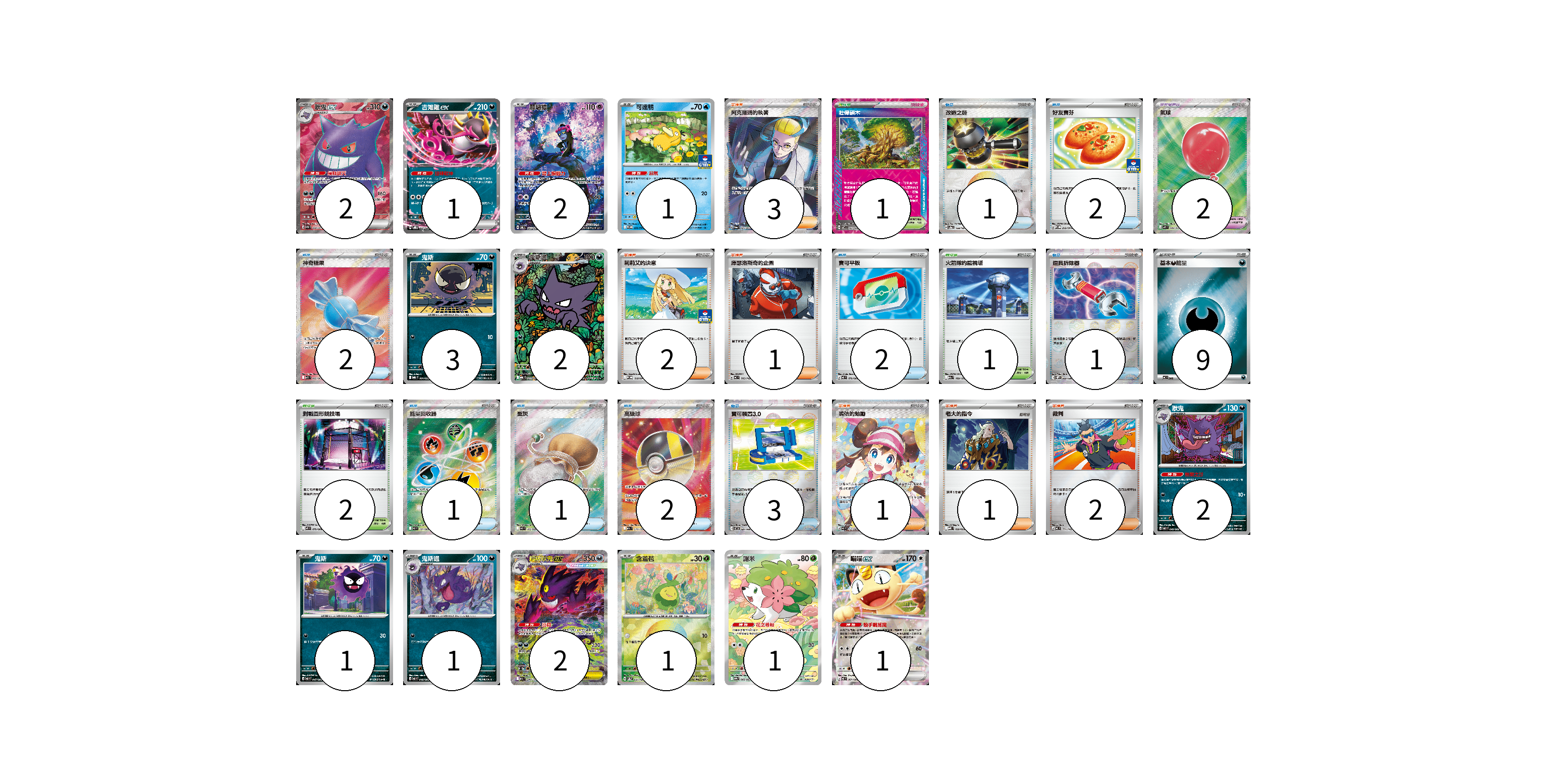 牌組構築方案 以此牌組為基礎新構築牌組 顯示卡面 顯示列表 寶可夢卡(20) 2 1 2 1 3 2 2 1 1 2 1 1 1 寶可夢道具(2) 2 物品卡(15) 1 2 2 2 1 1 1 2 3 支援者卡(10) 3 2 1 1 1 2 競技場卡(4) 1 1 2 能量卡(9) 9 寶可夢卡(20) 卡牌名稱 張數 卡牌名稱 張數 耿鬼ex SV5K 088/071 02 吉雉雞ex SVOD 004/020 01 願增猿 SV6 107/101 02 可達鴨 SV-P 220/SV-P 01 鬼斯 MBG 001/022 03 鬼斯通 MBG 023/022 02 耿鬼 M3 049/080 02 鬼斯 M3 047/080 01 鬼斯通 M3 048/080 01 超級耿鬼ex M2a 240/193 02 含羞苞 SV8a 001/187 01 謝米 SV9a 066/063 01 喵喵ex M3 061/080 01 寶可夢道具(2) 卡牌名稱 張數 卡牌名稱 張數 氣球 M1L 084/063 02 物品卡(15) 卡牌名稱 張數 卡牌名稱 張數 改造之錘 SV8a 138/187 01 好友寶芬 SV-P 212/SV-P 02 神奇糖果 M1S 082/063 02 寶可平板 M3 070/080 02 道具拆除器 SV11W 080/086 01 能量回收器 M3 101/080 01 聖灰 M3 102/080 01 高級球 M2a 216/193 02 寶可裝置3.0 SV11B 081/086 03 支援者卡(10) 卡牌名稱 張數 卡牌名稱 張數 阿克羅瑪的執著 SV6a 083/064 03 莉莉艾的決意 M-P 018/M-P 02 庫瑟洛斯奇的企圖 MC 705/742 01 鳴依的勉勵 M3 115/080 01 老大的指令 MBD 020/022 01 裁判 MC 711/742 02 競技場卡(4) 卡牌名稱 張數 卡牌名稱 張數 壯偉碩木 SV7 101/102 01 火箭隊的監視塔 M2a 189/193 01 對戰圓形競技場 M2 079/080 02 能量卡(9) 卡牌名稱 張數 卡牌名稱 張數 基本【惡】能量 MC DAR 09 以此牌組為基礎新構築牌組 牌組編碼 pFfZgC-tdrucY-MpkqNh copy 列印牌組單 牌組編碼已複製 分享至SNS