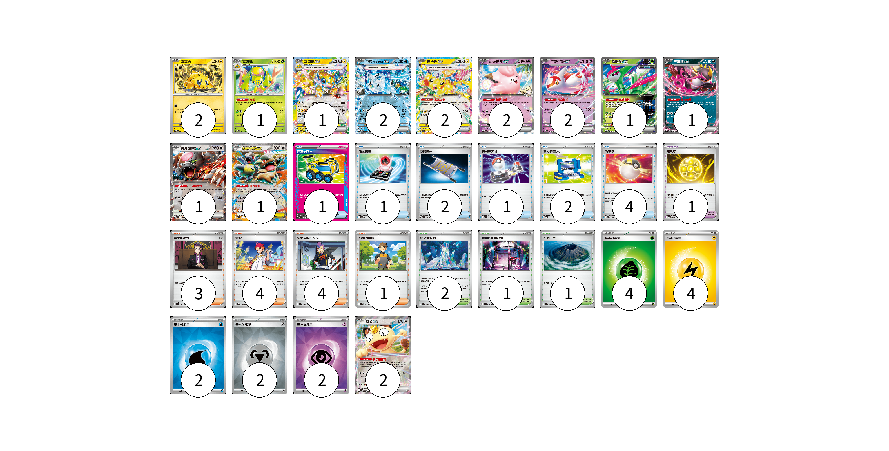 牌組構築方案 以此牌組為基礎新構築牌組 顯示卡面 顯示列表 寶可夢卡(18) 2 1 1 2 2 2 2 1 1 1 1 2 寶可夢道具(1) 1 物品卡(11) 1 1 2 1 2 4 支援者卡(12) 3 4 4 1 競技場卡(4) 2 1 1 能量卡(14) 4 4 2 2 2 寶可夢卡(18) 卡牌名稱 張數 卡牌名稱 張數 電電蟲 MC 254/742 02 電蜘蛛 MC 050/742 01 電蜘蛛ex MC 255/742 01 厄鬼椪 水井面具ex MC 224/742 02 皮卡丘ex M2a 044/193 02 莉莉艾的皮皮ex MC 287/742 02 拉帝亞斯ex MC 312/742 02 鐵斑葉ex MC 077/742 01 吉雉雞ex MC 489/742 01 月月熊 赫月 ex MC 625/742 01 超級袋獸ex M1S 051/063 01 喵喵ex M3 061/080 02 寶可夢道具(1) 卡牌名稱 張數 卡牌名稱 張數 電氣球 M2a 163/193 01 物品卡(11) 卡牌名稱 張數 卡牌名稱 張數 貴重手推車 MC 658/742 01 能量輸送 MC 639/742 01 夜間擔架 MC 670/742 02 寶可夢交替 MC 663/742 01 寶可裝置3.0 MC 660/742 02 高級球 MC 651/742 04 支援者卡(12) 卡牌名稱 張數 卡牌名稱 張數 老大的指令 MC 724/742 03 赤松 MC 696/742 04 火箭隊的拉姆達 MC 734/742 04 小剛的發掘 SV9 096/100 01 競技場卡(4) 卡牌名稱 張數 卡牌名稱 張數 零之大空洞 M2a 184/193 02 對戰圓形競技場 M2 079/080 01 引力山岳 M2a 183/193 01 能量卡(14) 卡牌名稱 張數 卡牌名稱 張數 基本【草】能量 MJ GRA 04 基本【雷】能量 MJ LIG 04 基本【水】能量 SVM WAT 02 基本【鋼】能量 SVOD MET 02 基本【超】能量 SVOD PSY 02 以此牌組為基礎新構築牌組 牌組編碼 pIAIGC-vLsAym-eCWnPr copy 列印牌組單 牌組編碼已複製 分享至SNS