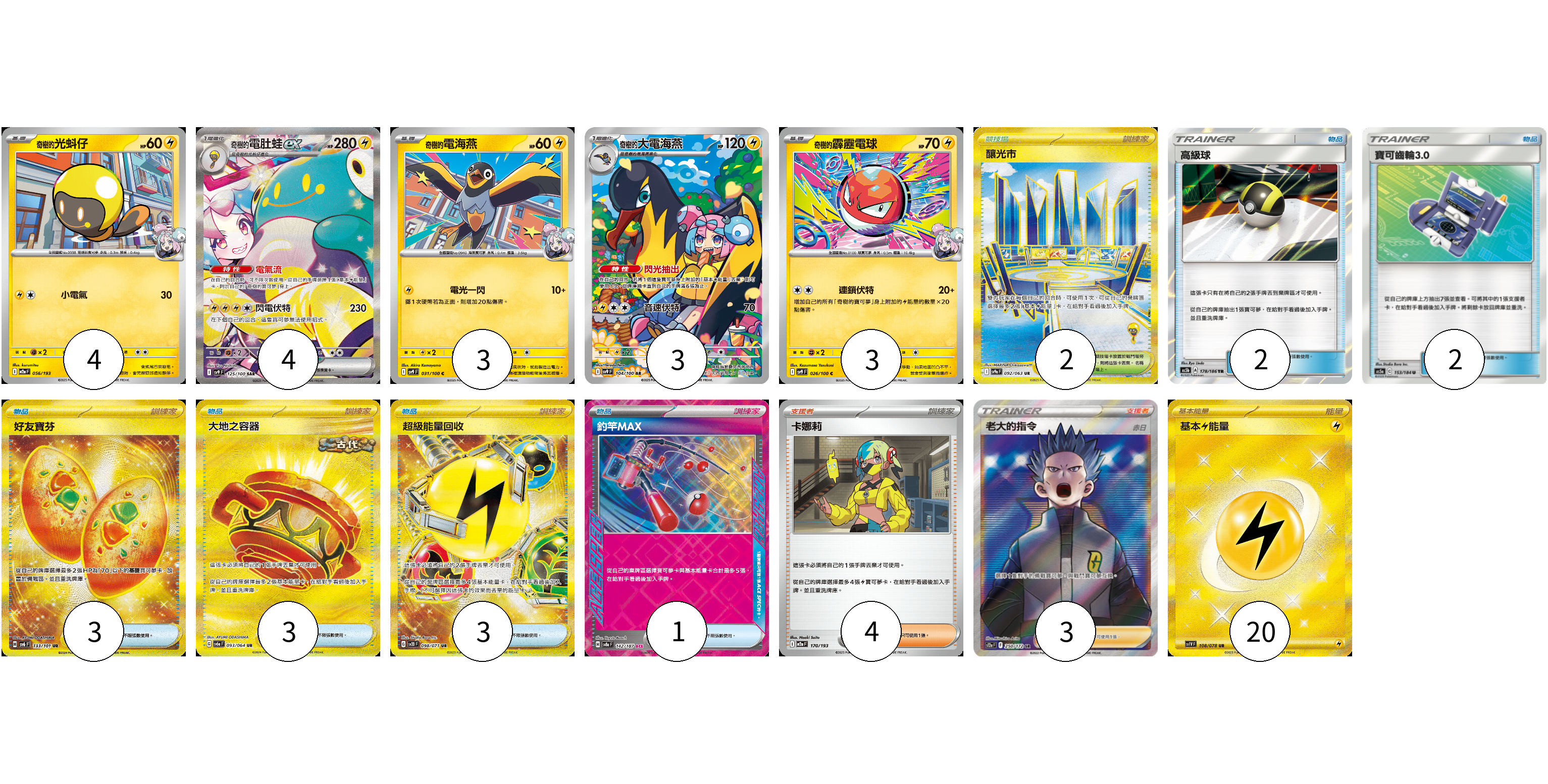 牌組構築方案 以此牌組為基礎新構築牌組 顯示卡面 顯示列表 寶可夢卡(17) 4 4 3 3 3 物品卡(14) 2 2 3 3 3 1 支援者卡(7) 4 3 競技場卡(2) 2 能量卡(20) 20 寶可夢卡(17) 卡牌名稱 張數 卡牌名稱 張數 奇樹的光蚪仔 M2a 056/193 04 奇樹的電肚蛙ex SV9 125/100 04 奇樹的電海燕 SV9 031/100 03 奇樹的大電海燕 SV9 104/100 03 奇樹的霹靂電球 SV9 026/100 03 物品卡(14) 卡牌名稱 張數 卡牌名稱 張數 高級球 AS5b 178/186 02 寶可齒輪3.0 AS5a 153/184 02 好友寶芬 SV6 133/101 03 大地之容器 SV6a 093/064 03 超級能量回收 SV2D 098/071 03 釣竿MAX SV8a 142/187 01 支援者卡(7) 卡牌名稱 張數 卡牌名稱 張數 卡娜莉 M2a 170/193 04 老大的指令(赤日) S12a 250/172 03 競技場卡(2) 卡牌名稱 張數 卡牌名稱 張數 釀光市 SV9a 092/063 02 能量卡(20) 卡牌名稱 張數 卡牌名稱 張數 基本【雷】能量 SV1V 108/078 20 以此牌組為基礎新構築牌組 牌組編碼 pKQrTK-bScNjn-gRNekf copy 列印牌組單 牌組編碼已複製 分享至SNS