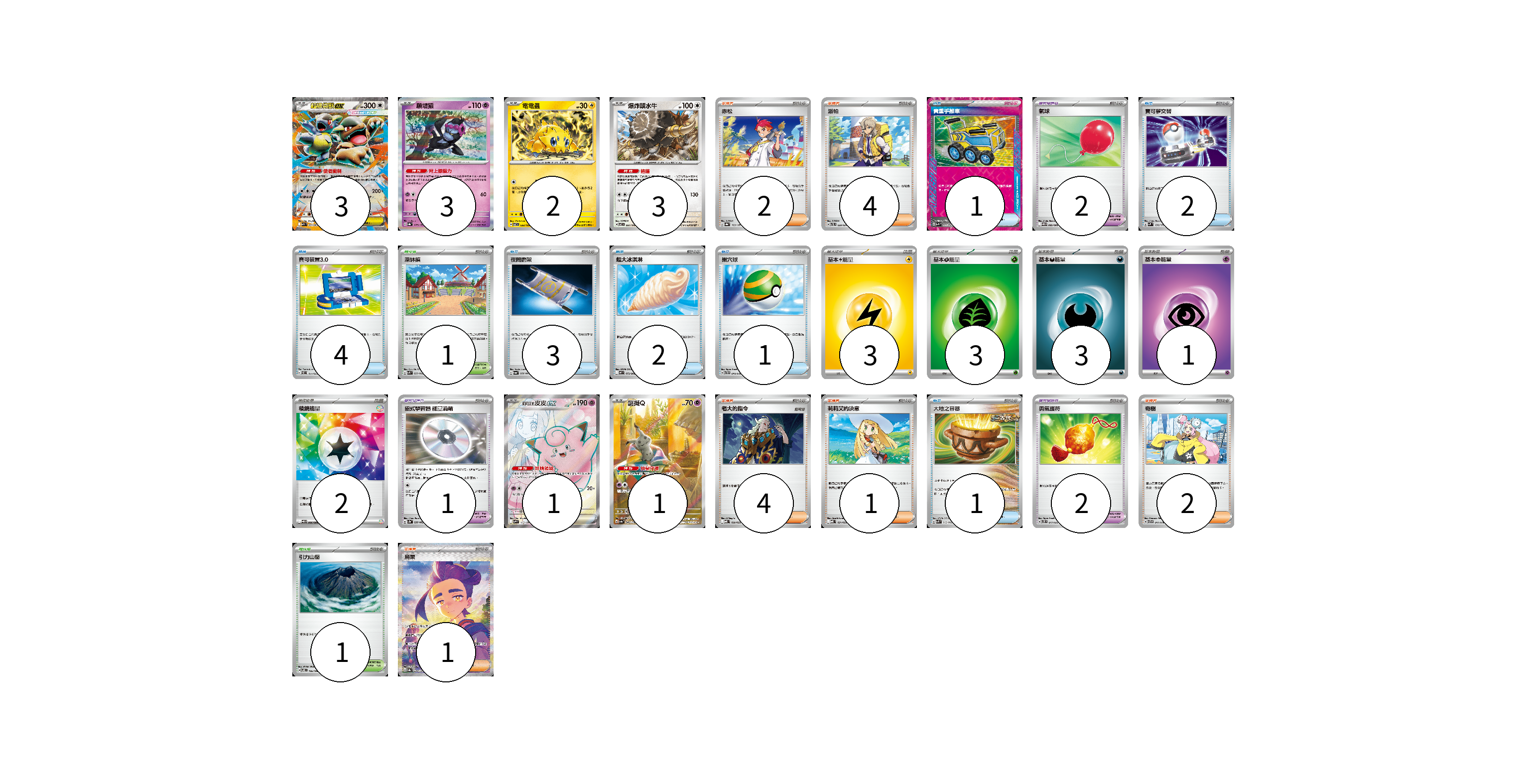 牌組構築方案 以此牌組為基礎新構築牌組 顯示卡面 顯示列表 寶可夢卡(13) 3 3 2 3 1 1 寶可夢道具(5) 2 1 2 物品卡(14) 1 2 4 3 2 1 1 支援者卡(14) 2 4 4 1 2 1 競技場卡(2) 1 1 能量卡(12) 3 3 3 1 2 寶可夢卡(13) 卡牌名稱 張數 卡牌名稱 張數 超級袋獸ex M1S 051/063 03 願增猿 SV8a 075/187 03 電電蟲 SV7 032/102 02 爆炸頭水牛 SV7 081/102 03 莉莉艾的皮皮ex SV9 115/100 01 謎擬Q SV4a 341/190 01 寶可夢道具(5) 卡牌名稱 張數 卡牌名稱 張數 氣球 SV11B 082/086 02 招式學習器 能量渦輪 SV3a 056/062 01 勇氣護符 SVTS 017/022 02 物品卡(14) 卡牌名稱 張數 卡牌名稱 張數 貴重手推車 SVK 020/042 01 寶可夢交替 SVM 136/175 02 寶可裝置3.0 SVEL 014/020 04 夜間擔架 SV6a 056/064 03 超大冰淇淋 M2 073/080 02 巢穴球 SVTH 010/018 01 大地之容器 SVK 012/042 01 支援者卡(14) 卡牌名稱 張數 卡牌名稱 張數 赤松 SV8a 163/187 02 派帕 SVTL 020/021 04 老大的指令 MBD 020/022 04 莉莉艾的決意 MBD 021/022 01 奇樹 SVTG 017/019 02 烏栗 SV8a 230/187 01 競技場卡(2) 卡牌名稱 張數 卡牌名稱 張數 深缽鎮 SVK 039/042 01 引力山岳 SV8 106/106 01 能量卡(12) 卡牌名稱 張數 卡牌名稱 張數 基本【雷】能量 SVTR LIG 03 基本【草】能量 SVTM GRA 03 基本【惡】能量 SVF DAR 03 基本【超】能量 SVEM PSY 01 稜鏡能量 SV11B 086/086 02 以此牌組為基礎新構築牌組 牌組編碼 pMlGXr-jARxhY-egQEQZ copy 列印牌組單 牌組編碼已複製 分享至SNS