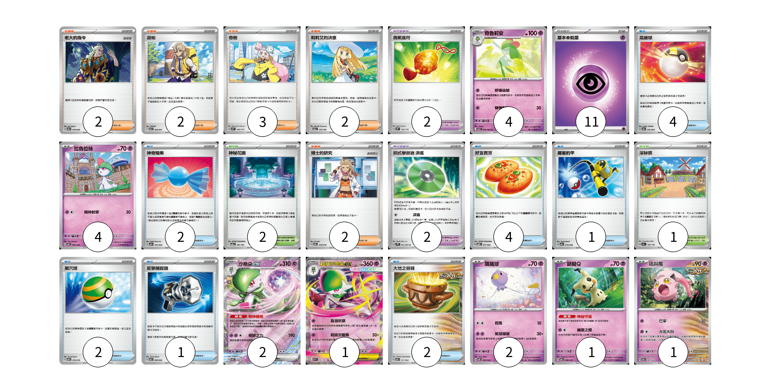 牌組構築方案 以此牌組為基礎新構築牌組 顯示卡面 顯示列表 寶可夢卡(15) 4 4 2 1 2 1 1 寶可夢道具(4) 2 2 物品卡(16) 4 2 4 1 2 1 2 支援者卡(11) 2 2 3 2 2 競技場卡(3) 2 1 能量卡(11) 11 寶可夢卡(15) 卡牌名稱 張數 卡牌名稱 張數 奇魯莉安 M1S 041/063 04 拉魯拉絲 SVTS 002/022 04 沙奈朵ex SVTS 004/022 02 超級沙奈朵ex M1S 042/063 01 飄飄球 SVTS 005/022 02 謎擬Q SVTS 006/022 01 吼叫尾 SVTS 007/022 01 寶可夢道具(4) 卡牌名稱 張數 卡牌名稱 張數 勇氣護符 SVM 142/175 02 招式學習器 演進 SV4M 063/066 02 物品卡(16) 卡牌名稱 張數 卡牌名稱 張數 高級球 SVOD 012/020 04 神奇糖果 SVOD 013/020 02 好友寶芬 MBG 011/022 04 厲害釣竿 SVOD 010/020 01 巢穴球 SVTG 012/019 02 反擊捕捉器 SVTS 009/022 01 大地之容器 SVTS 011/022 02 支援者卡(11) 卡牌名稱 張數 卡牌名稱 張數 老大的指令 SVOD 019/020 02 派帕 SVTL 020/021 02 奇樹 SVM 160/175 03 莉莉艾的決意 M2a 175/193 02 博士的研究 SVTG 018/019 02 競技場卡(3) 卡牌名稱 張數 卡牌名稱 張數 神秘花園 M2a 187/193 02 深缽鎮 SV4a 185/190 01 能量卡(11) 卡牌名稱 張數 卡牌名稱 張數 基本【超】能量 MBD PSY 11 以此牌組為基礎新構築牌組 牌組編碼 pPGFpI-HPzxoc-JBTcwE copy 列印牌組單 牌組編碼已複製 分享至SNS