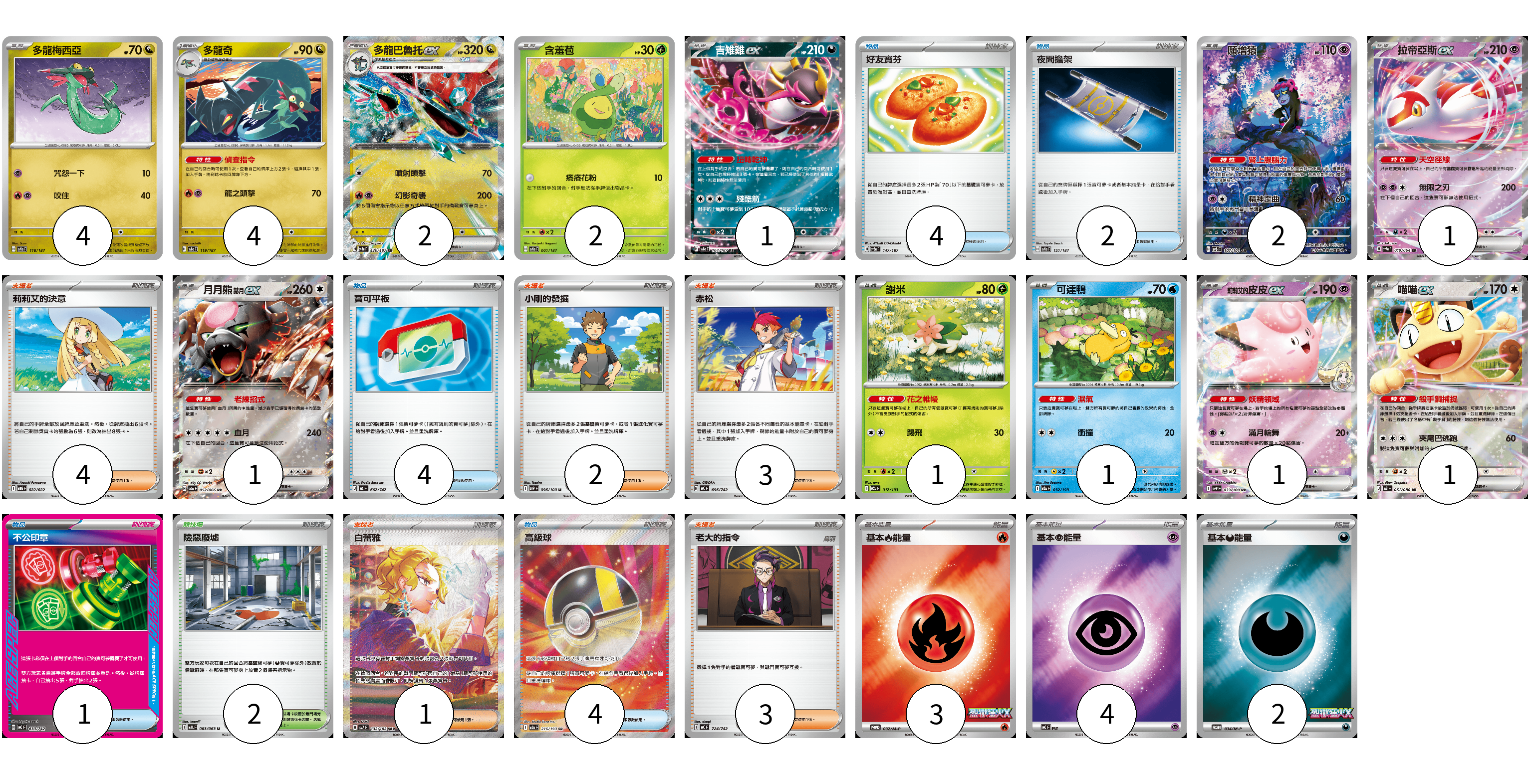 牌組構築方案 以此牌組為基礎新構築牌組 顯示卡面 顯示列表 寶可夢卡(21) 4 4 2 2 1 2 1 1 1 1 1 1 物品卡(15) 4 2 4 1 4 支援者卡(13) 4 2 3 1 3 競技場卡(2) 2 能量卡(9) 3 4 2 寶可夢卡(21) 卡牌名稱 張數 卡牌名稱 張數 多龍梅西亞 SV8a 118/187 04 多龍奇 SV8a 119/187 04 多龍巴魯托ex SV8a 120/187 02 含羞苞 SV8a 001/187 02 吉雉雞ex SV8a 104/187 01 願增猿 SV6 107/101 02 拉帝亞斯ex SV7a 019/064 01 月月熊 赫月 ex SV5a 052/066 01 謝米 M2a 012/193 01 可達鴨 M2a 032/193 01 莉莉艾的皮皮ex SV9 033/100 01 喵喵ex M3 061/080 01 物品卡(15) 卡牌名稱 張數 卡牌名稱 張數 好友寶芬 SV8a 147/187 04 夜間擔架 SV8a 151/187 02 寶可平板 MC 662/742 04 不公印章 MC 633/742 01 高級球 M2a 216/193 04 支援者卡(13) 卡牌名稱 張數 卡牌名稱 張數 莉莉艾的決意 MBG 022/022 04 小剛的發掘 SV9 096/100 02 赤松 MC 696/742 03 白蕾雅 SV7 132/102 01 老大的指令 MC 724/742 03 競技場卡(2) 卡牌名稱 張數 卡牌名稱 張數 險惡廢墟 M1L 063/063 02 能量卡(9) 卡牌名稱 張數 卡牌名稱 張數 基本【火】能量 M-P 032/M-P 03 基本【超】能量 MC PSY 04 基本【惡】能量 M-P 034/M-P 02 以此牌組為基礎新構築牌組 牌組編碼 pSXcgD-ermfHU-NZsQXb copy 列印牌組單 牌組編碼已複製 分享至SNS