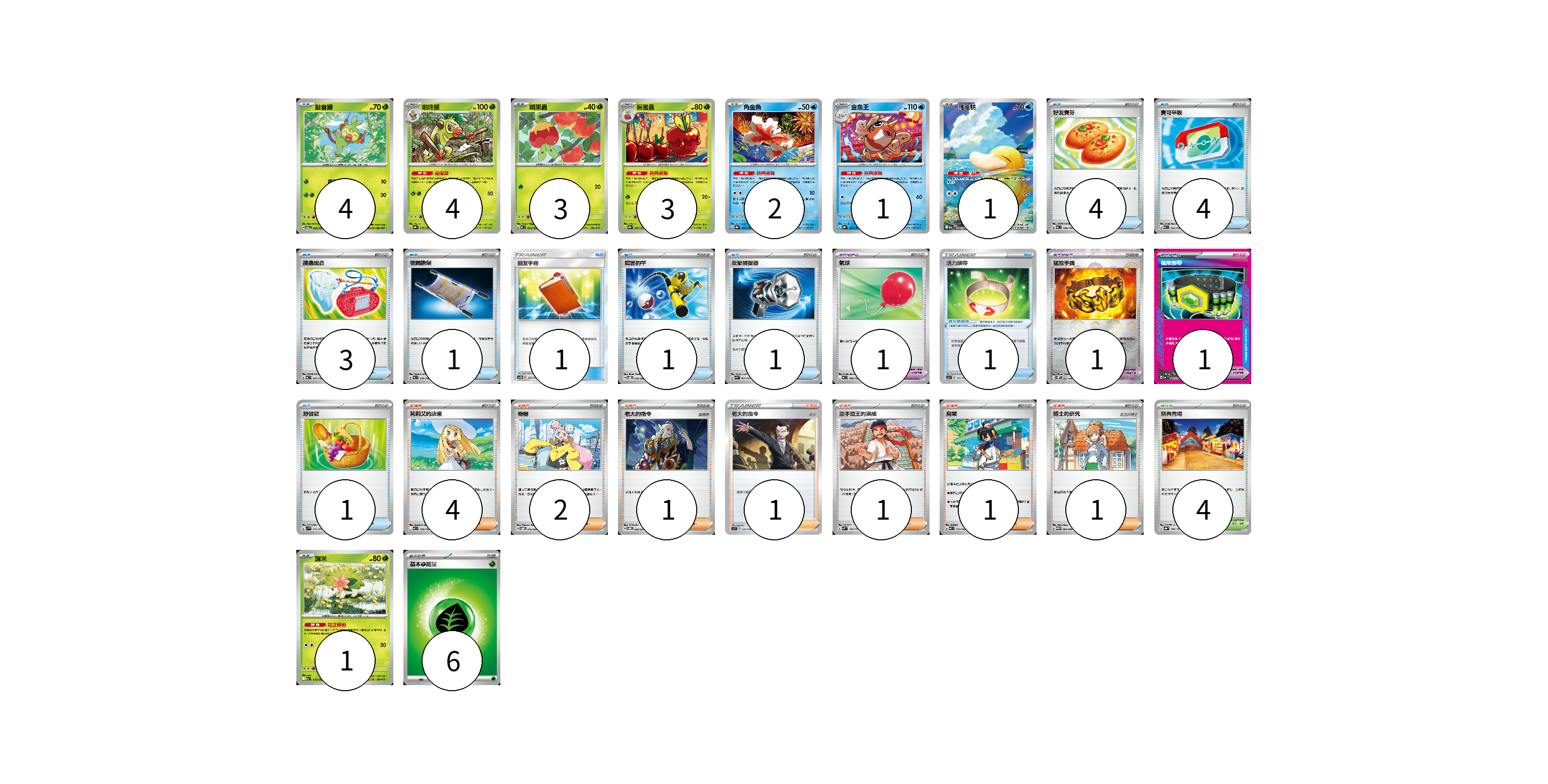 牌組構築方案 以此牌組為基礎新構築牌組 顯示卡面 顯示列表 寶可夢卡(19) 4 4 3 3 2 1 1 1 寶可夢道具(4) 1 1 1 1 物品卡(16) 4 4 3 1 1 1 1 1 支援者卡(11) 4 2 1 1 1 1 1 競技場卡(4) 4 能量卡(6) 6 寶可夢卡(19) 卡牌名稱 張數 卡牌名稱 張數 敲音猴 SV6 008/101 04 啪咚猴 SV8a 007/187 04 啃果蟲 MC 062/742 03 裹蜜蟲 SV8a 009/187 03 角金魚 SV8a 028/187 02 金魚王 SV8a 029/187 01 可達鴨 M2a 199/193 01 謝米 M2a 012/193 01 寶可夢道具(4) 卡牌名稱 張數 卡牌名稱 張數 氣球 MC 688/742 01 活力頭帶 SC1a 143/154 01 猛攻手鐲 SV11W 082/086 01 極限腰帶 MC 691/742 01 物品卡(16) 卡牌名稱 張數 卡牌名稱 張數 好友寶芬 MC 648/742 04 寶可平板 MC 662/742 04 捕蟲組合 MC 667/742 03 夜間擔架 MC 670/742 01 朋友手冊 AC2D 145/176 01 厲害釣竿 SVOD 010/020 01 反擊捕捉器 SVK 009/042 01 野餐籃 SV1V 071/078 01 支援者卡(11) 卡牌名稱 張數 卡牌名稱 張數 莉莉艾的決意 MC 729/742 04 奇樹 SVOD 016/020 02 老大的指令 SVOM 020/021 01 老大的指令(坂木) SJ 026/028 01 空手道王的演練 SVM 146/175 01 烏栗 MC 713/742 01 博士的研究 SV11B 084/086 01 競技場卡(4) 卡牌名稱 張數 卡牌名稱 張數 祭典會場 SV8a 180/187 04 能量卡(6) 卡牌名稱 張數 卡牌名稱 張數 基本【草】能量 MC GRA 06 以此牌組為基礎新構築牌組 牌組編碼 pSsQnT-YIzghE-PPIgpO copy 列印牌組單 牌組編碼已複製 分享至SNS