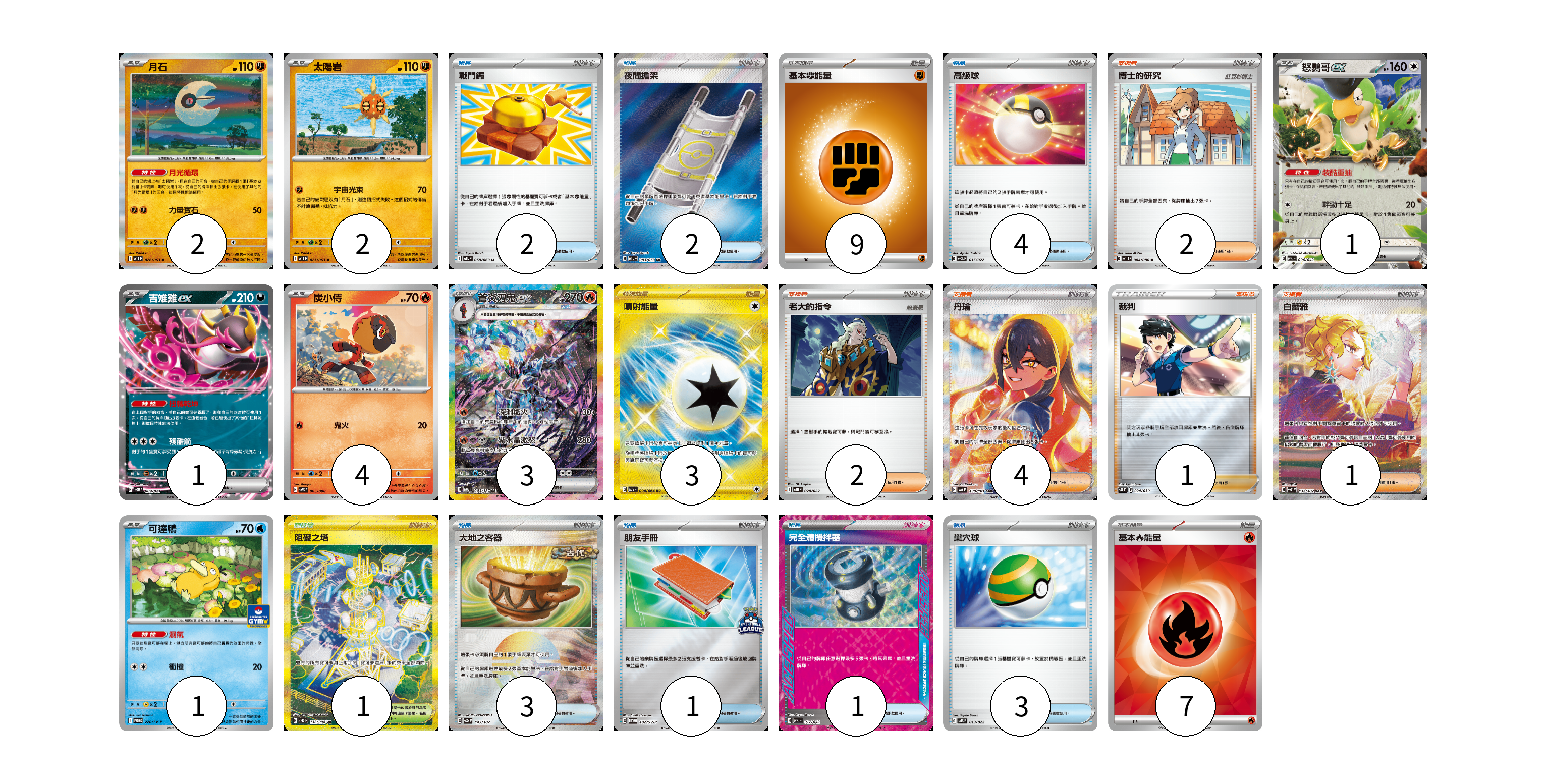 牌組構築方案 以此牌組為基礎新構築牌組 顯示卡面 顯示列表 寶可夢卡(14) 2 2 1 1 4 3 1 物品卡(16) 2 2 4 3 1 1 3 支援者卡(10) 2 2 4 1 1 競技場卡(1) 1 能量卡(19) 9 3 7 寶可夢卡(14) 卡牌名稱 張數 卡牌名稱 張數 月石 M1L 026/063 02 太陽岩 M1L 027/063 02 怒鸚哥ex SVK 006/042 01 吉雉雞ex SVOM 009/021 01 炭小侍 SVPS 005/008 04 蒼炎刃鬼ex SV8a 203/187 03 可達鴨 SV-P 220/SV-P 01 物品卡(16) 卡牌名稱 張數 卡牌名稱 張數 戰鬥鑼 M1L 059/063 02 夜間擔架 M1L 083/063 02 高級球 SVQL 015/022 04 大地之容器 SV8a 143/187 03 朋友手冊 SV-P 182/SV-P 01 完全體攪拌器 SVK 017/042 01 巢穴球 SVTS 013/022 03 支援者卡(10) 卡牌名稱 張數 卡牌名稱 張數 博士的研究 SV11B 084/086 02 老大的指令 MBD 020/022 02 丹瑜 SV6 130/101 04 裁判 SO 024/030 01 白蕾雅 SV7 132/102 01 競技場卡(1) 卡牌名稱 張數 卡牌名稱 張數 阻礙之塔 SV10 132/098 01 能量卡(19) 卡牌名稱 張數 卡牌名稱 張數 基本【鬥】能量 M-P FIG 09 噴射能量 SV7a 094/064 03 基本【火】能量 SVQL FIR 07 以此牌組為基礎新構築牌組 牌組編碼 pUqFqT-XibDGJ-SdYrTl copy 列印牌組單 牌組編碼已複製 分享至SNS