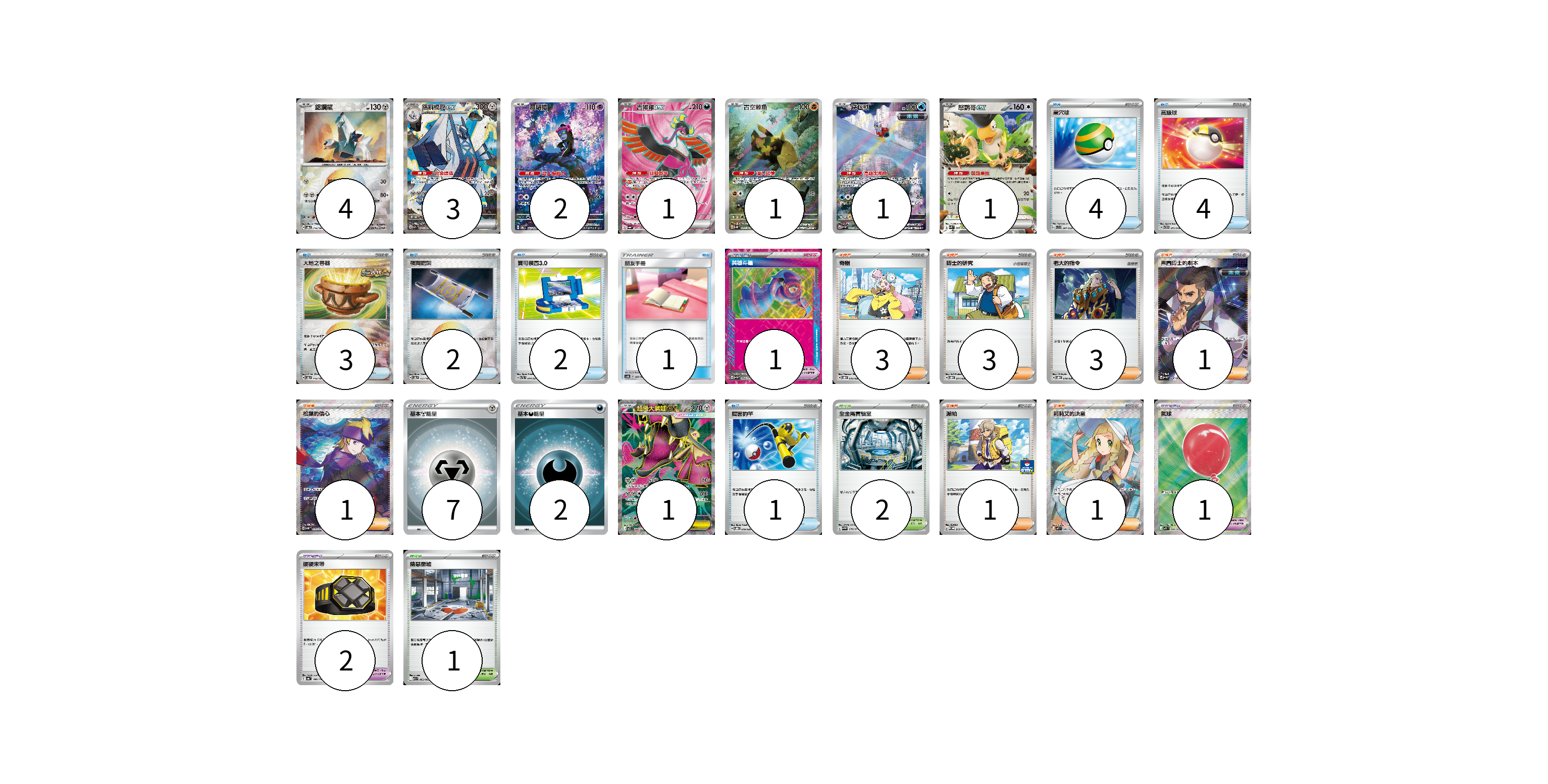 牌組構築方案 以此牌組為基礎新構築牌組 顯示卡面 顯示列表 寶可夢卡(14) 4 3 2 1 1 1 1 1 寶可夢道具(4) 1 1 2 物品卡(17) 4 4 3 2 2 1 1 支援者卡(13) 3 3 3 1 1 1 1 競技場卡(3) 2 1 能量卡(9) 7 2 寶可夢卡(14) 卡牌名稱 張數 卡牌名稱 張數 鋁鋼龍 SV8a 112/187 04 鋁鋼橋龍ex SV7a 088/064 03 願增猿 SV6 107/101 02 吉雉雞ex SV6a 081/064 01 古空棘魚 SV5K 077/071 01 鐵包袱 SV4M 071/066 01 怒鸚哥ex SVK 006/042 01 超級大嘴娃ex M1L 080/063 01 寶可夢道具(4) 卡牌名稱 張數 卡牌名稱 張數 英雄斗篷 SV5M 064/071 01 氣球 M1L 084/063 01 硬硬束帶 SV4a 166/190 02 物品卡(17) 卡牌名稱 張數 卡牌名稱 張數 巢穴球 SVB 001/028 04 高級球 SVTH 011/018 04 大地之容器 SV8a 143/187 03 夜間擔架 SV8a 151/187 02 寶可裝置3.0 SVTL 014/021 02 朋友手冊 AS6b 188/194 01 厲害釣竿 SVOD 010/020 01 支援者卡(13) 卡牌名稱 張數 卡牌名稱 張數 奇樹 SVOD 016/020 03 博士的研究 SVOD 017/020 03 老大的指令 SVOD 019/020 03 弗圖博士的劇本 SV4M 086/066 01 松葉的信心 SV5K 092/071 01 派帕 SV-P 213/SV-P 01 莉莉艾的決意 M1L 086/063 01 競技場卡(3) 卡牌名稱 張數 卡牌名稱 張數 全金屬實驗室 SV5M 070/071 02 險惡廢墟 M1L 063/063 01 能量卡(9) 卡牌名稱 張數 卡牌名稱 張數 基本【鋼】能量 SI MET 07 基本【惡】能量 SI DAR 02 以此牌組為基礎新構築牌組 牌組編碼 pUrIrI-pdMtnh-TFwOZc copy 列印牌組單 牌組編碼已複製 分享至SNS