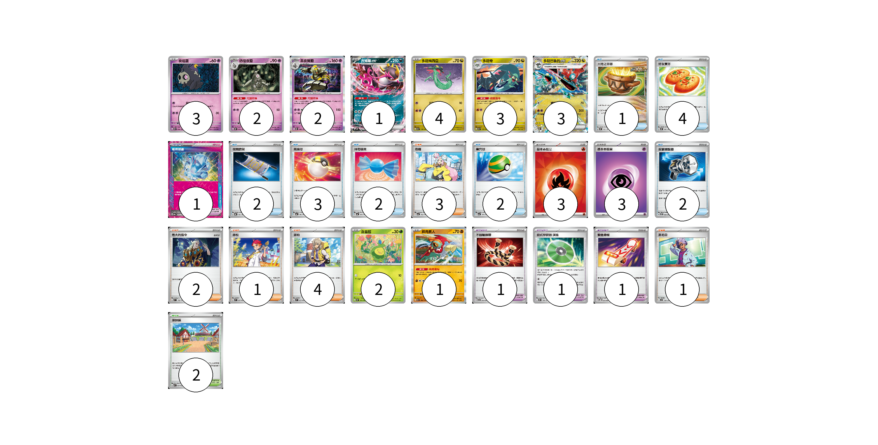 牌組構築方案 以此牌組為基礎新構築牌組 顯示卡面 顯示列表 寶可夢卡(21) 3 2 2 1 4 3 3 2 1 寶可夢道具(4) 1 1 1 1 物品卡(16) 1 4 2 3 2 2 2 支援者卡(11) 3 2 1 4 1 競技場卡(2) 2 能量卡(6) 3 3 寶可夢卡(21) 卡牌名稱 張數 卡牌名稱 張數 夜巡靈 SV8a 064/187 03 彷徨夜靈 SV8a 065/187 02 黑夜魔靈 SV8a 066/187 02 吉雉雞ex SV8a 104/187 01 多龍梅西亞 SV8a 118/187 04 多龍奇 SV8a 119/187 03 多龍巴魯托ex SV8a 120/187 03 含羞苞 SV8a 001/187 02 摔角鷹人 SV8a 084/187 01 寶可夢道具(4) 卡牌名稱 張數 卡牌名稱 張數 璀璨結晶 SV8a 152/187 01 不服輸頭帶 SVTL 016/021 01 招式學習器 演進 SV8a 160/187 01 緊急滑板 SVOD 015/020 01 物品卡(16) 卡牌名稱 張數 卡牌名稱 張數 大地之容器 SV8a 143/187 01 好友寶芬 SV8a 147/187 04 夜間擔架 SV8a 151/187 02 高級球 SV4a 161/190 03 神奇糖果 SV4a 163/190 02 巢穴球 SV4a 159/190 02 反擊捕捉器 SVTS 009/022 02 支援者卡(11) 卡牌名稱 張數 卡牌名稱 張數 奇樹 SV4a 174/190 03 老大的指令 SVM 172/175 02 赤松 SVK 027/042 01 派帕 SVK 035/042 04 吉尼亞 SVD 129/139 01 競技場卡(2) 卡牌名稱 張數 卡牌名稱 張數 深缽鎮 SVK 039/042 02 能量卡(6) 卡牌名稱 張數 卡牌名稱 張數 基本【火】能量 SVK FIR 03 基本【超】能量 SVEM PSY 03 以此牌組為基礎新構築牌組 牌組編碼 pVzXnY-NqKcCi-ybnfrR copy 列印牌組單 牌組編碼已複製 分享至SNS