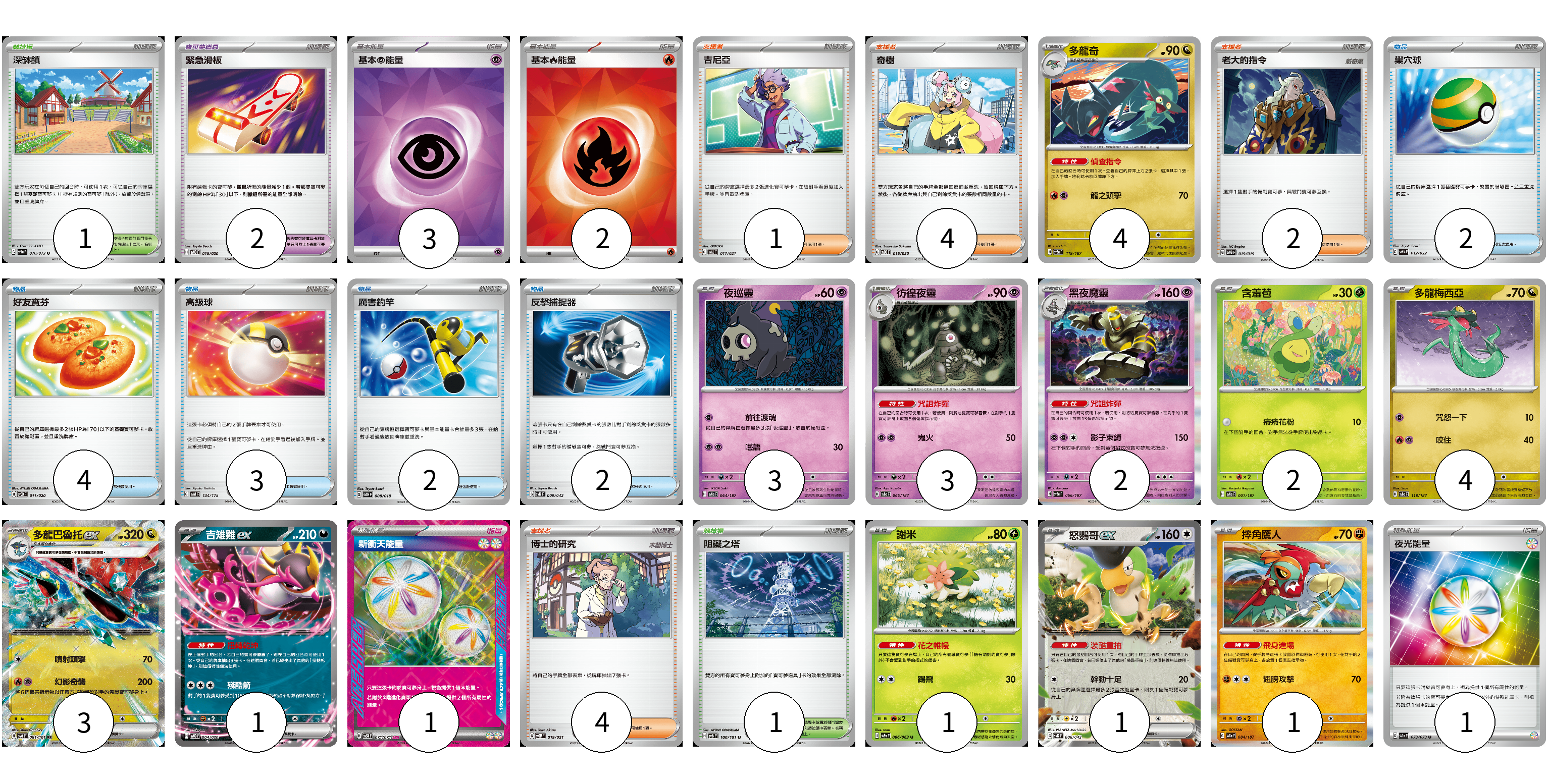 牌組構築方案 以此牌組為基礎新構築牌組 顯示卡面 顯示列表 寶可夢卡(25) 4 3 3 2 2 4 3 1 1 1 1 寶可夢道具(2) 2 物品卡(13) 2 4 3 2 2 支援者卡(11) 1 4 2 4 競技場卡(2) 1 1 能量卡(7) 3 2 1 1 寶可夢卡(25) 卡牌名稱 張數 卡牌名稱 張數 多龍奇 SV8a 119/187 04 夜巡靈 SV8a 064/187 03 彷徨夜靈 SV8a 065/187 03 黑夜魔靈 SV8a 066/187 02 含羞苞 SV8a 001/187 02 多龍梅西亞 SV8a 118/187 04 多龍巴魯托ex SV6 081/101 03 吉雉雞ex SVOD 004/020 01 謝米 SV9a 006/063 01 怒鸚哥ex SVK 006/042 01 摔角鷹人 SV8a 084/187 01 寶可夢道具(2) 卡牌名稱 張數 卡牌名稱 張數 緊急滑板 SVOD 015/020 02 物品卡(13) 卡牌名稱 張數 卡牌名稱 張數 巢穴球 SVHM 012/022 02 好友寶芬 SVOD 011/020 04 高級球 SVM 134/175 03 厲害釣竿 SVTH 008/018 02 反擊捕捉器 SVK 009/042 02 支援者卡(11) 卡牌名稱 張數 卡牌名稱 張數 吉尼亞 SVAL 017/021 01 奇樹 SVOD 016/020 04 老大的指令 SVTG 019/019 02 博士的研究 SVOM 019/021 04 競技場卡(2) 卡牌名稱 張數 卡牌名稱 張數 深缽鎮 SV1a 070/073 01 阻礙之塔 SV6 100/101 01 能量卡(7) 卡牌名稱 張數 卡牌名稱 張數 基本【超】能量 SVOD PSY 03 基本【火】能量 SVK FIR 02 新衝天能量 SV5K 071/071 01 夜光能量 SV1a 073/073 01 以此牌組為基礎新構築牌組 牌組編碼 pWYrun-vxUuCk-sNqwrt copy 列印牌組單 牌組編碼已複製 分享至SNS