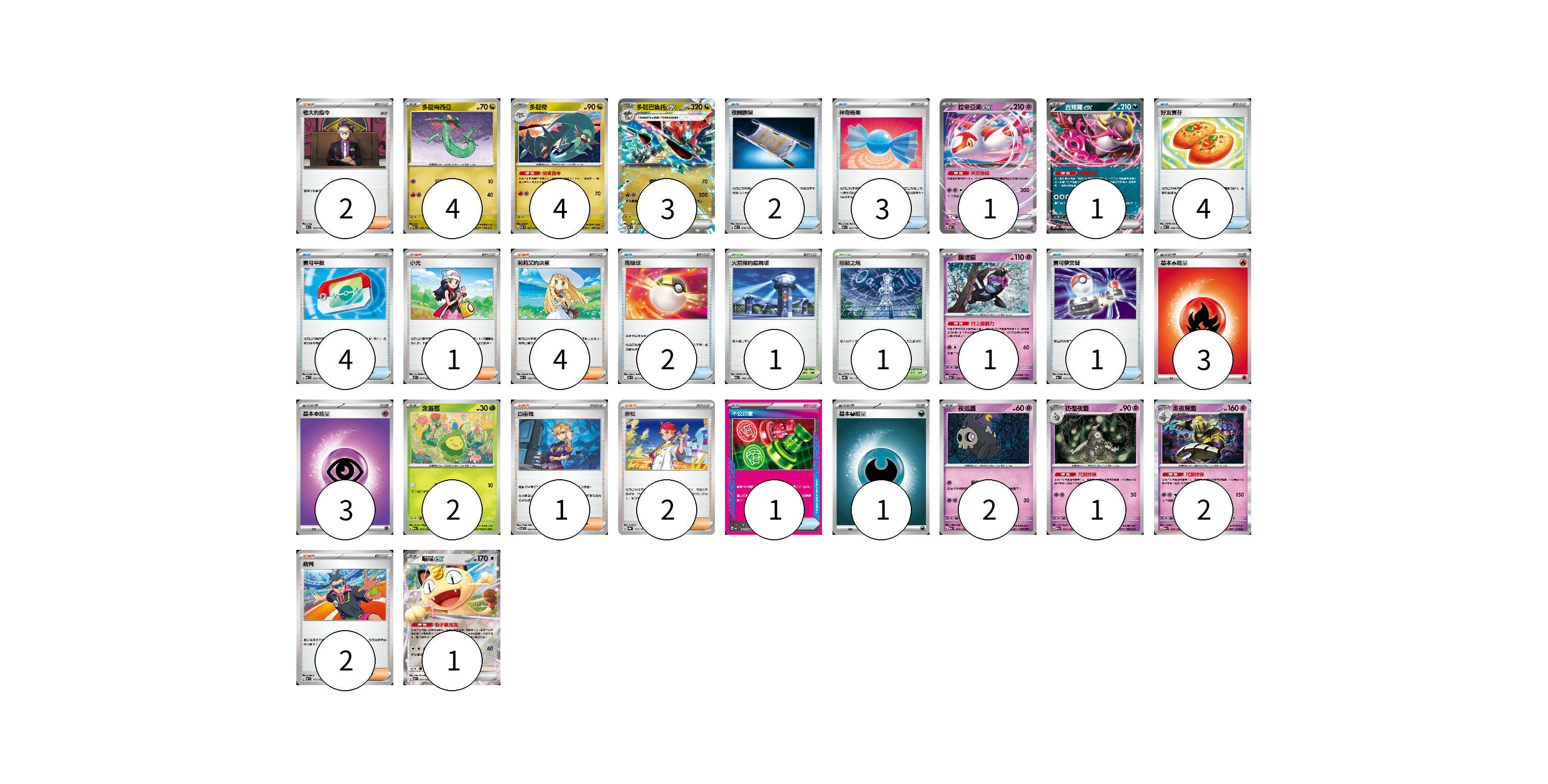 牌組構築方案 以此牌組為基礎新構築牌組 顯示卡面 顯示列表 寶可夢卡(22) 4 4 3 1 1 1 2 2 1 2 1 物品卡(17) 2 3 4 4 2 1 1 支援者卡(12) 2 1 4 1 2 2 競技場卡(2) 1 1 能量卡(7) 3 3 1 寶可夢卡(22) 卡牌名稱 張數 卡牌名稱 張數 多龍梅西亞 MC 546/742 04 多龍奇 MC 547/742 04 多龍巴魯托ex MC 548/742 03 拉帝亞斯ex MC 312/742 01 吉雉雞ex MC 489/742 01 願增猿 MC 358/742 01 含羞苞 M2a 011/193 02 夜巡靈 M2a 072/193 02 彷徨夜靈 M2a 073/193 01 黑夜魔靈 M2a 074/193 02 喵喵ex M3 061/080 01 物品卡(17) 卡牌名稱 張數 卡牌名稱 張數 夜間擔架 MC 670/742 02 神奇糖果 MC 655/742 03 好友寶芬 MC 648/742 04 寶可平板 MC 662/742 04 高級球 MC 651/742 02 寶可夢交替 MC 663/742 01 不公印章 MC 633/742 01 支援者卡(12) 卡牌名稱 張數 卡牌名稱 張數 老大的指令 MC 724/742 02 小光 M2 077/080 01 莉莉艾的決意 MC 729/742 04 白蕾雅 SV7 100/102 01 赤松 SV8a 163/187 02 裁判 MC 711/742 02 競技場卡(2) 卡牌名稱 張數 卡牌名稱 張數 火箭隊的監視塔 M2a 189/193 01 阻礙之塔 SV8a 181/187 01 能量卡(7) 卡牌名稱 張數 卡牌名稱 張數 基本【火】能量 MC FIR 03 基本【超】能量 MC PSY 03 基本【惡】能量 MC DAR 01 以此牌組為基礎新構築牌組 牌組編碼 pYFlyD-rmgDUN-TbyhHV copy 列印牌組單 牌組編碼已複製 分享至SNS