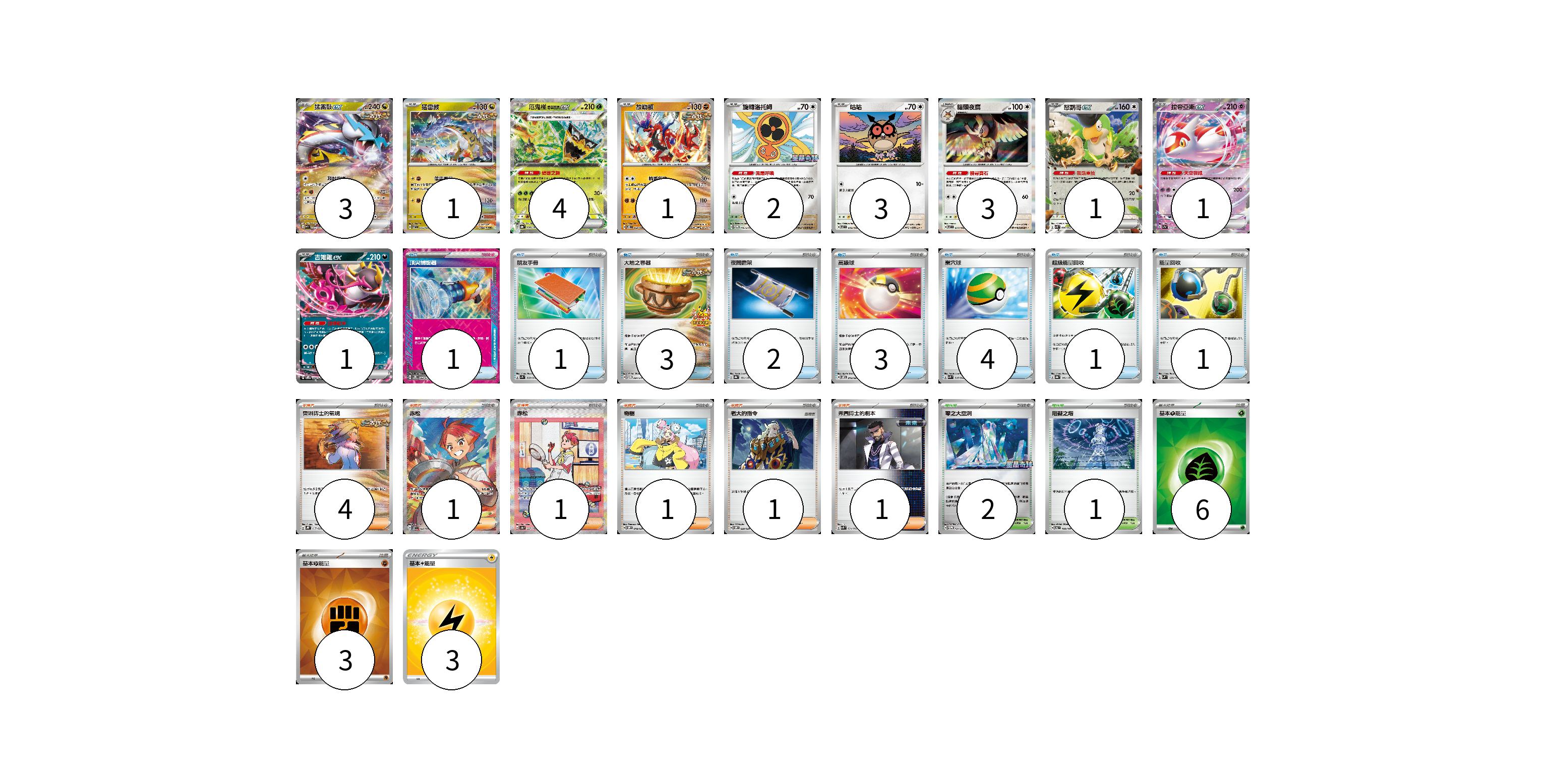牌組構築方案 以此牌組為基礎新構築牌組 顯示卡面 顯示列表 寶可夢卡(20) 3 1 4 1 2 3 3 1 1 1 物品卡(16) 1 1 3 2 3 4 1 1 支援者卡(9) 4 1 1 1 1 1 競技場卡(3) 2 1 能量卡(12) 6 3 3 寶可夢卡(20) 卡牌名稱 張數 卡牌名稱 張數 猛雷鼓ex SV5K 053/071 03 猛雷鼓 SV7 075/102 01 厄鬼椪 碧草面具ex SV8a 020/187 04 故勒頓 SV8 069/106 01 旋轉洛托姆 SV-P 146/SV-P 02 咕咕 SV7 076/102 03 貓頭夜鷹 SV7 077/102 03 怒鸚哥ex SVK 006/042 01 拉帝亞斯ex SV7a 019/064 01 吉雉雞ex SVOM 009/021 01 物品卡(16) 卡牌名稱 張數 卡牌名稱 張數 頂尖捕捉器 SV5M 062/071 01 朋友手冊 SV1S 069/078 01 大地之容器 SV-P 084/SV-P 03 夜間擔架 SV8a 151/187 02 高級球 SVOM 013/021 03 巢穴球 SVK 016/042 04 超級能量回收 SV8a 141/187 01 能量回收 SVM 125/175 01 支援者卡(9) 卡牌名稱 張數 卡牌名稱 張數 奧琳博士的氣魄 SVHK 017/022 04 赤松 SV7 123/102 01 赤松 SV8a 227/187 01 奇樹 SVOM 018/021 01 老大的指令 SVOM 020/021 01 弗圖博士的劇本 SVK 034/042 01 競技場卡(3) 卡牌名稱 張數 卡牌名稱 張數 零之大空洞 SV-P 151/SV-P 02 阻礙之塔 SV6 100/101 01 能量卡(12) 卡牌名稱 張數 卡牌名稱 張數 基本【草】能量 SVK GRA 06 基本【鬥】能量 SVK FIG 03 基本【雷】能量 SI LIG 03 以此牌組為基礎新構築牌組 牌組編碼 pYsLCa-FkVayT-VVewej copy 列印牌組單 牌組編碼已複製 分享至SNS