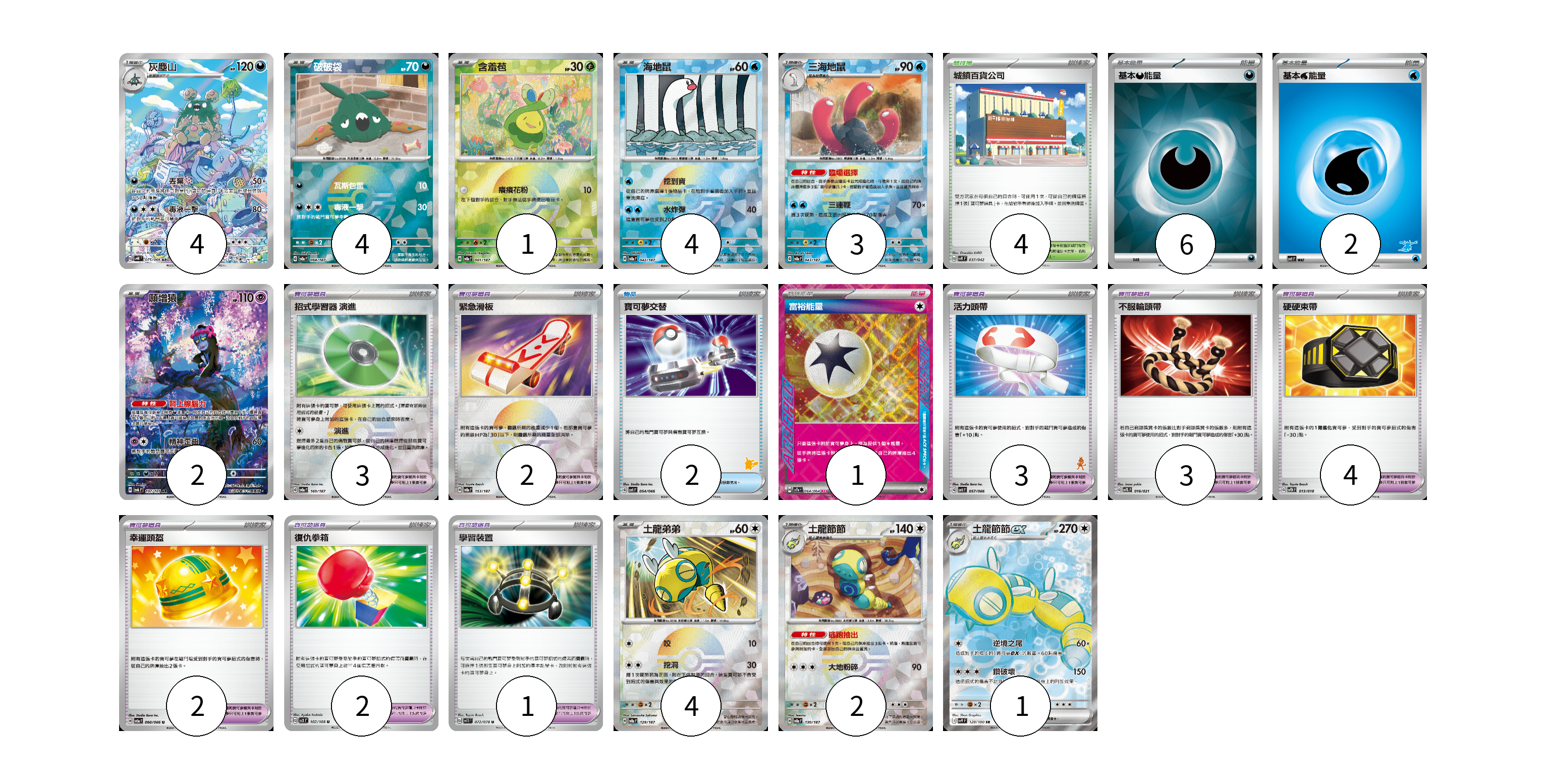 牌組構築方案 以此牌組為基礎新構築牌組 顯示卡面 顯示列表 寶可夢卡(25) 4 4 1 4 3 2 4 2 1 寶可夢道具(20) 3 2 3 3 4 2 2 1 物品卡(2) 2 競技場卡(4) 4 能量卡(9) 6 2 1 寶可夢卡(25) 卡牌名稱 張數 卡牌名稱 張數 灰塵山 SV4K 075/066 04 破破袋 SV8a 094/187 04 含羞苞 SV8a 001/187 01 海地鼠 SV8a 042/187 04 三海地鼠 SV8a 043/187 03 願增猿 SV6 107/101 02 土龍弟弟 SV8a 129/187 04 土龍節節 SV8a 130/187 02 土龍節節ex SV9 120/100 01 寶可夢道具(20) 卡牌名稱 張數 卡牌名稱 張數 招式學習器 演進 SV8a 160/187 03 緊急滑板 SV8a 153/187 02 活力頭帶 SVI 057/066 03 不服輸頭帶 SVTL 016/021 03 硬硬束帶 SVTH 013/018 04 幸運頭盔 SV5a 060/066 02 復仇拳箱 SV3 102/108 02 學習裝置 SV1S 072/078 01 物品卡(2) 卡牌名稱 張數 卡牌名稱 張數 寶可夢交替 SVI 054/066 02 競技場卡(4) 卡牌名稱 張數 卡牌名稱 張數 城鎮百貨公司 SVK 037/042 04 能量卡(9) 卡牌名稱 張數 卡牌名稱 張數 基本【惡】能量 SVOM DAR 06 基本【水】能量 SVI WAT 02 富裕能量 SV7a 064/064 01 以此牌組為基礎新構築牌組 牌組編碼 pavnVR-gJZaqX-LaeFKy copy 列印牌組單 牌組編碼已複製 分享至SNS