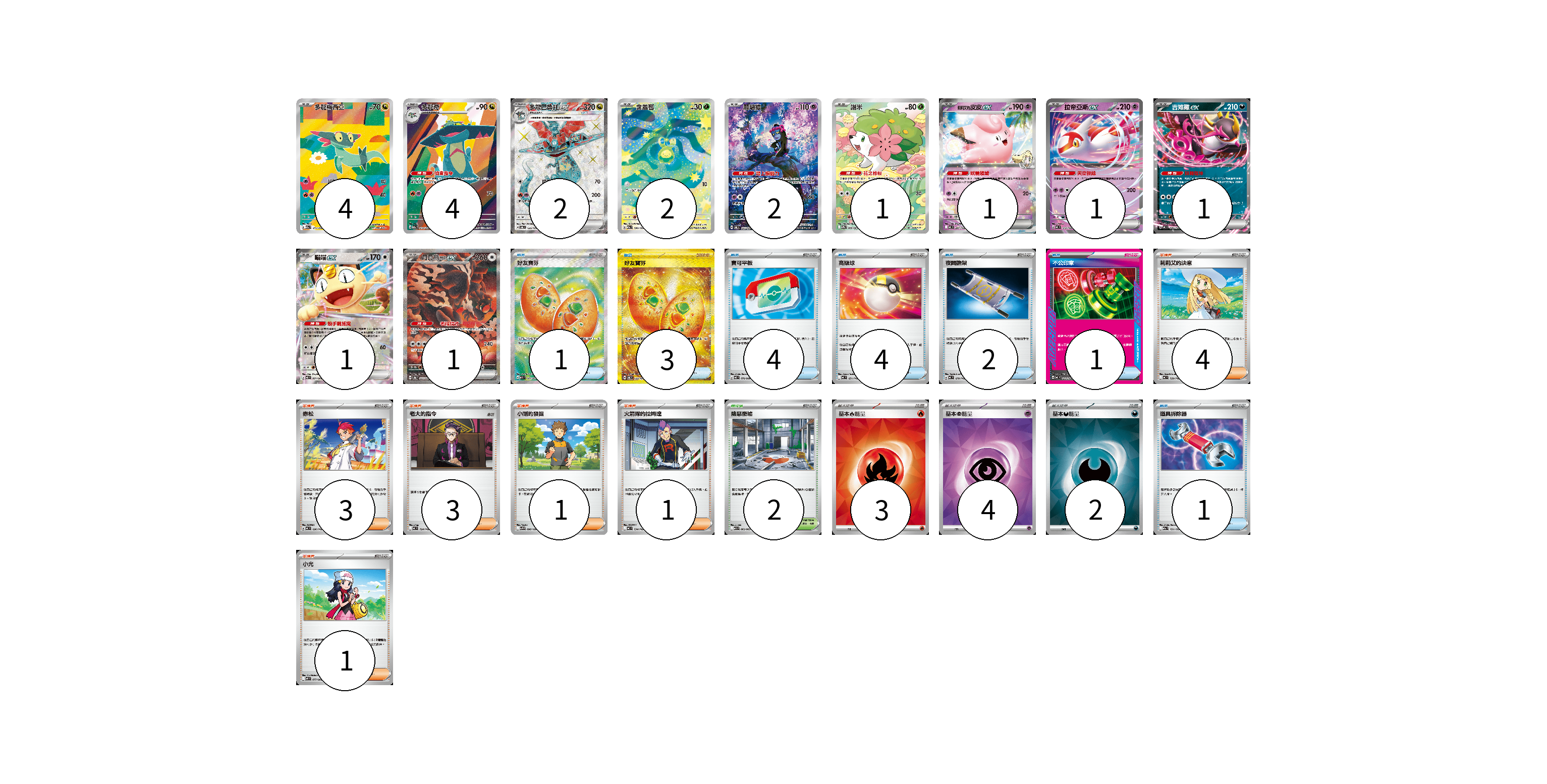 牌組構築方案 以此牌組為基礎新構築牌組 顯示卡面 顯示列表 寶可夢卡(20) 4 4 2 2 2 1 1 1 1 1 1 物品卡(16) 1 3 4 4 2 1 1 支援者卡(13) 4 3 3 1 1 1 競技場卡(2) 2 能量卡(9) 3 4 2 寶可夢卡(20) 卡牌名稱 張數 卡牌名稱 張數 多龍梅西亞 M2a 211/193 04 多龍奇 M2a 212/193 04 多龍巴魯托ex SV6 120/101 02 含羞苞 M2a 196/193 02 願增猿 SV6 107/101 02 謝米 SV9a 066/063 01 莉莉艾的皮皮ex MC 287/742 01 拉帝亞斯ex MC 312/742 01 吉雉雞ex MC 489/742 01 喵喵ex M3 061/080 01 月月熊 赫月ex SV8a 225/187 01 物品卡(16) 卡牌名稱 張數 卡牌名稱 張數 好友寶芬 M1S 081/063 01 好友寶芬 SV6 133/101 03 寶可平板 M3 070/080 04 高級球 MC 651/742 04 夜間擔架 MC 670/742 02 不公印章 MC 633/742 01 道具拆除器 M2a 151/193 01 支援者卡(13) 卡牌名稱 張數 卡牌名稱 張數 莉莉艾的決意 MC 729/742 04 赤松 MC 696/742 03 老大的指令 MC 724/742 03 小剛的發掘 SV9 096/100 01 火箭隊的拉姆達 MC 734/742 01 小光 M2 077/080 01 競技場卡(2) 卡牌名稱 張數 卡牌名稱 張數 險惡廢墟 M1L 063/063 02 能量卡(9) 卡牌名稱 張數 卡牌名稱 張數 基本【火】能量 SVM FIR 03 基本【超】能量 SVM PSY 04 基本【惡】能量 SVM DAR 02 以此牌組為基礎新構築牌組 牌組編碼 pazxgg-WuUtsw-CqLqVy copy 列印牌組單 牌組編碼已複製 分享至SNS