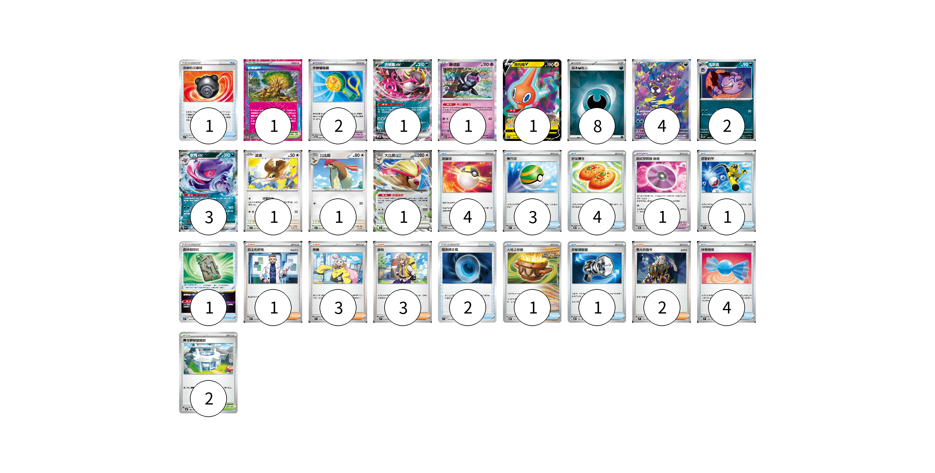 牌組構築方案 以此牌組為基礎新構築牌組 顯示卡面 顯示列表 寶可夢卡(15) 1 1 1 4 2 3 1 1 1 寶可夢道具(3) 2 1 物品卡(22) 1 4 3 4 1 1 2 1 1 4 支援者卡(9) 1 3 3 2 競技場卡(3) 1 2 能量卡(8) 8 寶可夢卡(15) 卡牌名稱 張數 卡牌名稱 張數 吉雉雞ex SV8a 104/187 01 願增猿 SV8a 075/187 01 洛托姆V S11 037/100 01 鬼斯 SV5K 080/071 04 鬼斯通 SV5K 046/071 02 耿鬼ex SV5K 047/071 03 波波 SVK 003/042 01 比比鳥 SVK 004/042 01 大比鳥ex SVK 005/042 01 寶可夢道具(3) 卡牌名稱 張數 卡牌名稱 張數 手持循環扇 SV6 095/101 02 招式學習器 衰退 SV8a 161/187 01 物品卡(22) 卡牌名稱 張數 卡牌名稱 張數 洗翠的沉重球 SVF 019/038 01 高級球 SVTG 013/019 04 巢穴球 SVM 133/175 03 好友寶芬 SV8a 147/187 04 厲害釣竿 SVK 011/042 01 森林封印石 SVF 024/038 01 暗黑修正檔 SVF 014/038 02 大地之容器 SV8a 143/187 01 反擊捕捉器 SV8a 139/187 01 神奇糖果 SVM 135/175 04 支援者卡(9) 卡牌名稱 張數 卡牌名稱 張數 博士的研究 SVK 033/042 01 奇樹 SVM 160/175 03 派帕 SVK 035/042 03 老大的指令 SVM 172/175 02 競技場卡(3) 卡牌名稱 張數 卡牌名稱 張數 壯偉碩木 SV7 101/102 01 寶可夢聯盟總部 SV4a 186/190 02 能量卡(8) 卡牌名稱 張數 卡牌名稱 張數 基本【惡】能量 SVK DAR 08 以此牌組為基礎新構築牌組 牌組編碼 pbzUGV-CJPOVy-lgpDVa copy 列印牌組單 牌組編碼已複製 分享至SNS