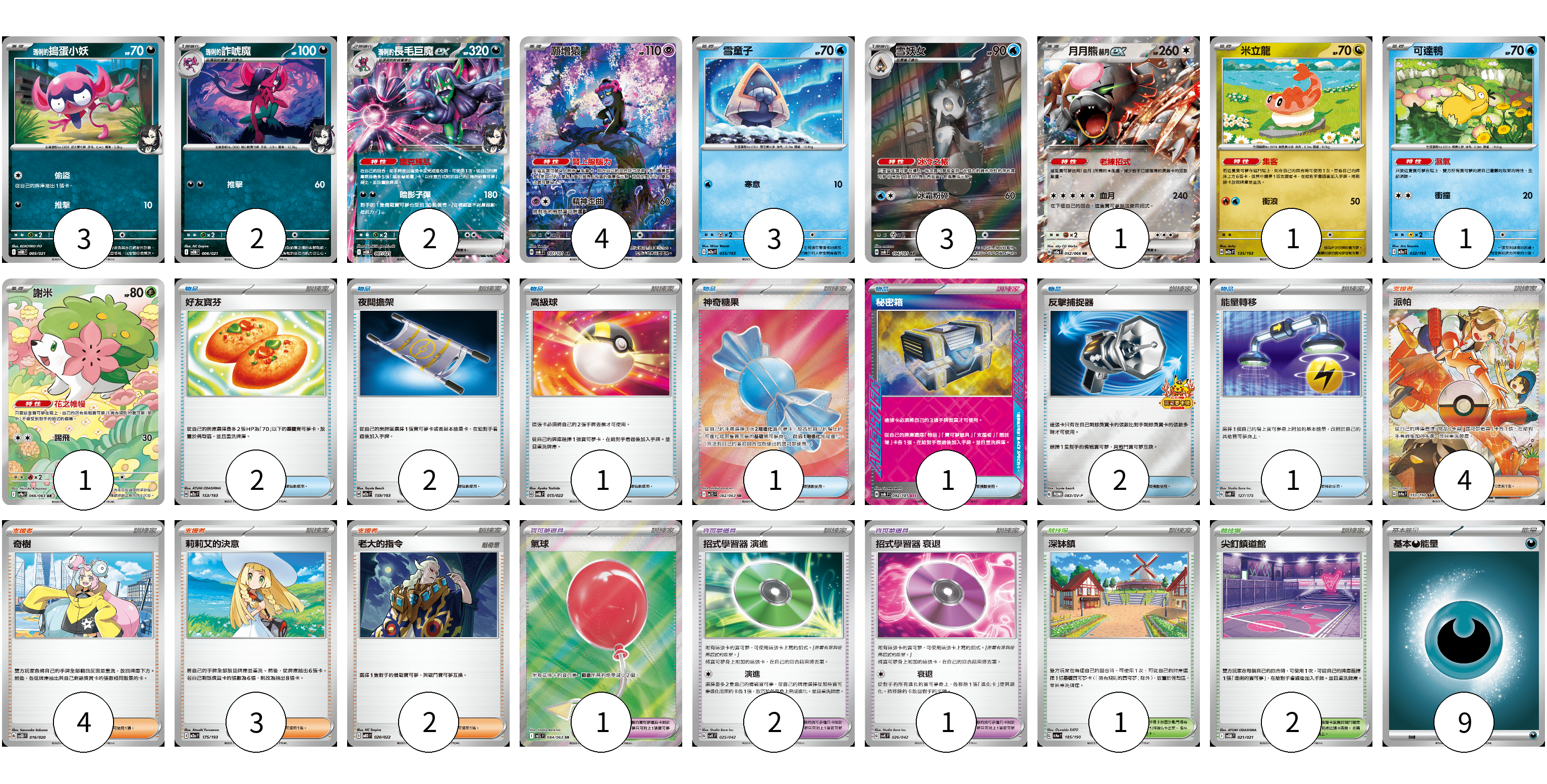 牌組構築方案 以此牌組為基礎新構築牌組 顯示卡面 顯示列表 寶可夢卡(21) 3 2 2 4 3 3 1 1 1 1 寶可夢道具(4) 1 2 1 物品卡(10) 2 2 1 1 1 2 1 支援者卡(13) 4 4 3 2 競技場卡(3) 1 2 能量卡(9) 9 寶可夢卡(21) 卡牌名稱 張數 卡牌名稱 張數 <瑪俐的>搗蛋小妖 SVOM 005/021 03 <瑪俐的>詐唬魔 SVOM 006/021 02 <瑪俐的>長毛巨魔ex SVOM 007/021 02 願增猿 SV6 107/101 04 雪童子 M2a 035/193 03 雪妖女 SV6 104/101 03 月月熊 赫月 ex SV5a 052/066 01 米立龍 M2a 135/193 01 可達鴨 M2a 032/193 01 謝米 SV9a 066/063 01 寶可夢道具(4) 卡牌名稱 張數 卡牌名稱 張數 氣球 M1L 084/063 01 招式學習器 演進 SVK 025/042 02 招式學習器 衰退 SVK 026/042 01 物品卡(10) 卡牌名稱 張數 卡牌名稱 張數 好友寶芬 M2a 153/193 02 夜間擔架 M2a 159/193 02 高級球 SVQL 015/022 01 神奇糖果 M1S 082/063 01 秘密箱 SV6 092/101 01 反擊捕捉器 SV-P 083/SV-P 02 能量轉移 SVM 127/175 01 支援者卡(13) 卡牌名稱 張數 卡牌名稱 張數 派帕 SV4a 353/190 04 奇樹 SVOD 016/020 04 莉莉艾的決意 M2a 175/193 03 老大的指令 MBD 020/022 02 競技場卡(3) 卡牌名稱 張數 卡牌名稱 張數 深缽鎮 SV4a 185/190 01 尖釘鎮道館 SVOM 021/021 02 能量卡(9) 卡牌名稱 張數 卡牌名稱 張數 基本【惡】能量 M-P DAR 09 以此牌組為基礎新構築牌組 牌組編碼 pccxbA-SOHAtK-sYGZXu copy 列印牌組單 牌組編碼已複製 分享至SNS