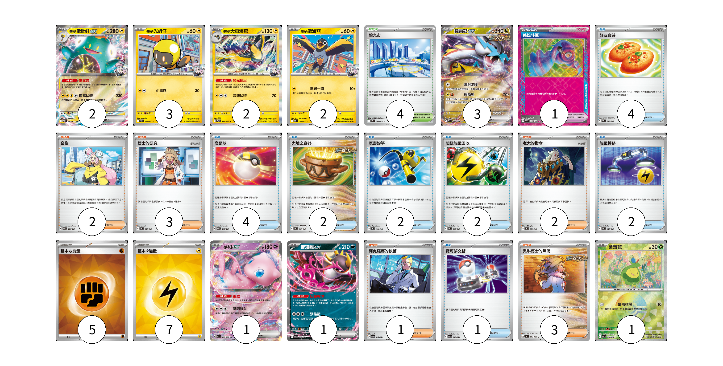 牌組構築方案 以此牌組為基礎新構築牌組 顯示卡面 顯示列表 寶可夢卡(15) 2 3 2 2 3 1 1 1 寶可夢道具(1) 1 物品卡(17) 4 4 2 2 2 2 1 支援者卡(11) 2 3 2 1 3 競技場卡(4) 4 能量卡(12) 5 7 寶可夢卡(15) 卡牌名稱 張數 卡牌名稱 張數 奇樹的電肚蛙ex SV9 030/100 02 奇樹的光蚪仔 SV9 029/100 03 奇樹的大電海燕 SV9 032/100 02 奇樹的電海燕 SV9 031/100 02 猛雷鼓ex SV5K 053/071 03 夢幻ex SV2a 151/165 01 吉雉雞ex SVOM 009/021 01 含羞苞 SV8a 001/187 01 寶可夢道具(1) 卡牌名稱 張數 卡牌名稱 張數 英雄斗篷 SV5M 064/071 01 物品卡(17) 卡牌名稱 張數 卡牌名稱 張數 好友寶芬 SVK 015/042 04 高級球 SVK 018/042 04 大地之容器 SVK 012/042 02 厲害釣竿 SVK 011/042 02 超級能量回收 SVK 010/042 02 能量轉移 SVK 008/042 02 寶可夢交替 SVOM 015/021 01 支援者卡(11) 卡牌名稱 張數 卡牌名稱 張數 奇樹 SVK 031/042 02 博士的研究 SVK 032/042 03 老大的指令 SVK 036/042 02 阿克羅瑪的執著 SVOM 017/021 01 奧琳博士的氣魄 SV4K 064/066 03 競技場卡(4) 卡牌名稱 張數 卡牌名稱 張數 釀光市 SV9 098/100 04 能量卡(12) 卡牌名稱 張數 卡牌名稱 張數 基本【鬥】能量 SVK FIG 05 基本【雷】能量 SVK LIG 07 以此牌組為基礎新構築牌組 牌組編碼 pdKSkJ-vwFqTg-ZwDATR copy 列印牌組單 牌組編碼已複製 分享至SNS
