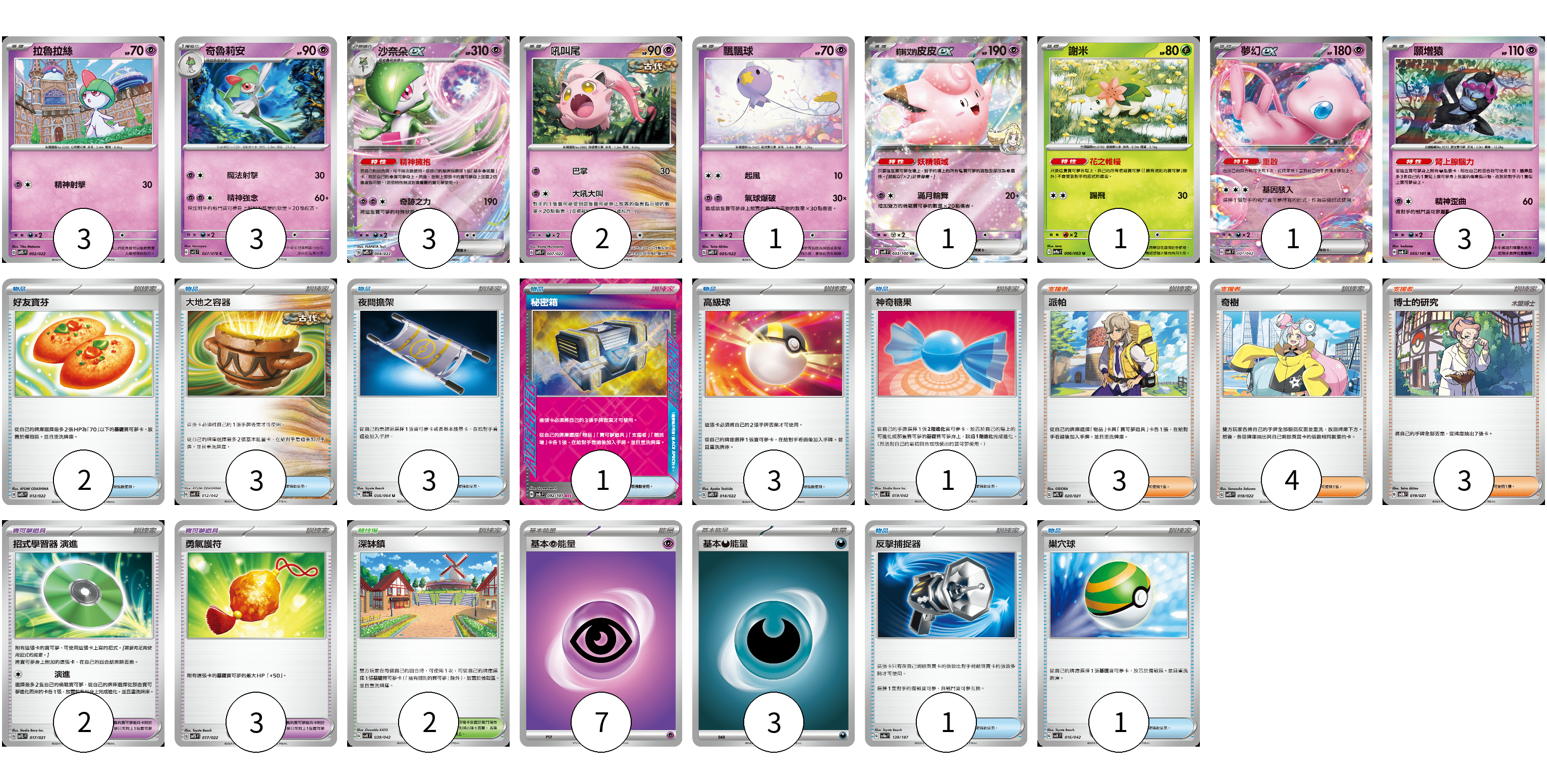 牌組構築方案 以此牌組為基礎新構築牌組 顯示卡面 顯示列表 寶可夢卡(18) 3 3 3 2 1 1 1 1 3 寶可夢道具(5) 2 3 物品卡(15) 2 3 3 1 3 1 1 1 支援者卡(10) 3 4 3 競技場卡(2) 2 能量卡(10) 7 3 寶可夢卡(18) 卡牌名稱 張數 卡牌名稱 張數 拉魯拉絲 SVTS 002/022 03 奇魯莉安 SV1S 027/078 03 沙奈朵ex SVTS 004/022 03 吼叫尾 SVTS 007/022 02 飄飄球 SVTS 005/022 01 莉莉艾的皮皮ex SV9 033/100 01 謝米 SV9a 006/063 01 夢幻ex SVK 001/042 01 願增猿 SV6 055/101 03 寶可夢道具(5) 卡牌名稱 張數 卡牌名稱 張數 招式學習器 演進 SVTL 017/021 02 勇氣護符 SVTS 017/022 03 物品卡(15) 卡牌名稱 張數 卡牌名稱 張數 好友寶芬 SVTS 012/022 02 大地之容器 SVK 012/042 03 夜間擔架 SV6a 056/064 03 秘密箱 SV6 092/101 01 高級球 SVTS 014/022 03 神奇糖果 SVK 019/042 01 反擊捕捉器 SV8a 139/187 01 巢穴球 SVK 016/042 01 支援者卡(10) 卡牌名稱 張數 卡牌名稱 張數 派帕 SVTL 020/021 03 奇樹 SVTS 018/022 04 博士的研究 SVOM 019/021 03 競技場卡(2) 卡牌名稱 張數 卡牌名稱 張數 深缽鎮 SVK 039/042 02 能量卡(10) 卡牌名稱 張數 卡牌名稱 張數 基本【超】能量 SVTS PSY 07 基本【惡】能量 SVF DAR 03 以此牌組為基礎新構築牌組 牌組編碼 pfCyws-eEJKjs-QGcOqk copy 列印牌組單 牌組編碼已複製 分享至SNS