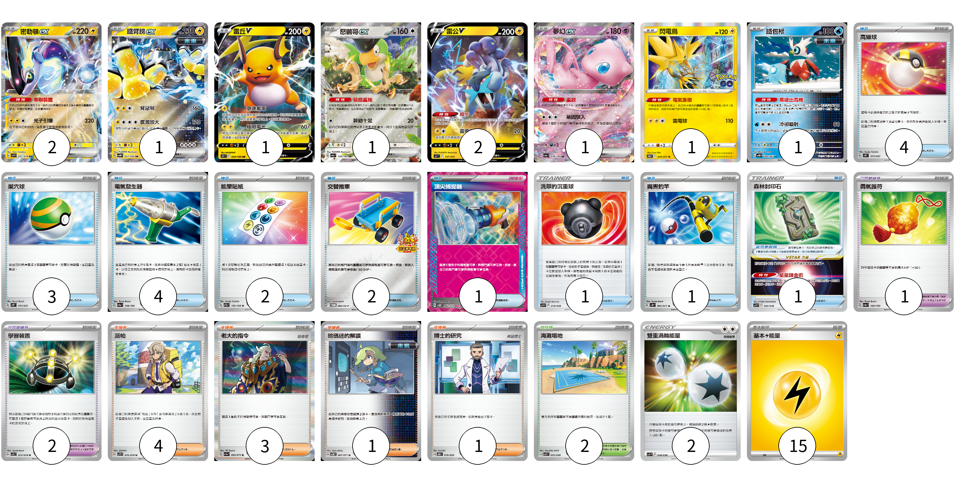 牌組構築方案 以此牌組為基礎新構築牌組 顯示卡面 顯示列表 寶可夢卡(10) 2 1 1 1 2 1 1 1 寶可夢道具(3) 1 2 物品卡(19) 4 3 4 2 2 1 1 1 1 支援者卡(9) 4 3 1 1 競技場卡(2) 2 能量卡(17) 2 15 寶可夢卡(10) 卡牌名稱 張數 卡牌名稱 張數 密勒頓ex SV1V 037/078 02 鐵臂膀ex SV4M 027/066 01 雷丘V S9 034/100 01 怒鸚哥ex SV4a 154/190 01 雷公V SI 137/414 02 夢幻ex SV4a 076/190 01 閃電鳥 S10b 029/071 01 鐵包袱 SV4M 020/066 01 寶可夢道具(3) 卡牌名稱 張數 卡牌名稱 張數 勇氣護符 SV4a 169/190 01 學習裝置 SV1S 072/078 02 物品卡(19) 卡牌名稱 張數 卡牌名稱 張數 高級球 SVHK 013/022 04 巢穴球 SVHK 012/022 03 電氣發生器 SV4a 156/190 04 能量貼紙 SV2a 152/165 02 交替推車 SV-P 082/SV-P 02 頂尖捕捉器 SV5M 062/071 01 洗翠的沉重球 SVF 019/038 01 厲害釣竿 SV2P 066/071 01 森林封印石 SVF 024/038 01 支援者卡(9) 卡牌名稱 張數 卡牌名稱 張數 派帕 SV1V 076/078 04 老大的指令 SV1a 069/073 03 暗碼迷的解讀 SV5M 067/071 01 博士的研究 SVEM 019/020 01 競技場卡(2) 卡牌名稱 張數 卡牌名稱 張數 海灘場地 SVF 035/038 02 能量卡(17) 卡牌名稱 張數 卡牌名稱 張數 雙重渦輪能量 SVF 038/038 02 基本【雷】能量 SVF LIG 15 以此牌組為基礎新構築牌組 牌組編碼 pjRvOy-OdtvIc-sfzhCr copy 列印牌組單 牌組編碼已複製 分享至SNS